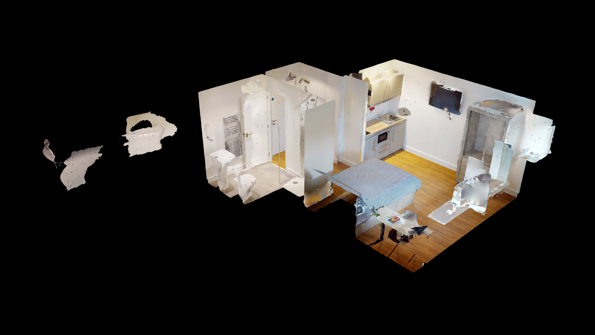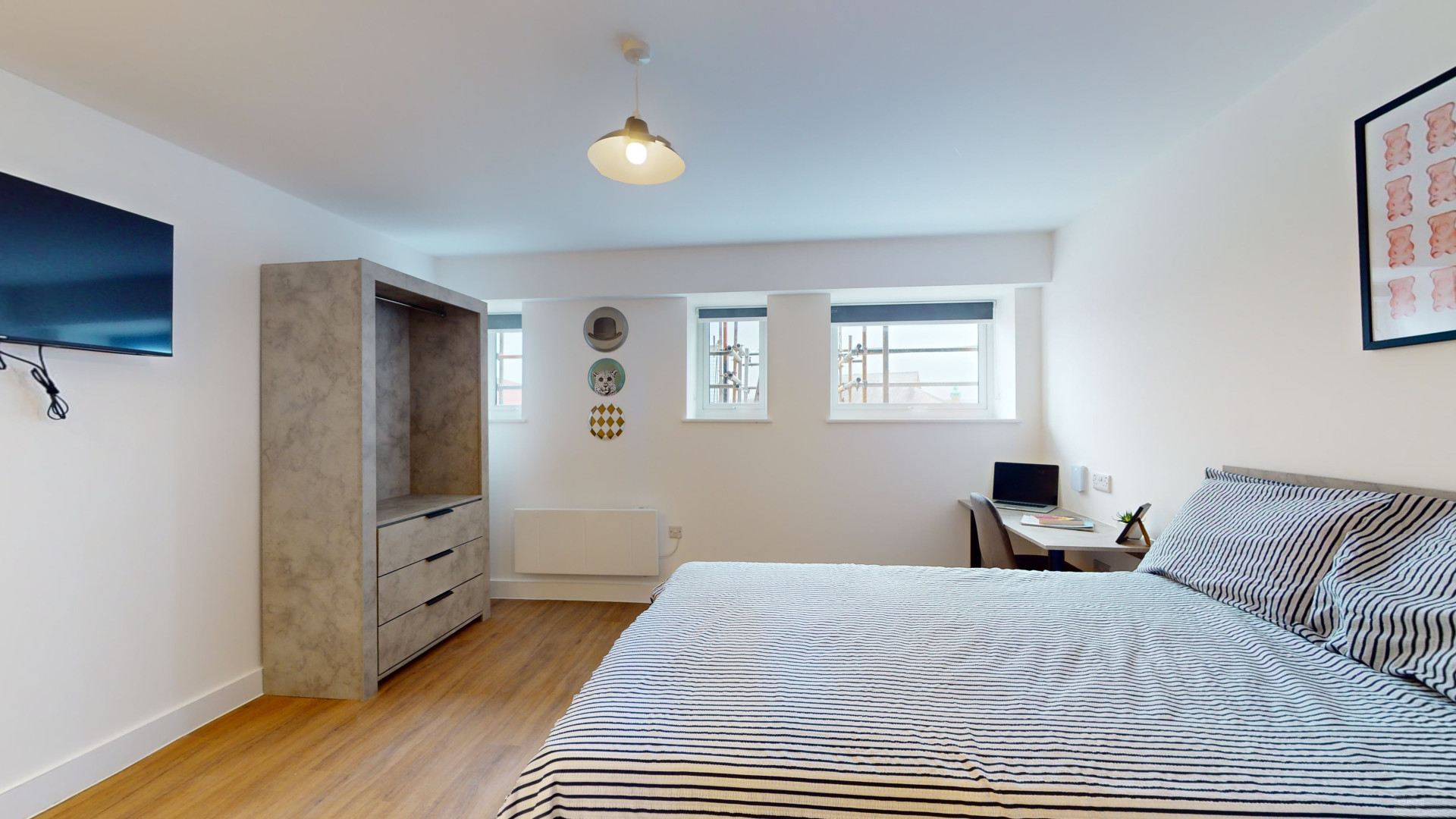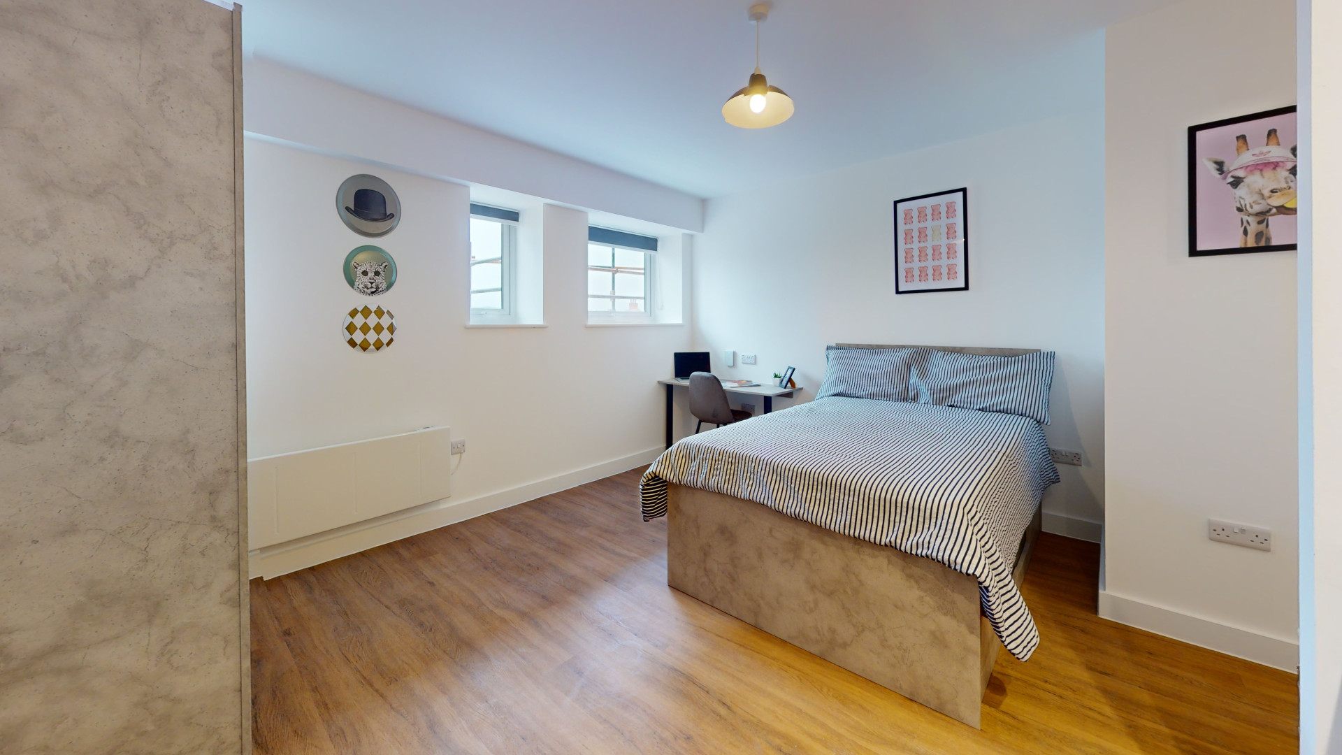 - Bedroom furniture: bed, desk, desk chair, wardrobe, and drawers