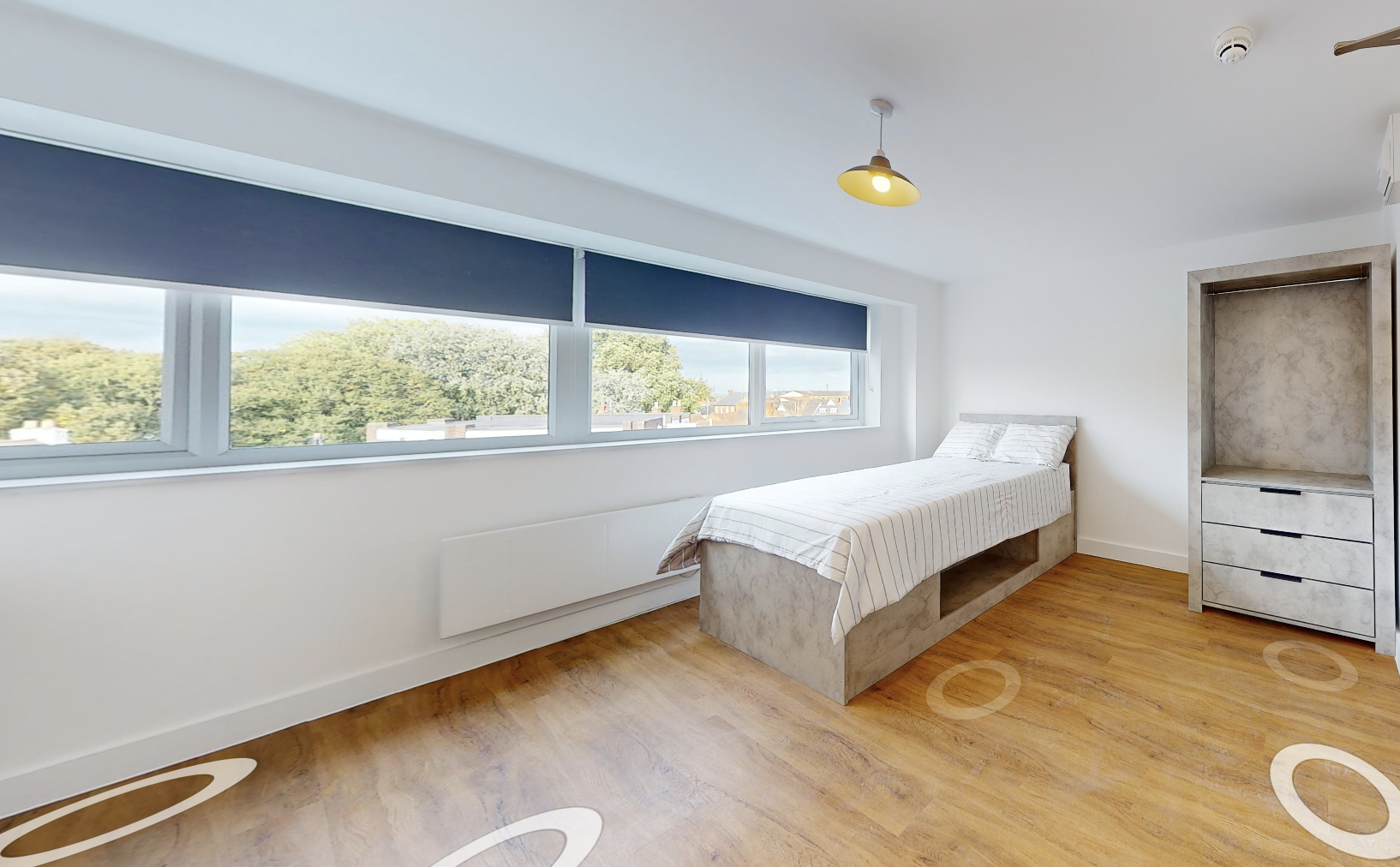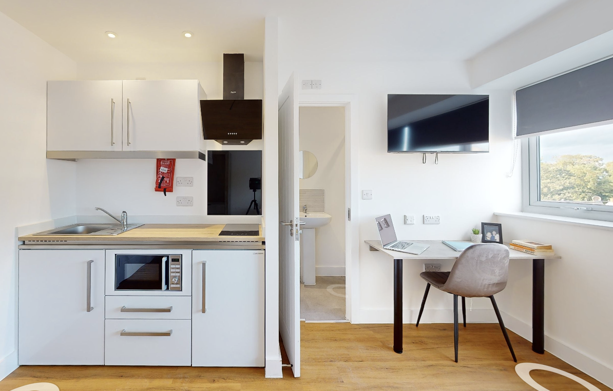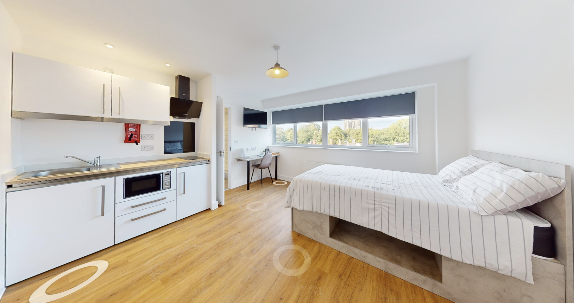 The studio offers a fully self-contained living space complete with an ensuite bathroom and a fully equipped kitchen, ensuring students have everything they need at their fingertips. Its prime location in the town centre places Tesco right next door, making grocery runs quick and hassle-free. Residents can also maintain an active lifestyle with the convenience of an onsite gym, while secure bike storage facilities provide peace of mind by protecting bicycles from potential theft or damage.