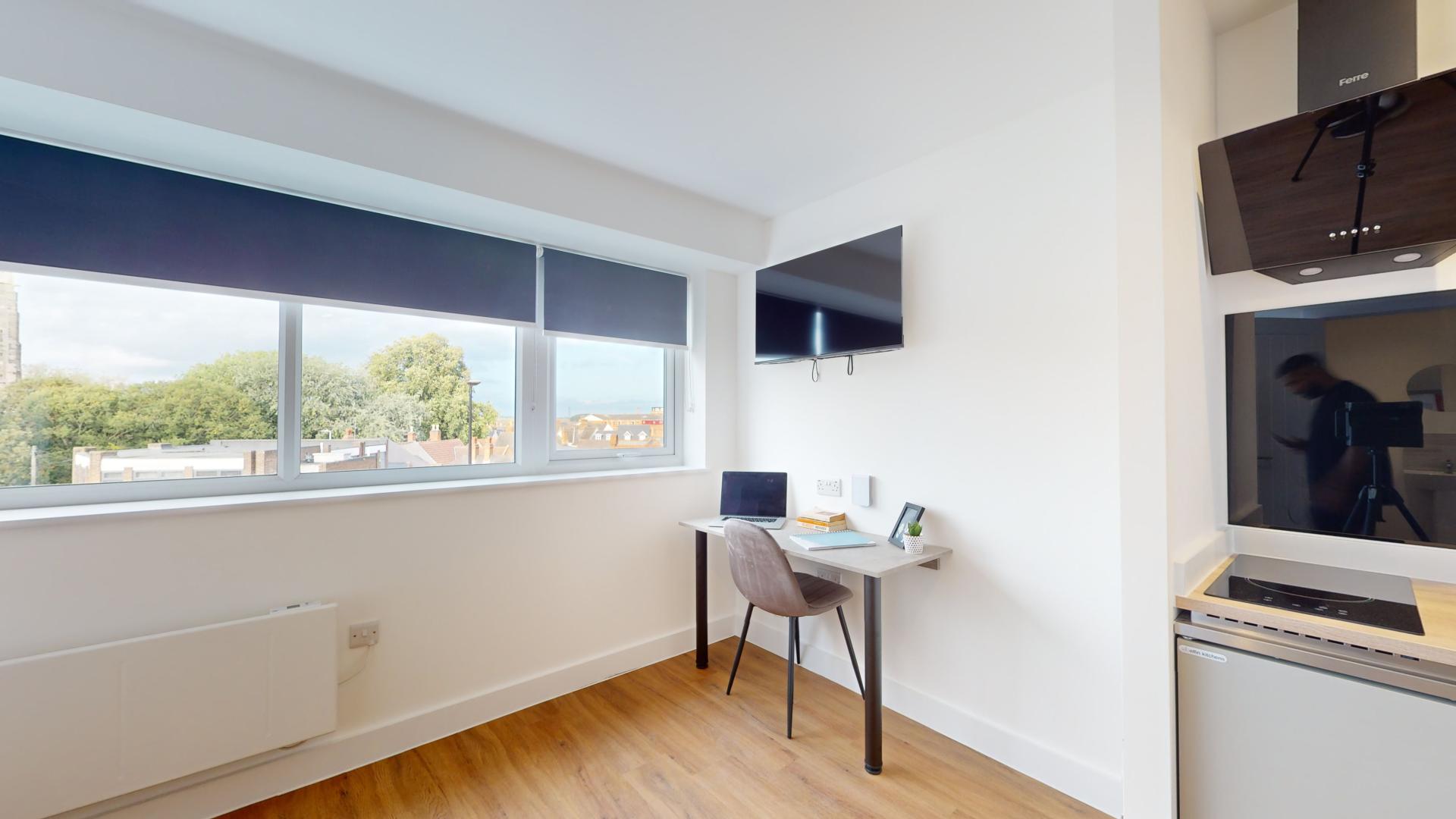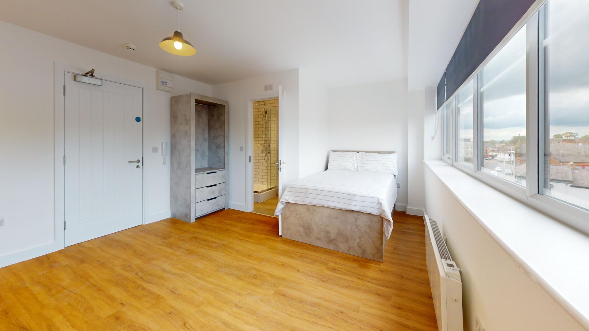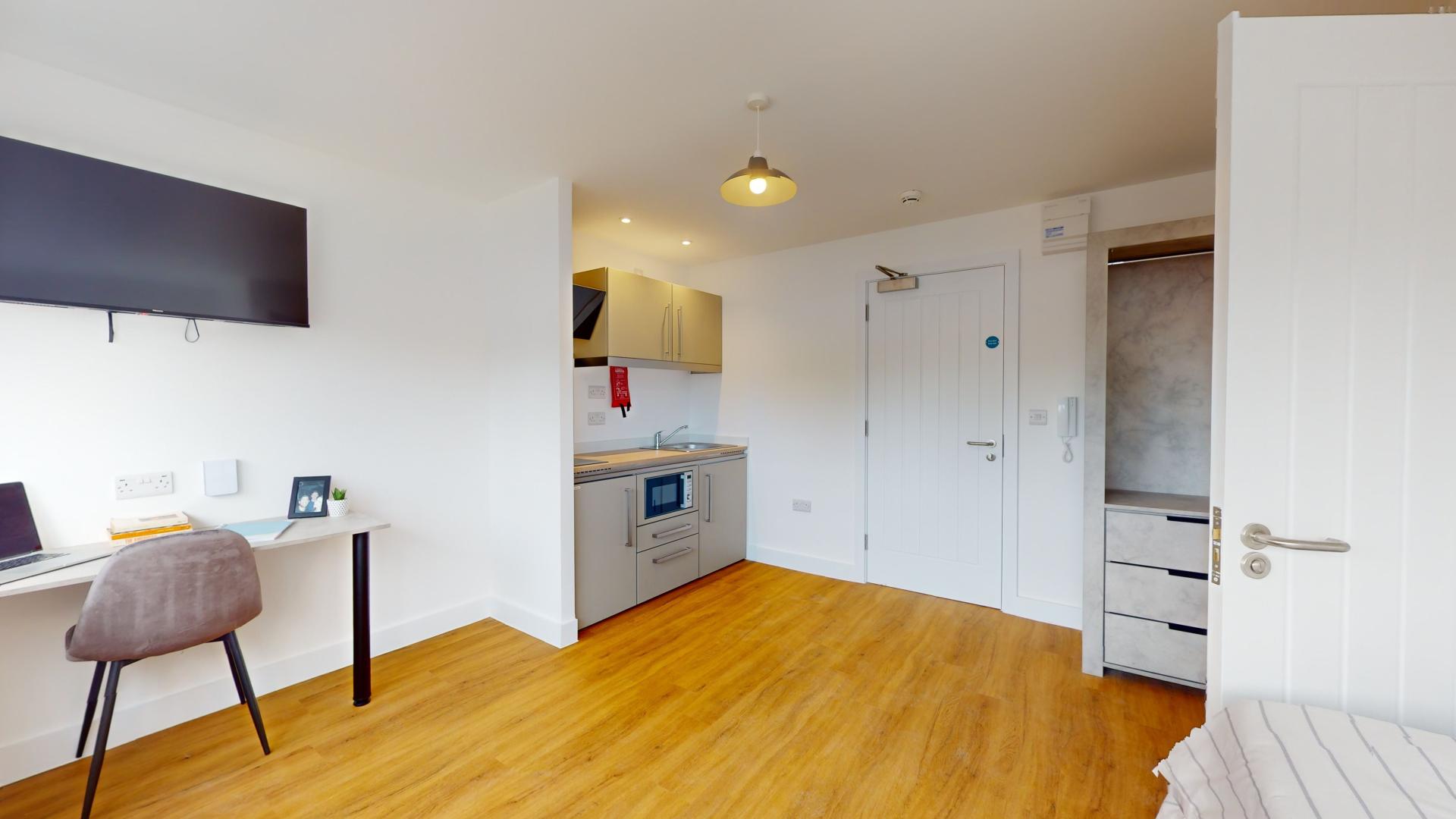 The studio offers a fully self-contained living space complete with an ensuite bathroom and a fully equipped kitchen, ensuring students have everything they need at their fingertips. Its prime location in the town centre places Tesco right next door, making grocery runs quick and hassle-free. Residents can also maintain an active lifestyle with the convenience of an onsite gym, while secure bike storage facilities provide peace of mind by protecting bicycles from potential theft or damage.