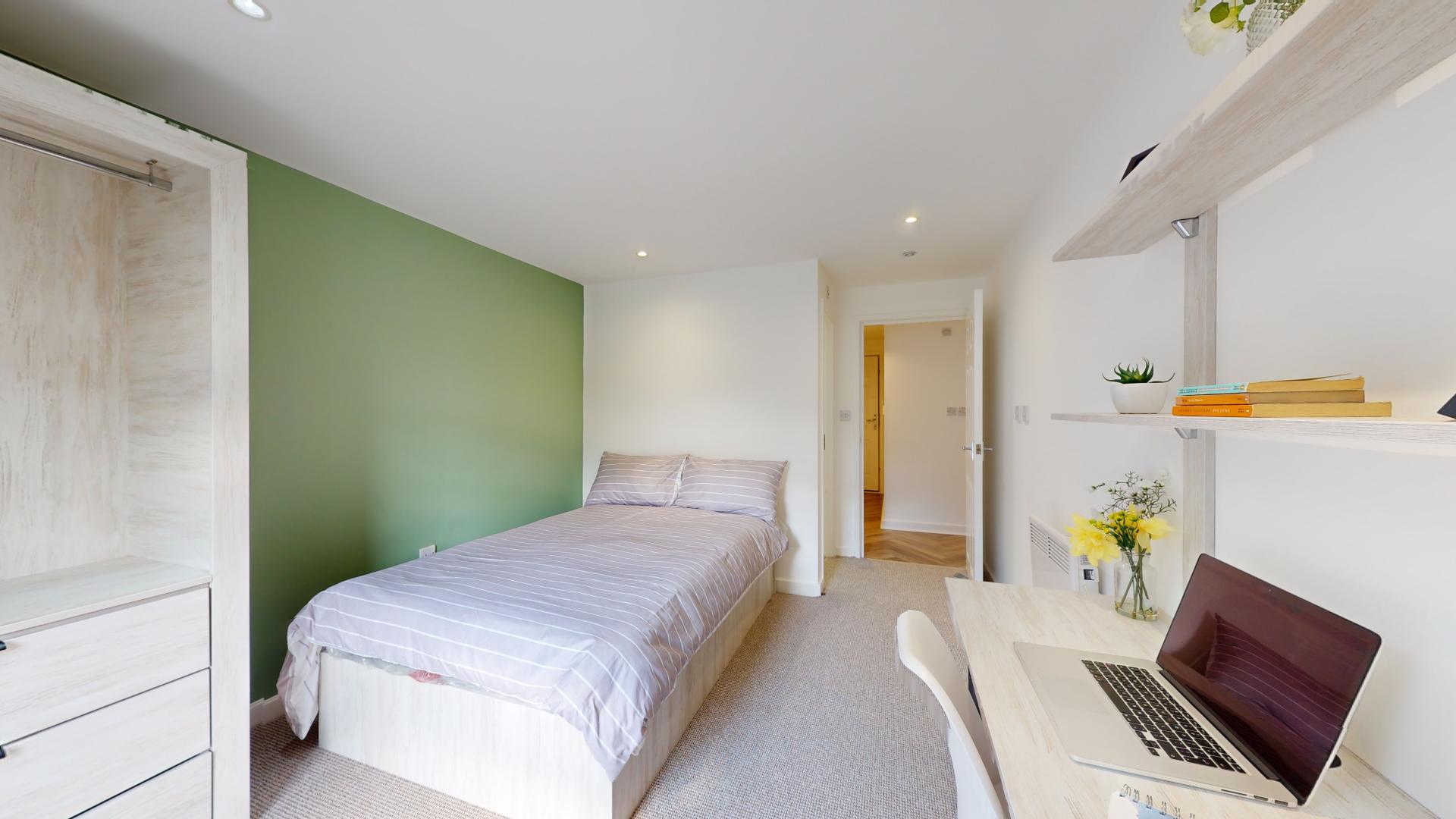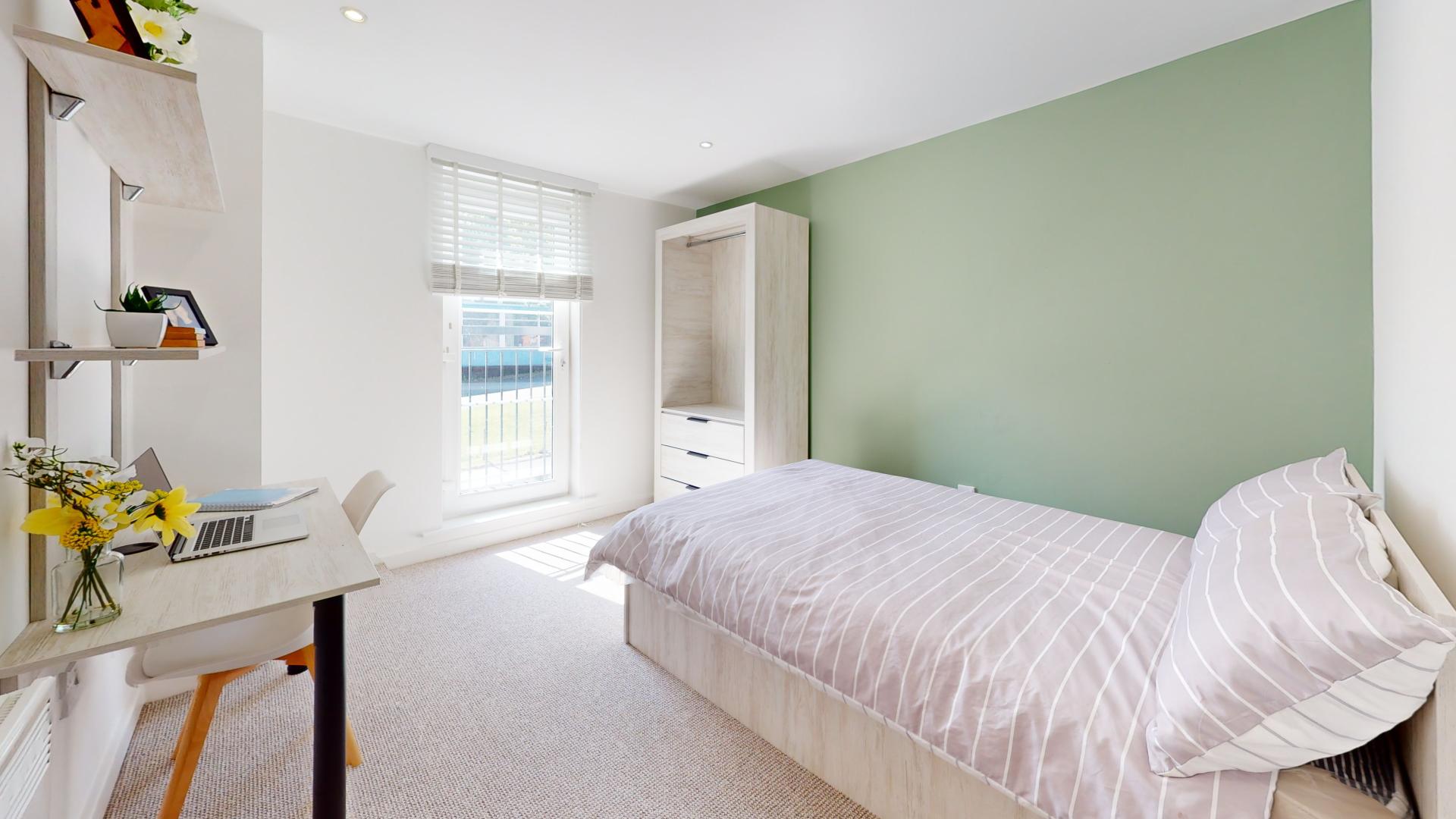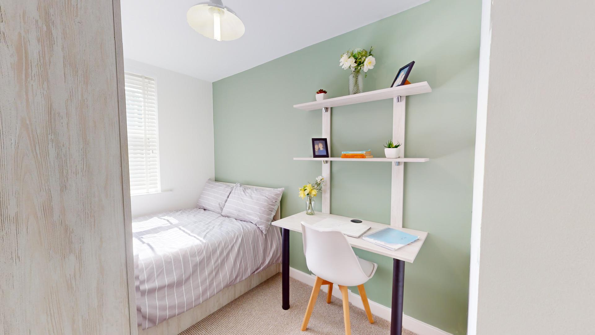 - Bedroom furniture: bed, desk, desk chair, wardrobe, and drawers