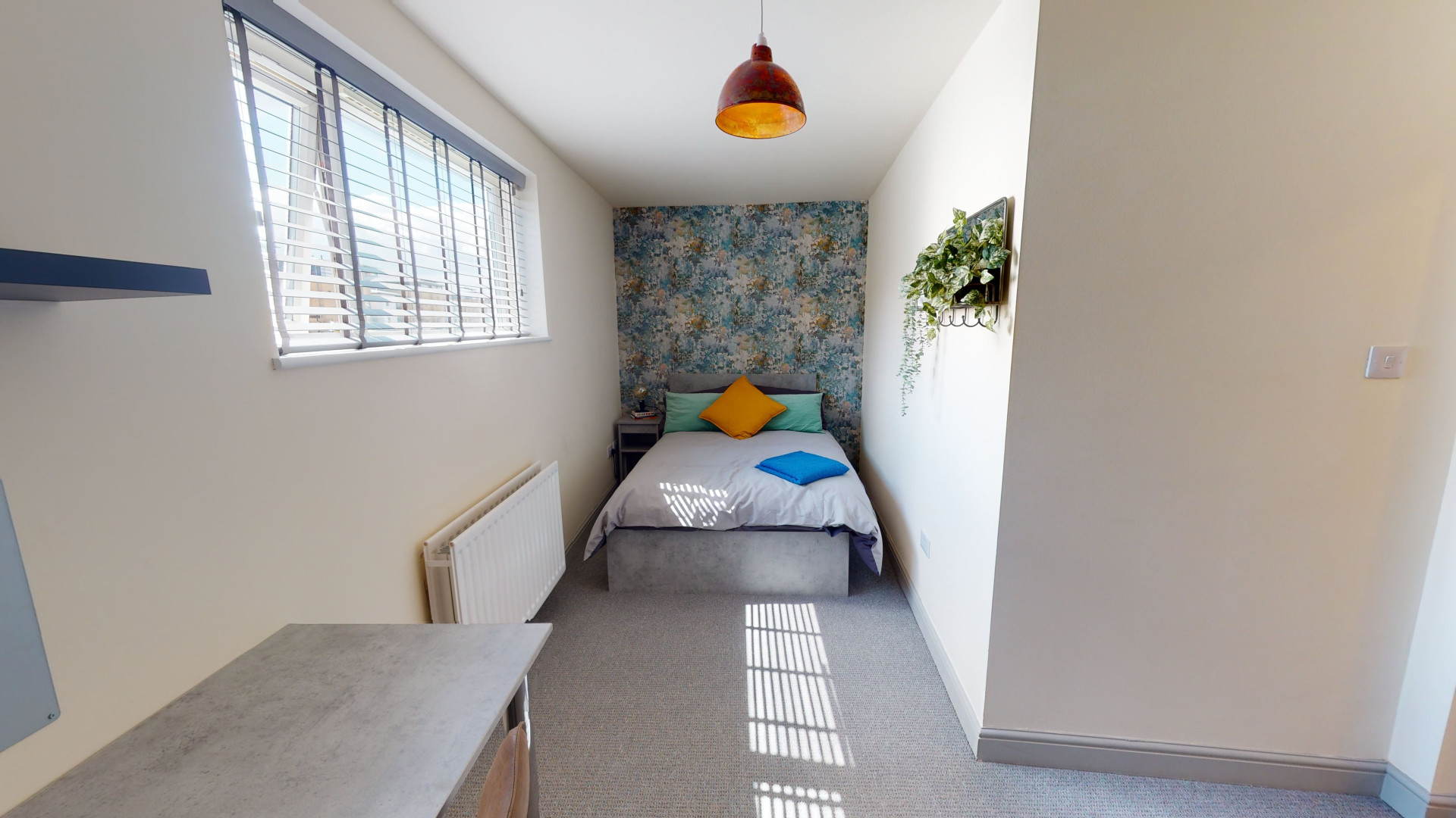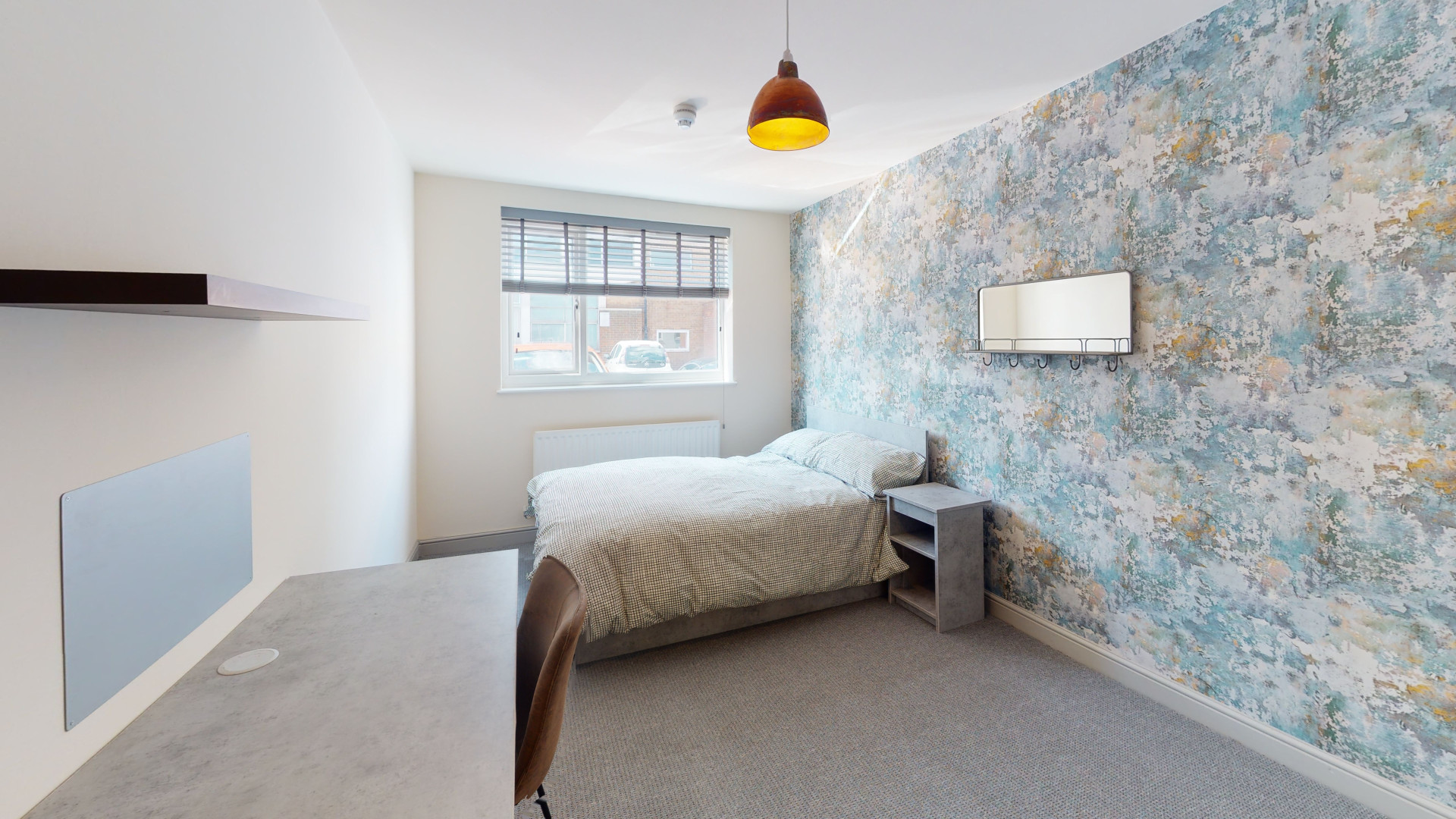 - Bedroom furniture: bed, desk, desk chair, wardrobe, and drawers