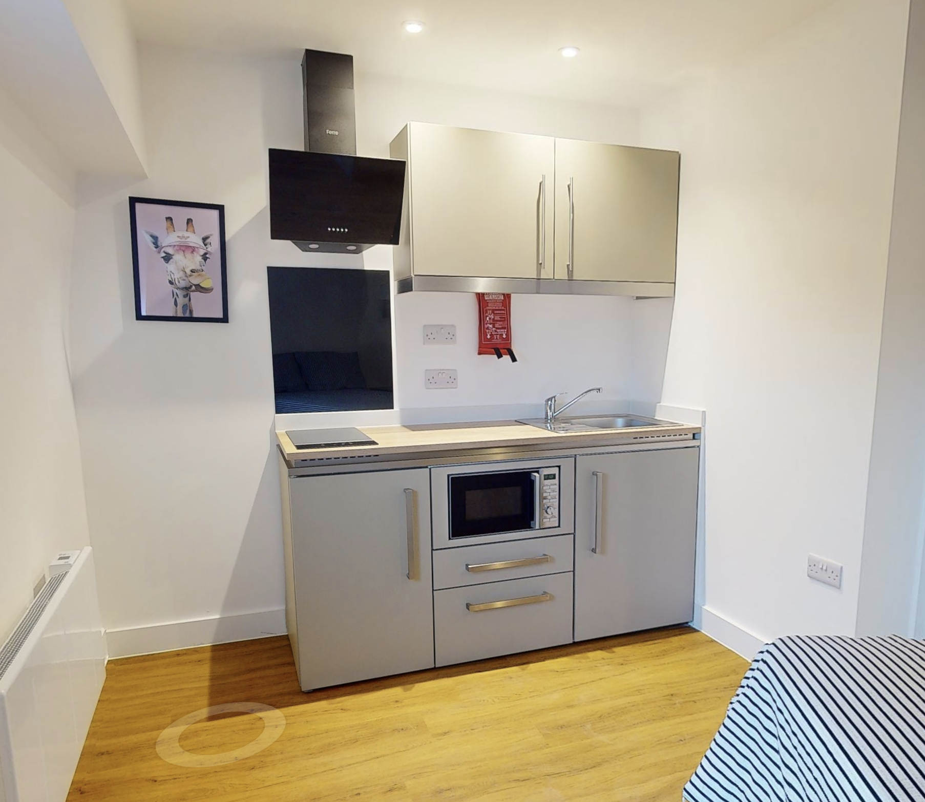 The studio offers a fully self-contained living space complete with an ensuite bathroom and a fully equipped kitchen, ensuring students have everything they need at their fingertips. Its prime location in the town centre places Tesco right next door, making grocery runs quick and hassle-free. Residents can also maintain an active lifestyle with the convenience of an onsite gym, while secure bike storage facilities provide peace of mind by protecting bicycles from potential theft or damage.