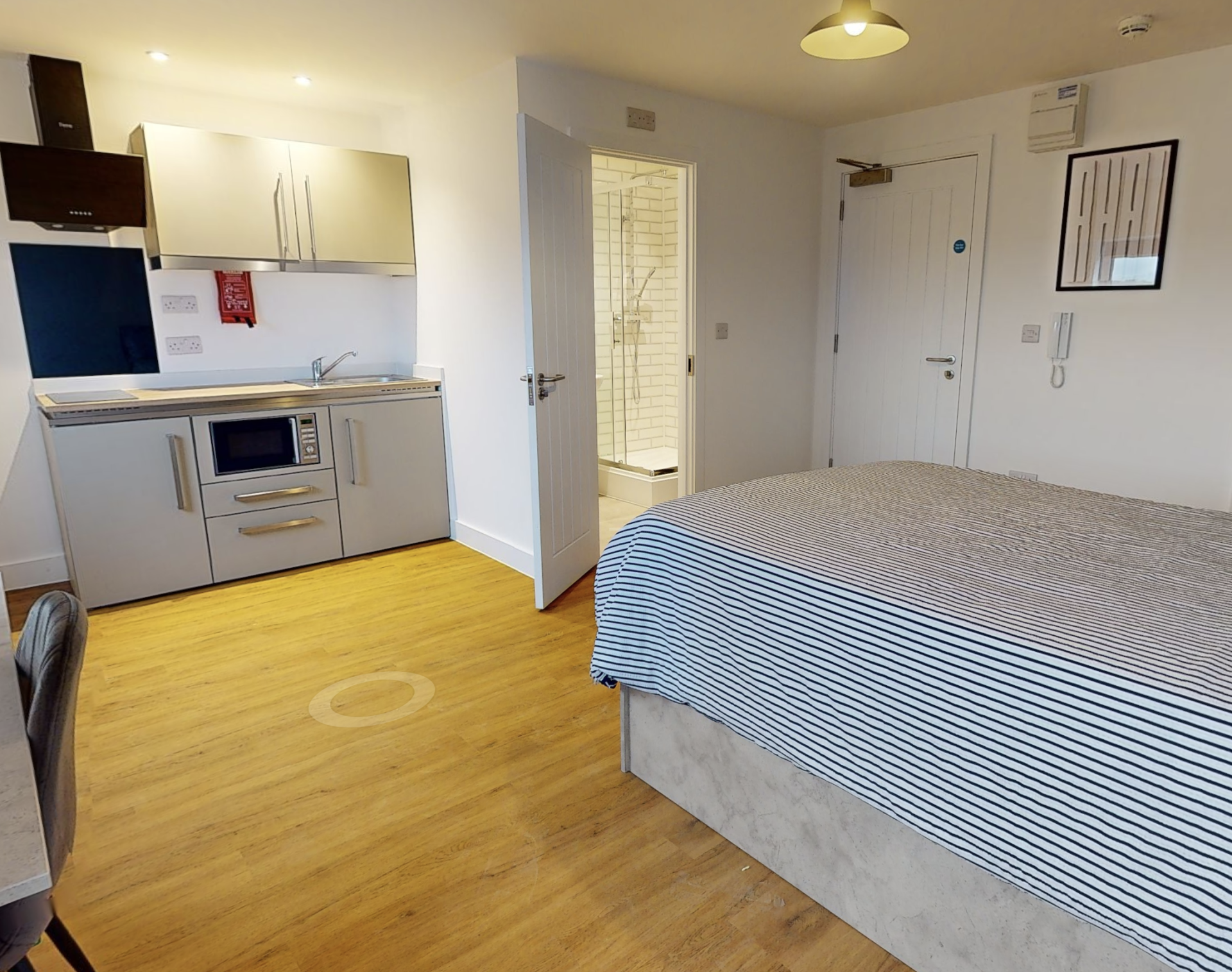 The studio offers a fully self-contained living space complete with an ensuite bathroom and a fully equipped kitchen, ensuring students have everything they need at their fingertips. Its prime location in the town centre places Tesco right next door, making grocery runs quick and hassle-free. Residents can also maintain an active lifestyle with the convenience of an onsite gym, while secure bike storage facilities provide peace of mind by protecting bicycles from potential theft or damage.