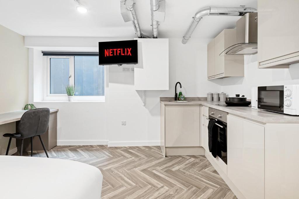 The versatile living area seamlessly blends a study space with a comfortable living zone, complemented by a sleek, contemporary bathroom. Just a short walk from universities, libraries, cafes, and entertainment venues, this flat offers the perfect combination of city living and academic convenience. Tailored for student life, utilities are included.