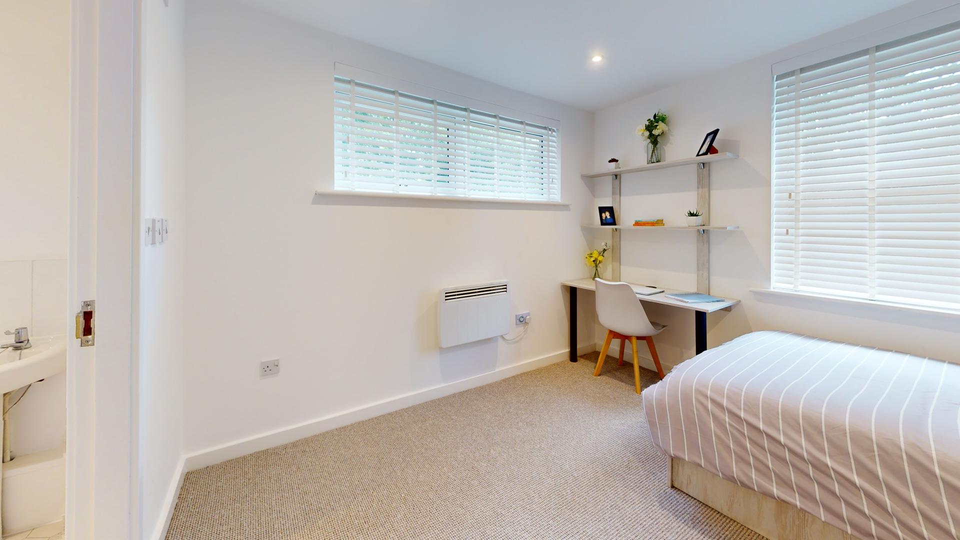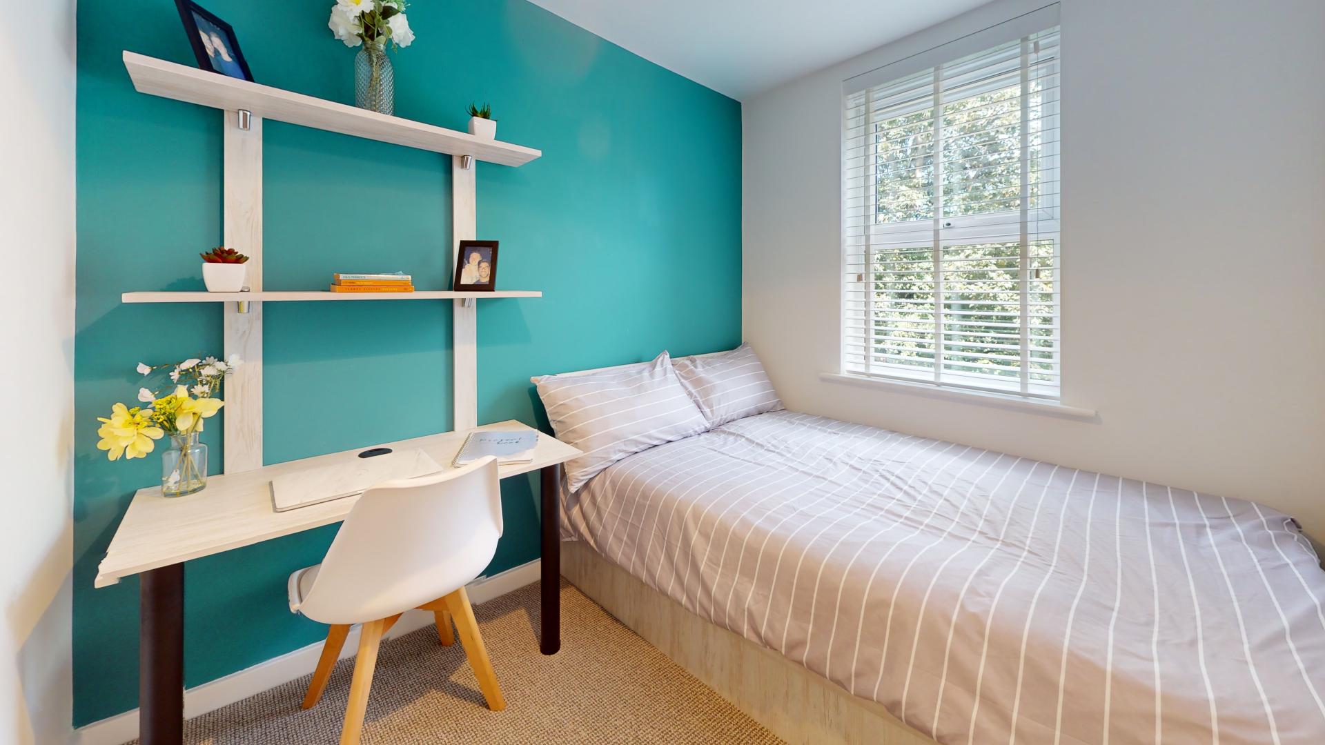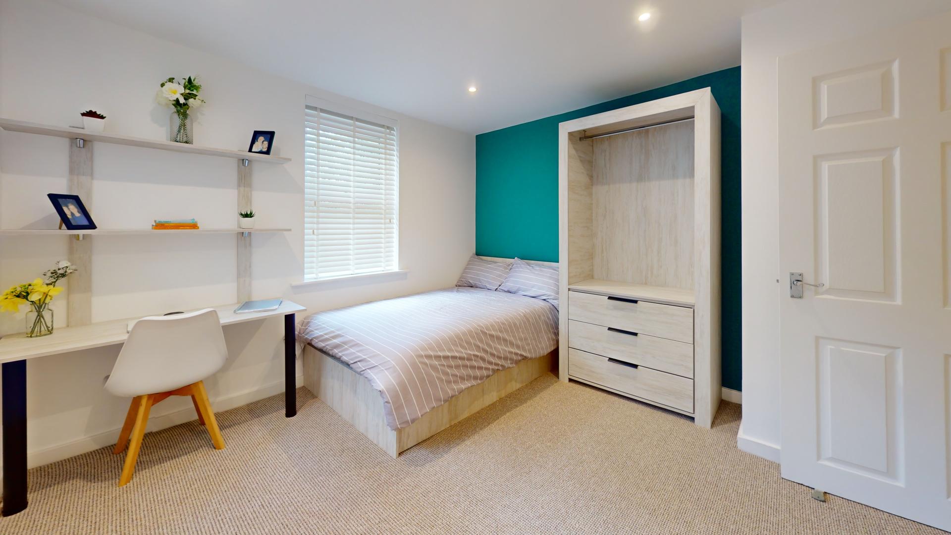 - Bedroom furniture: bed, desk, desk chair, wardrobe, and drawers