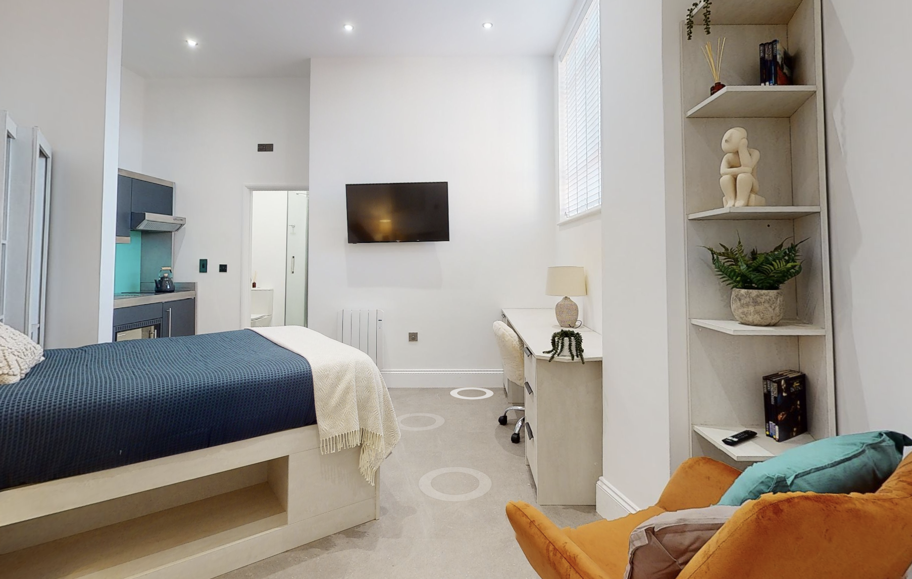 The studio offers a fully self-contained living space complete with an ensuite bathroom and a fully equipped kitchen, ensuring students have everything they need at their fingertips. Its prime location in the town centre places Tesco right next door, making grocery runs quick and hassle-free. Residents can also maintain an active lifestyle with the convenience of an onsite gym, while secure bike storage facilities provide peace of mind by protecting bicycles from potential theft or damage.