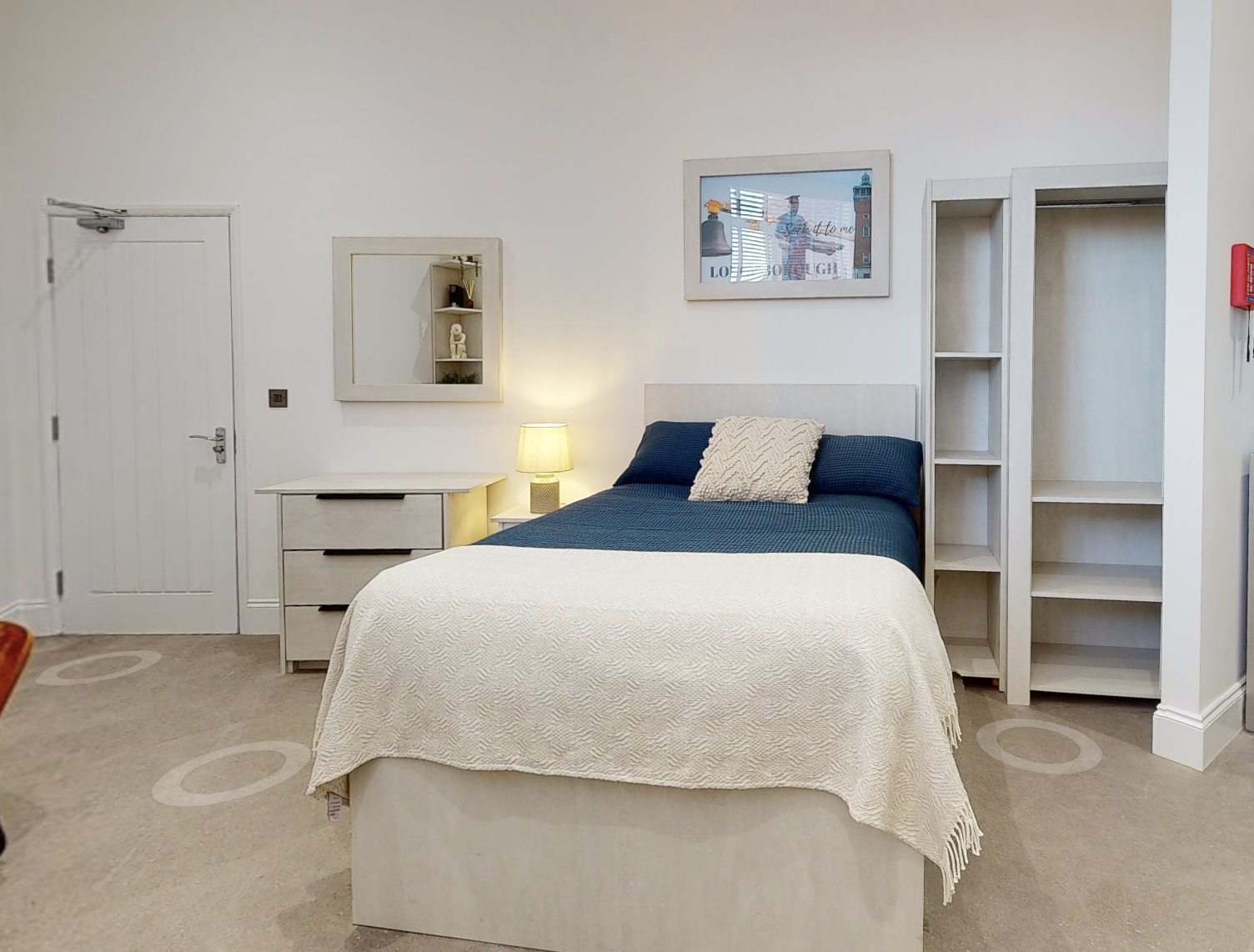 - Bedroom furniture: bed, desk, desk chair, wardrobe, and drawers