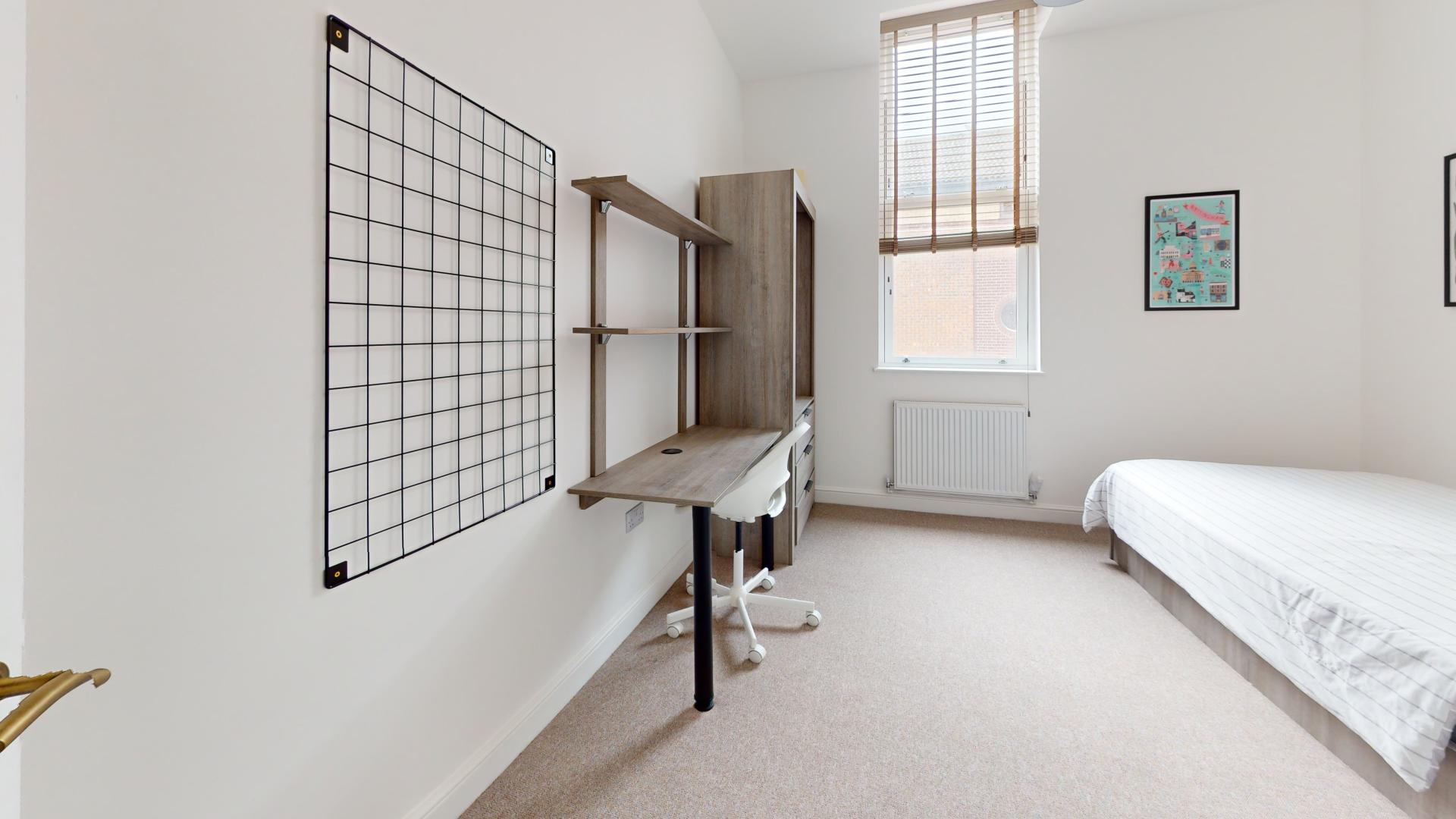 - Bedroom furniture: bed, desk, desk chair, wardrobe, and drawers