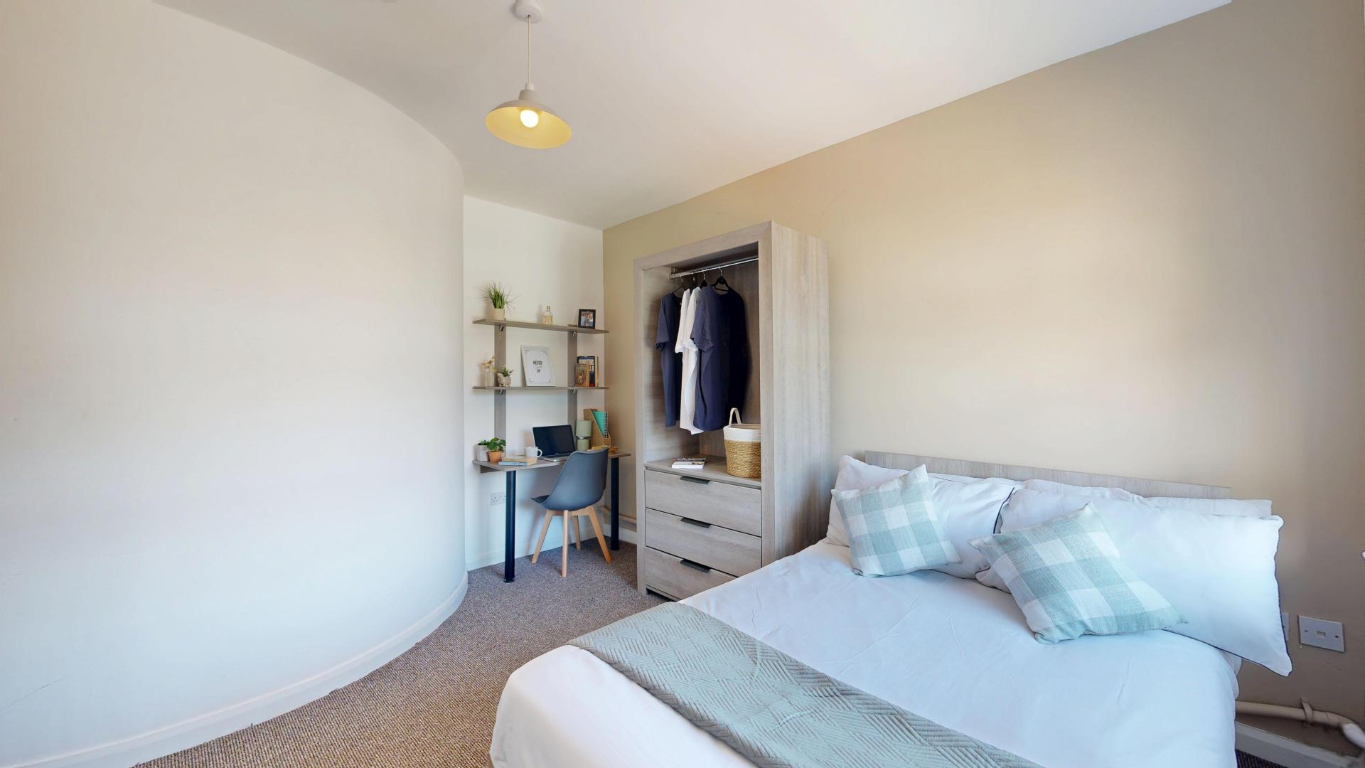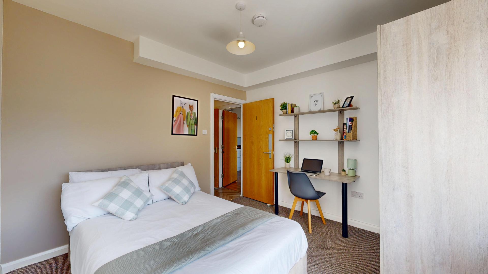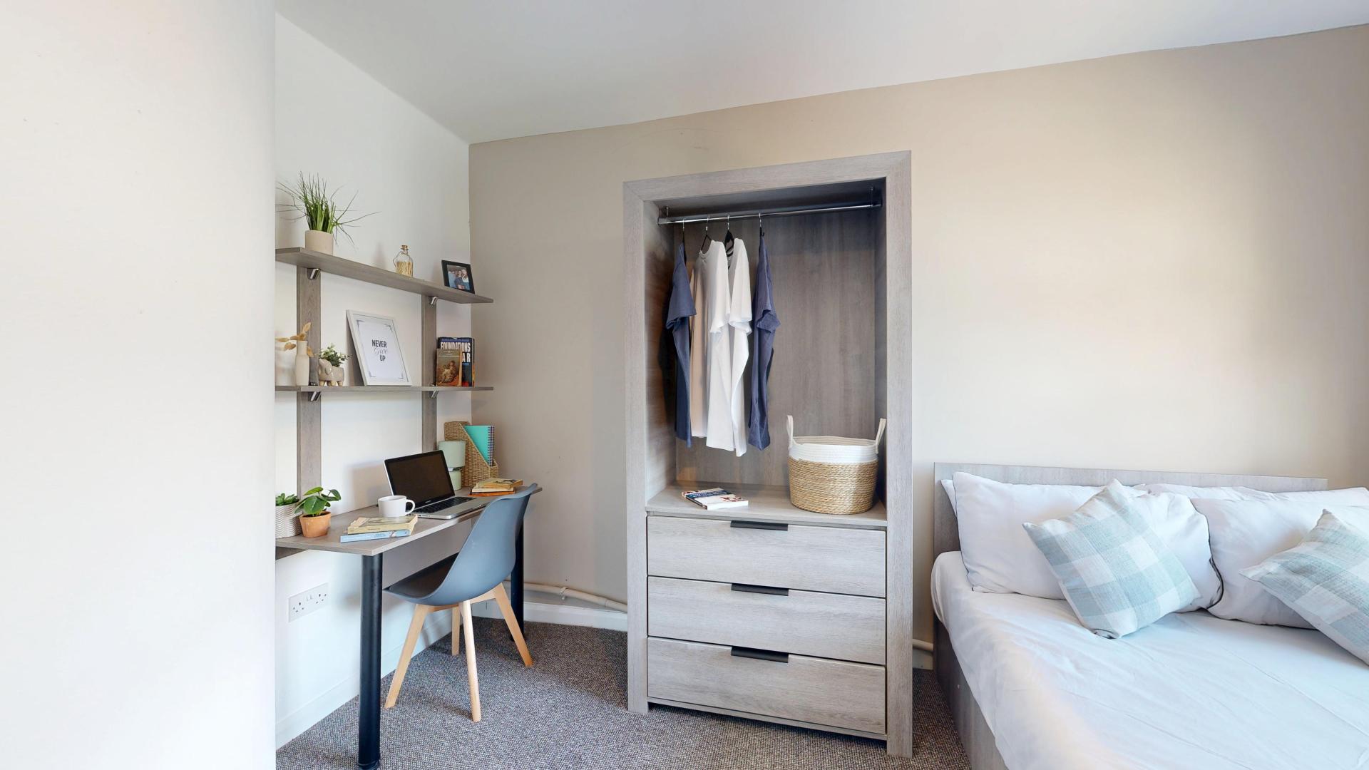 - Bedroom furniture: bed, desk, desk chair, wardrobe, and drawers