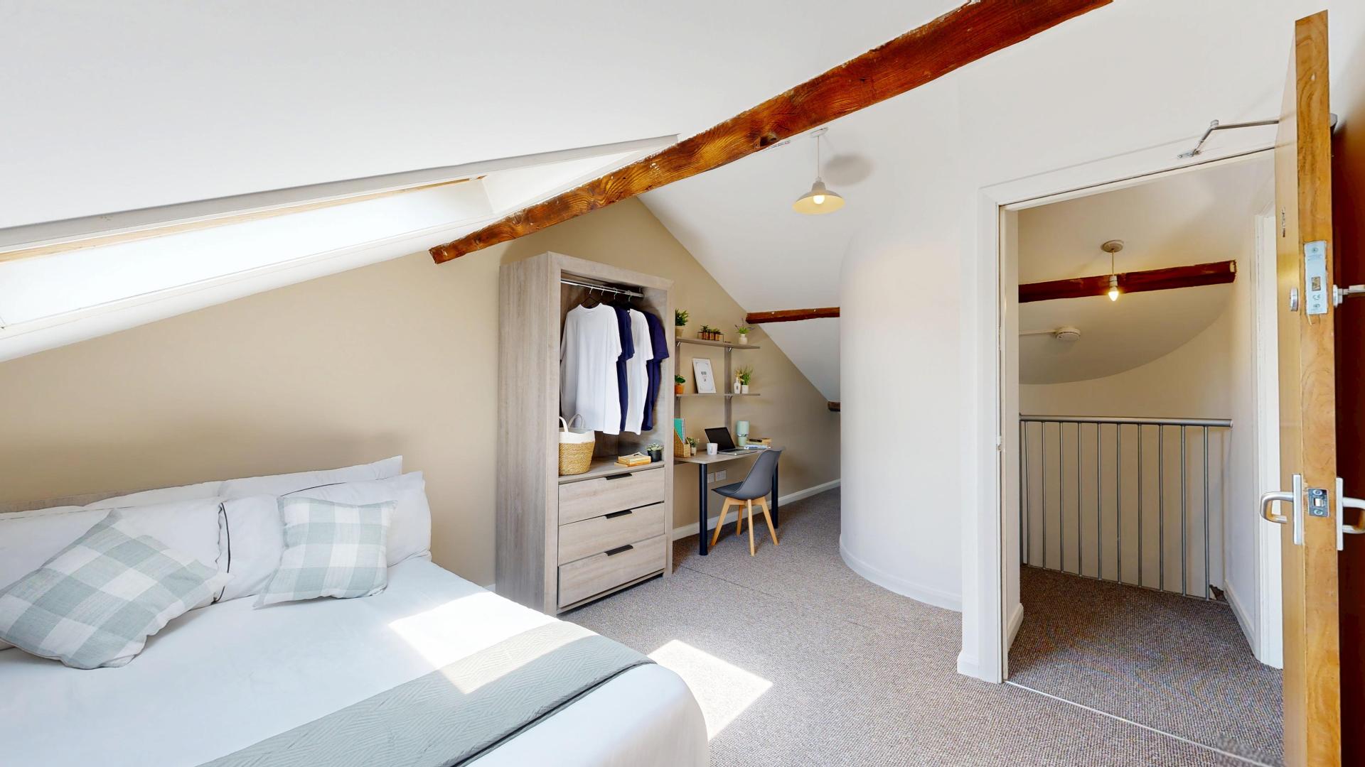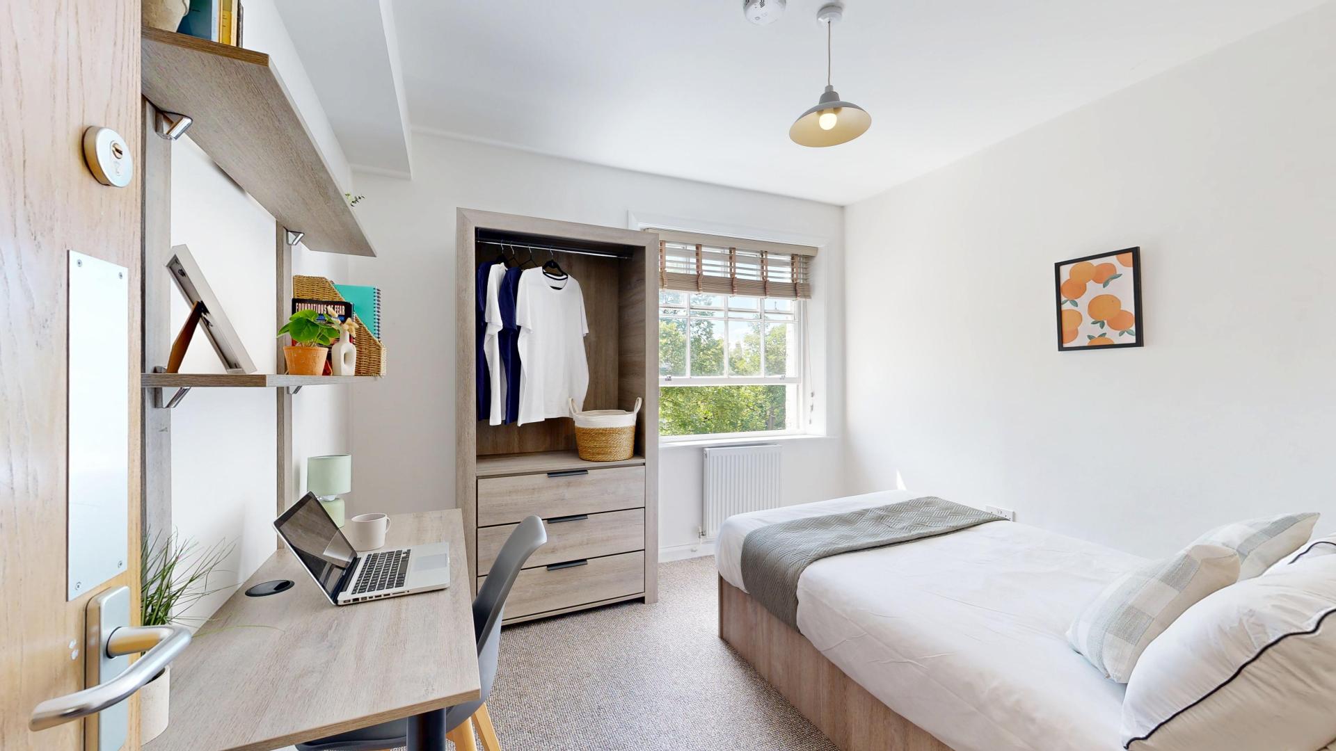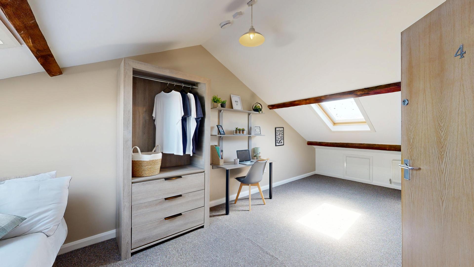 - Bedroom furniture: bed, desk, desk chair, wardrobe, and drawers