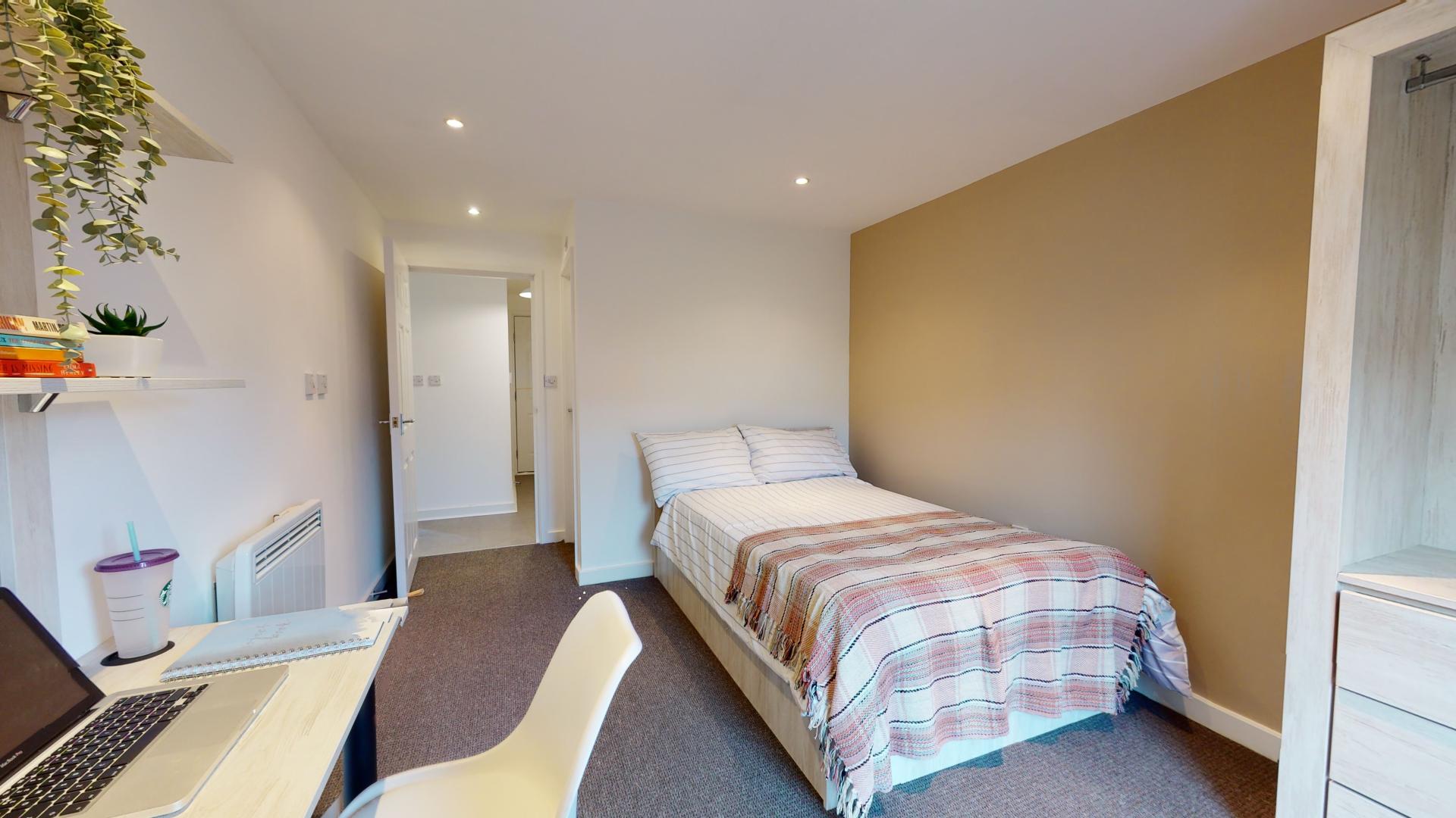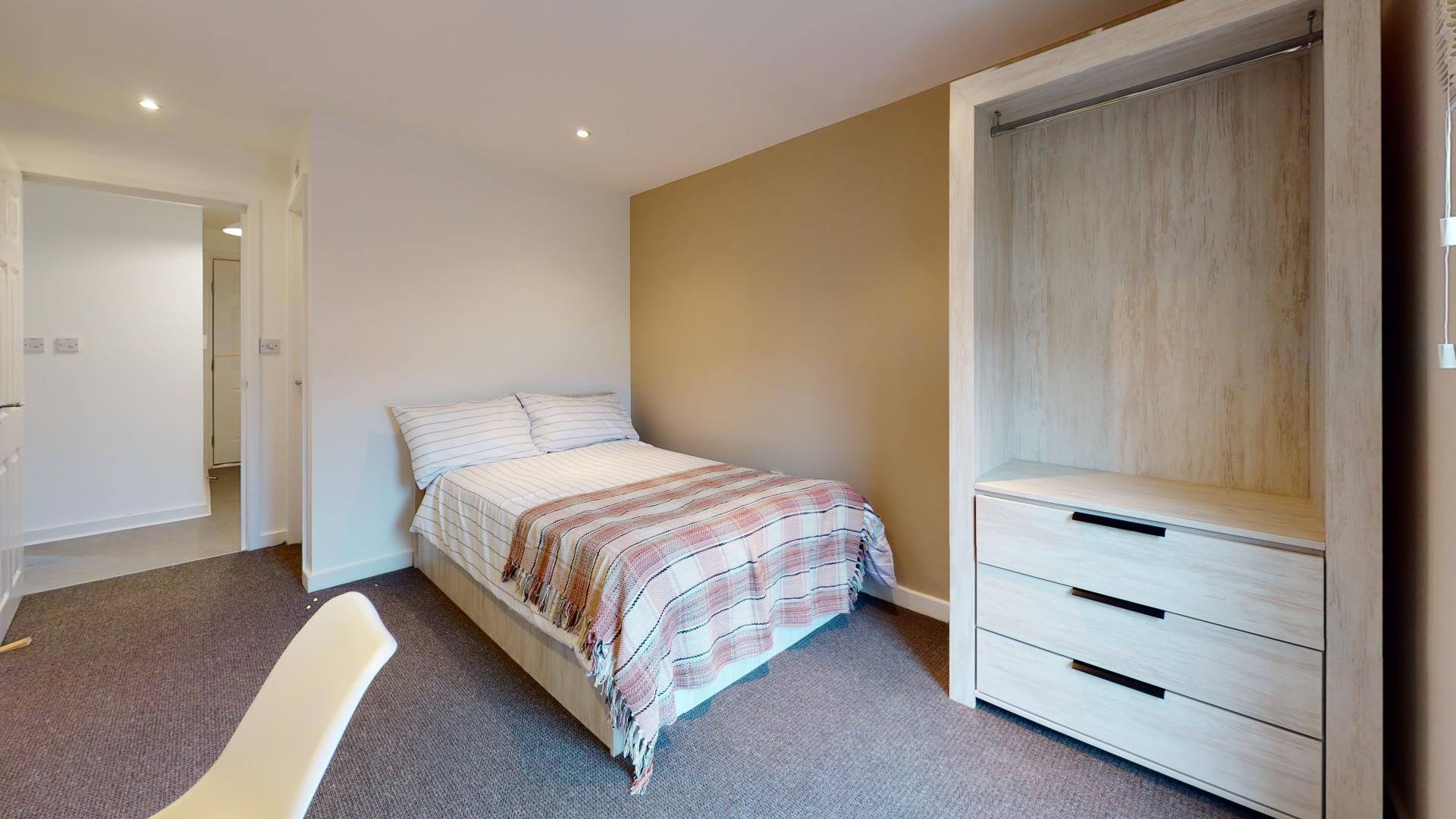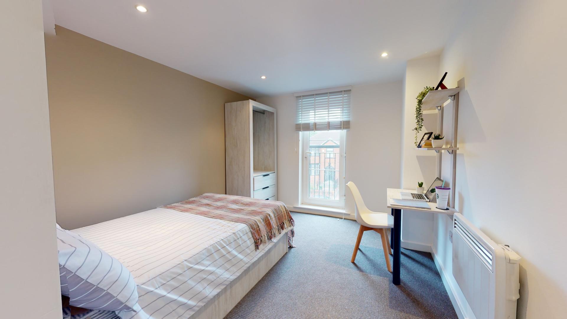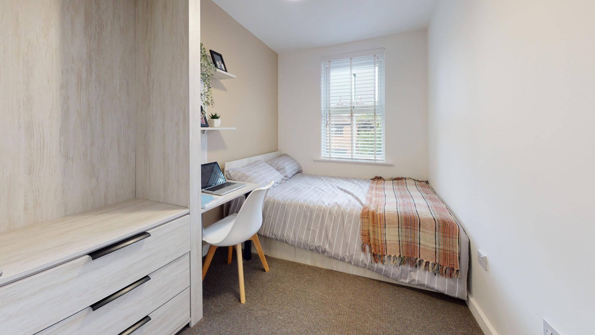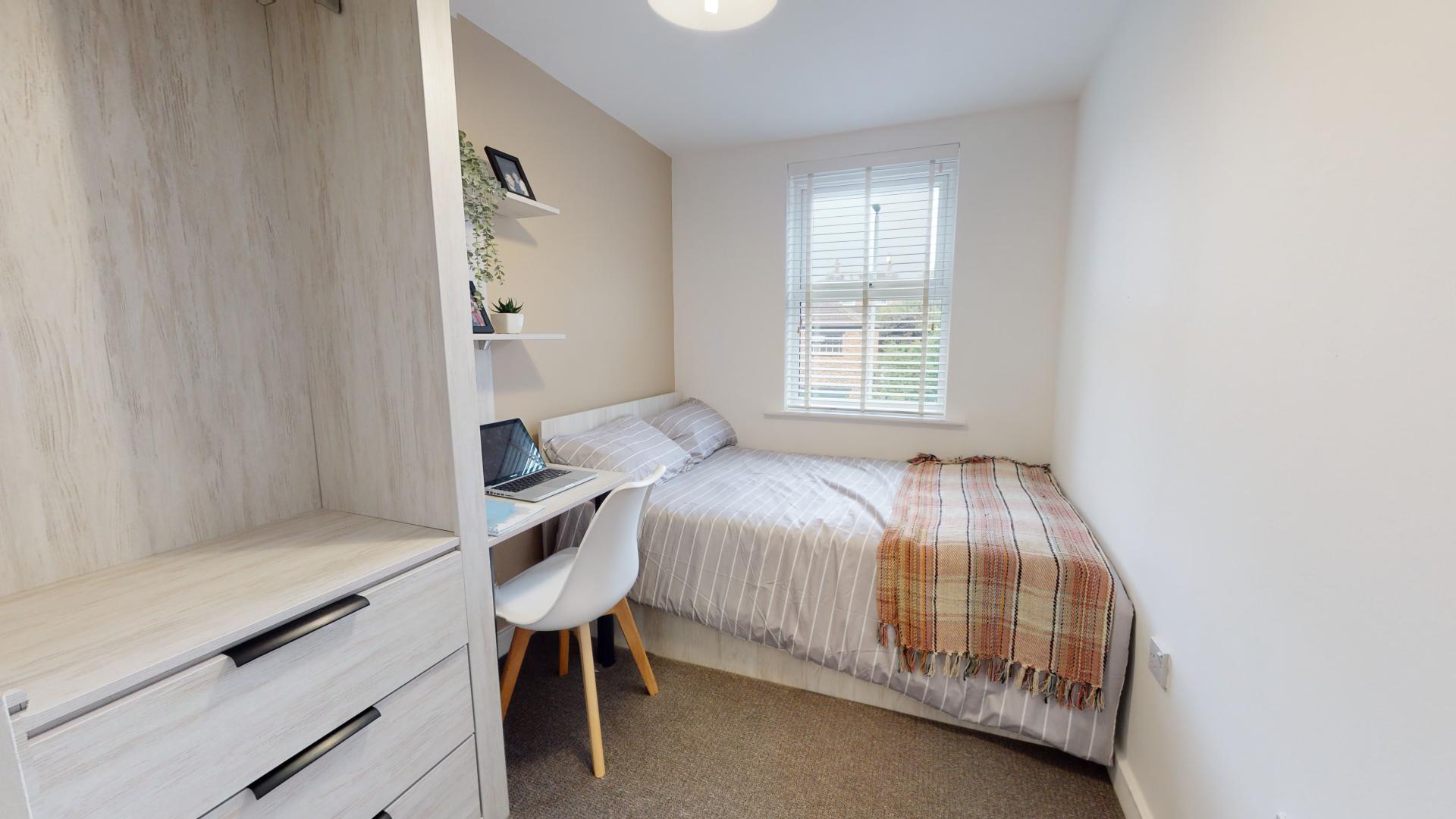 - Bedroom furniture: bed, desk, desk chair, wardrobe, and drawers