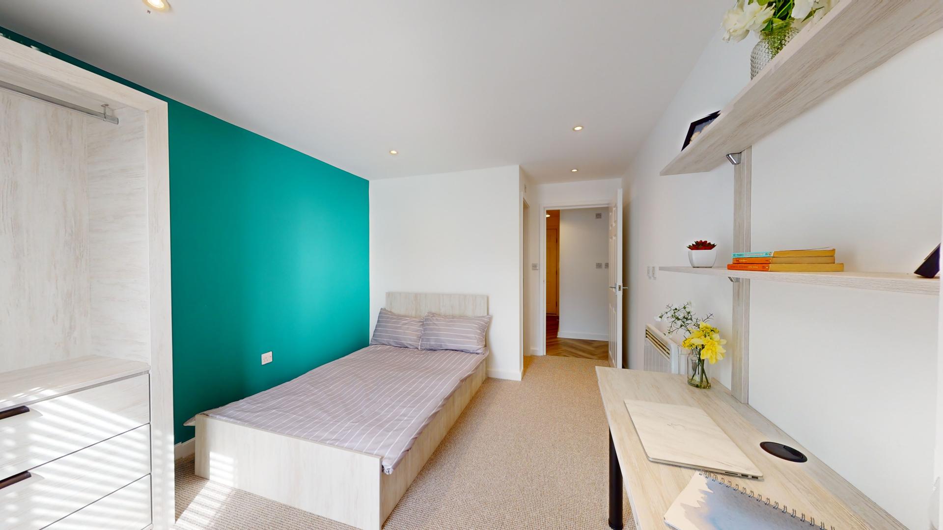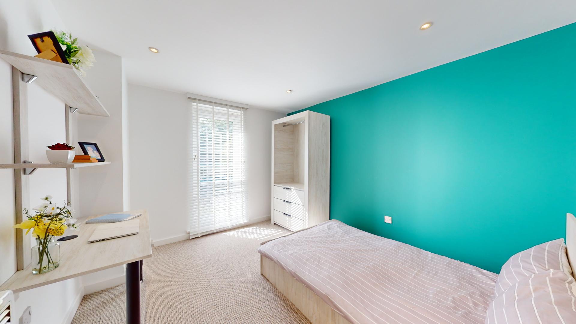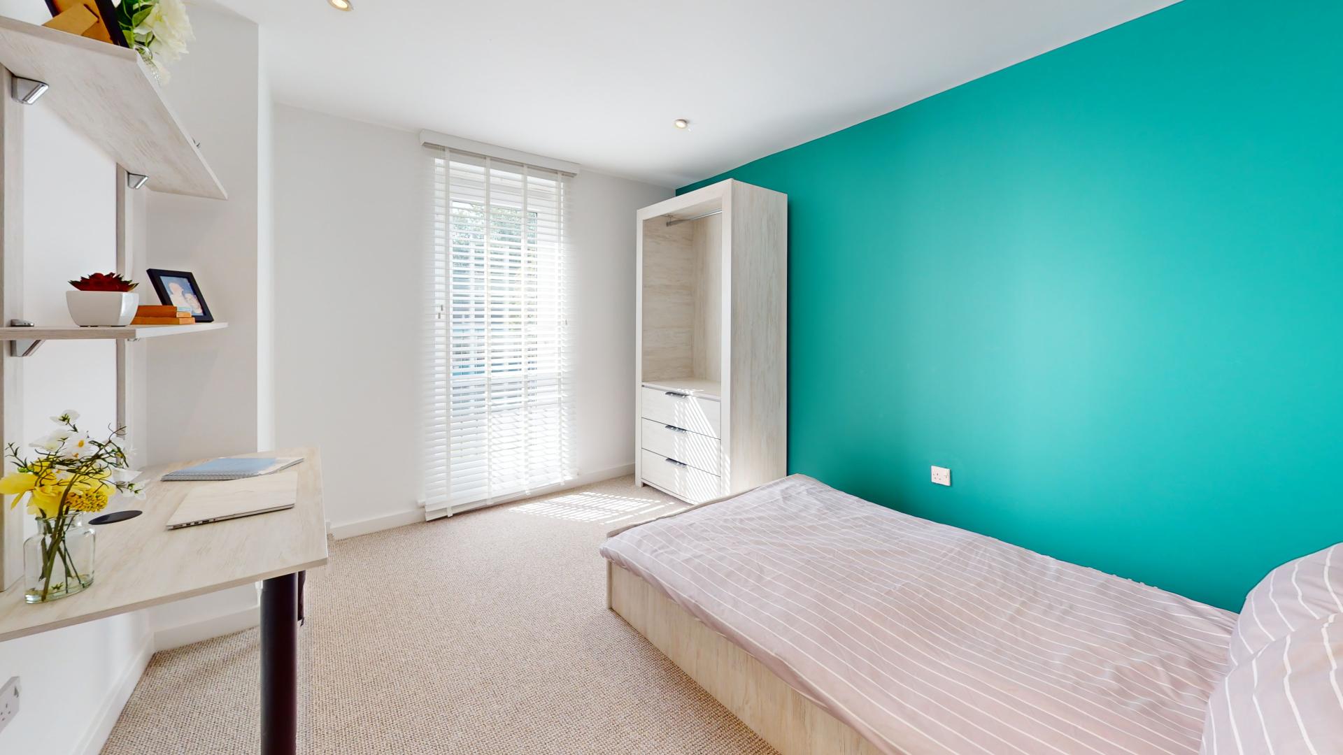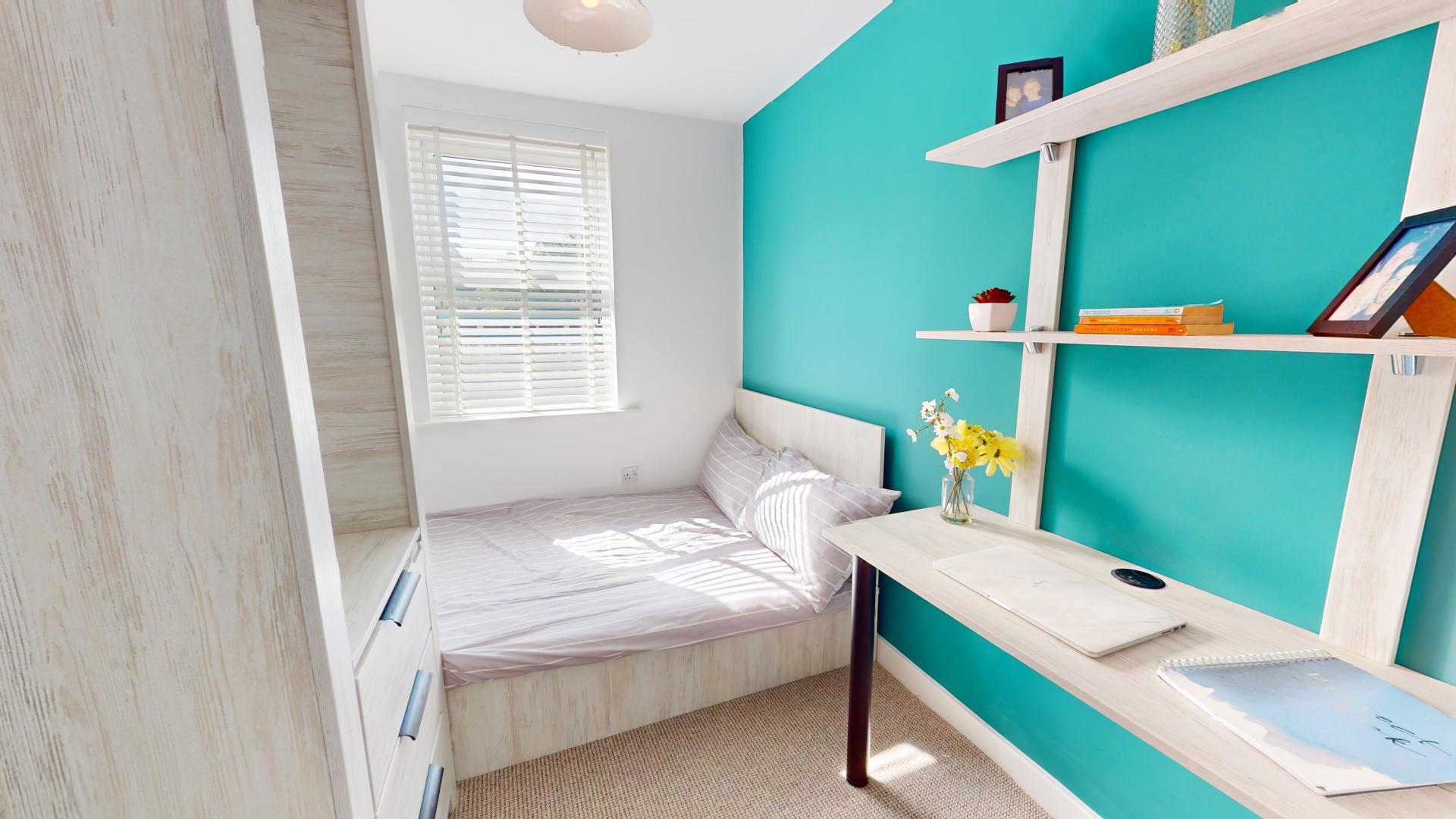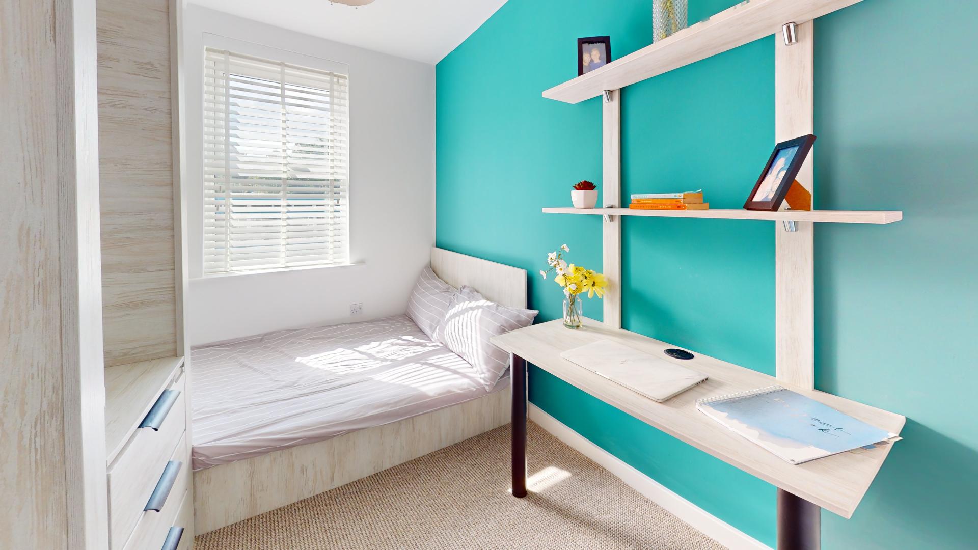 - Bedroom furniture: bed, desk, desk chair, wardrobe, and drawers