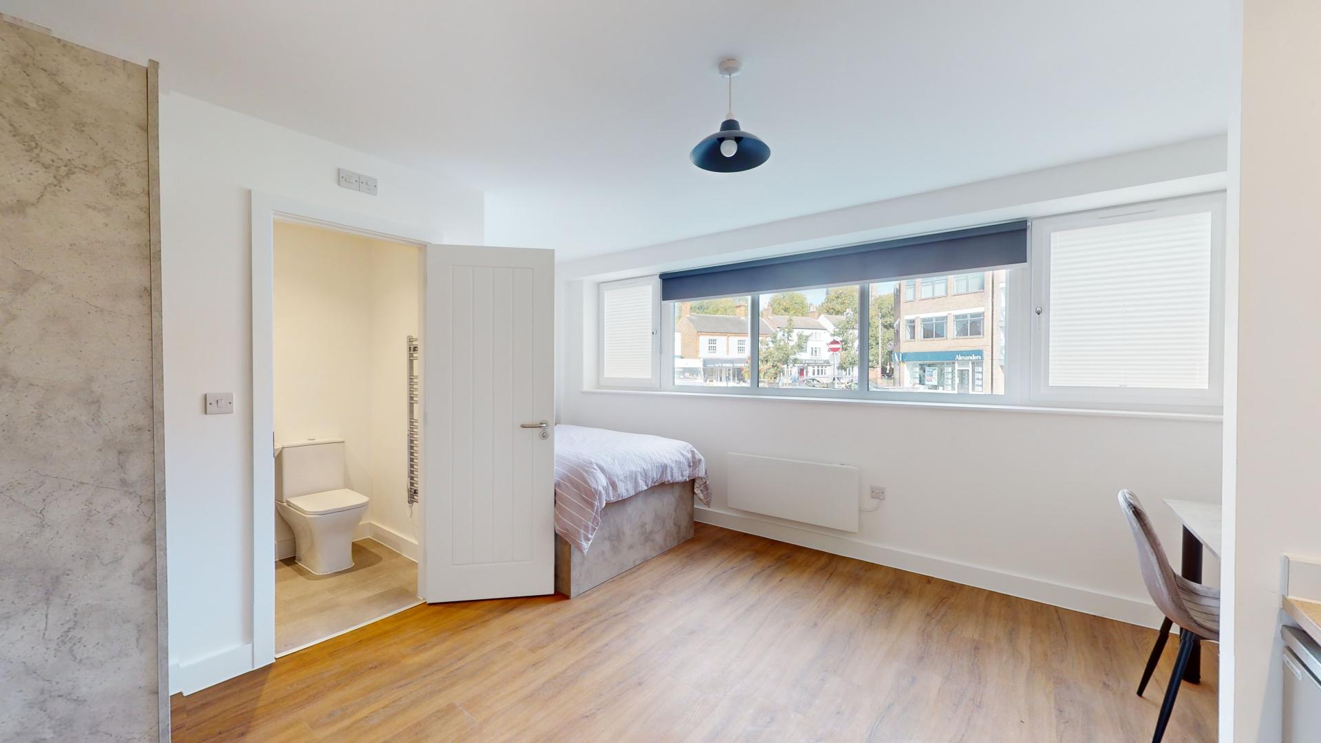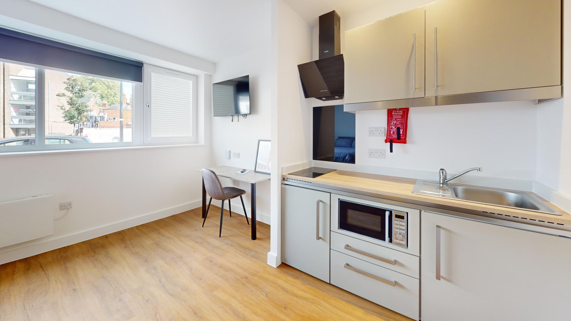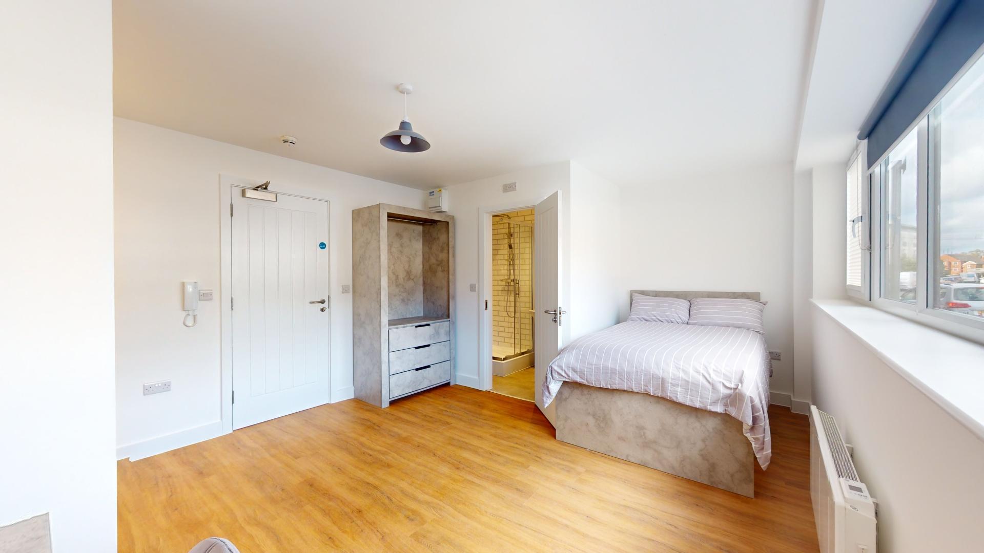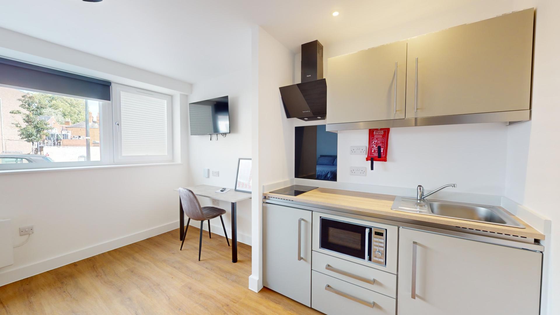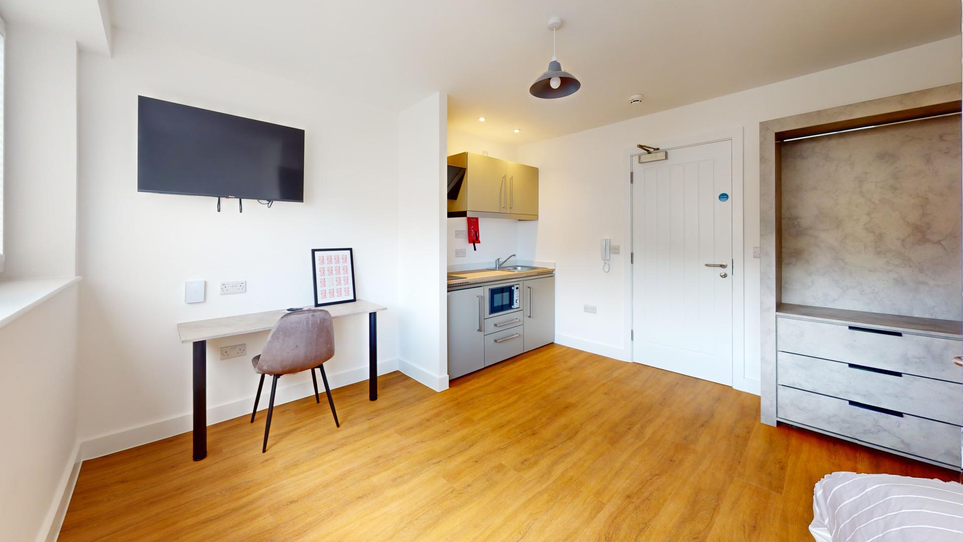 The studio offers a fully self-contained living space complete with an ensuite bathroom and a fully equipped kitchen, ensuring students have everything they need at their fingertips. Its prime location in the town centre places Tesco right next door, making grocery runs quick and hassle-free. Residents can also maintain an active lifestyle with the convenience of an onsite gym, while secure bike storage facilities provide peace of mind by protecting bicycles from potential theft or damage.