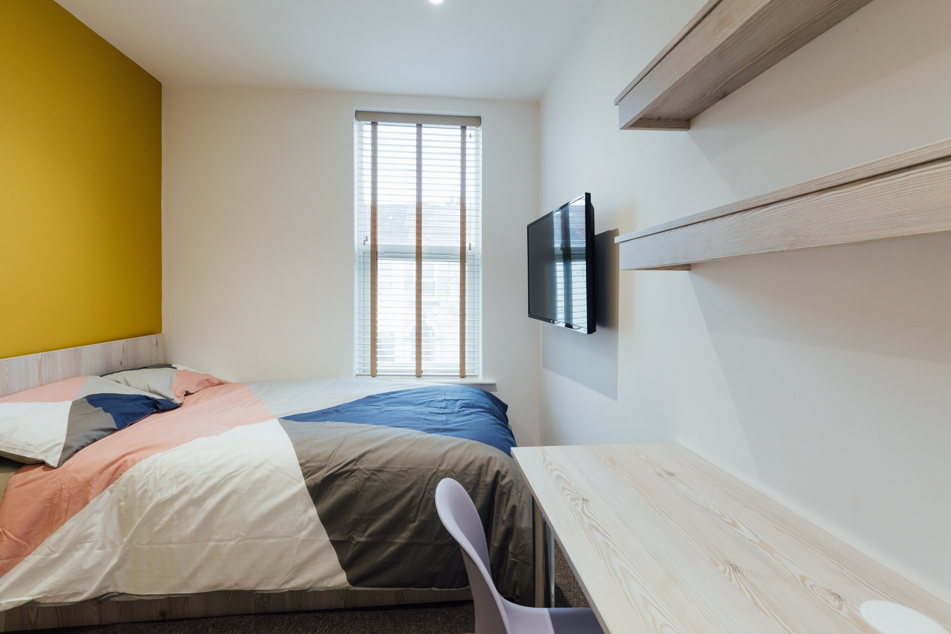 - Bedroom furniture: bed, desk, desk chair, wardrobe, and drawers