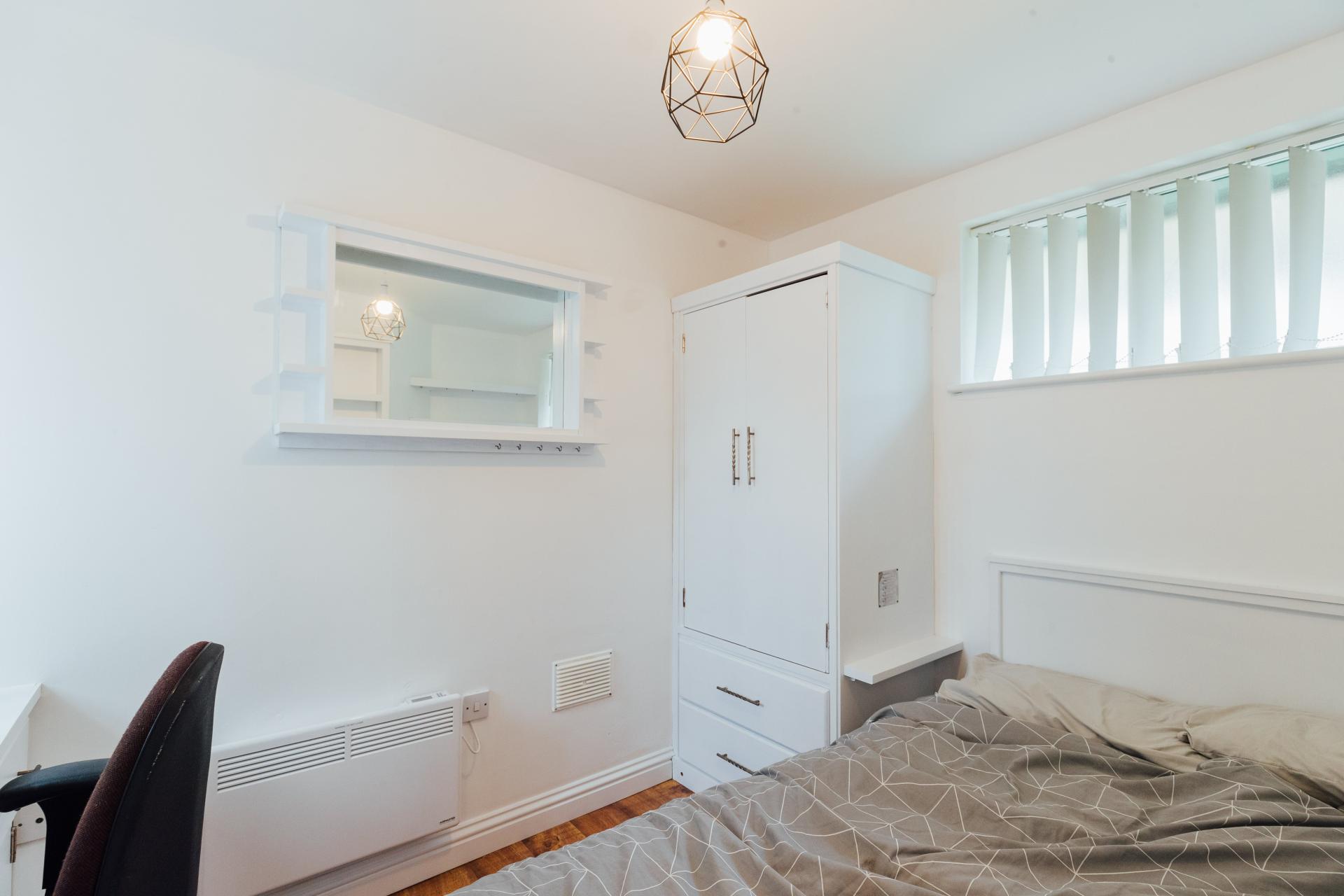 - Bedroom furniture: bed, desk, desk chair, wardrobe, and drawers
