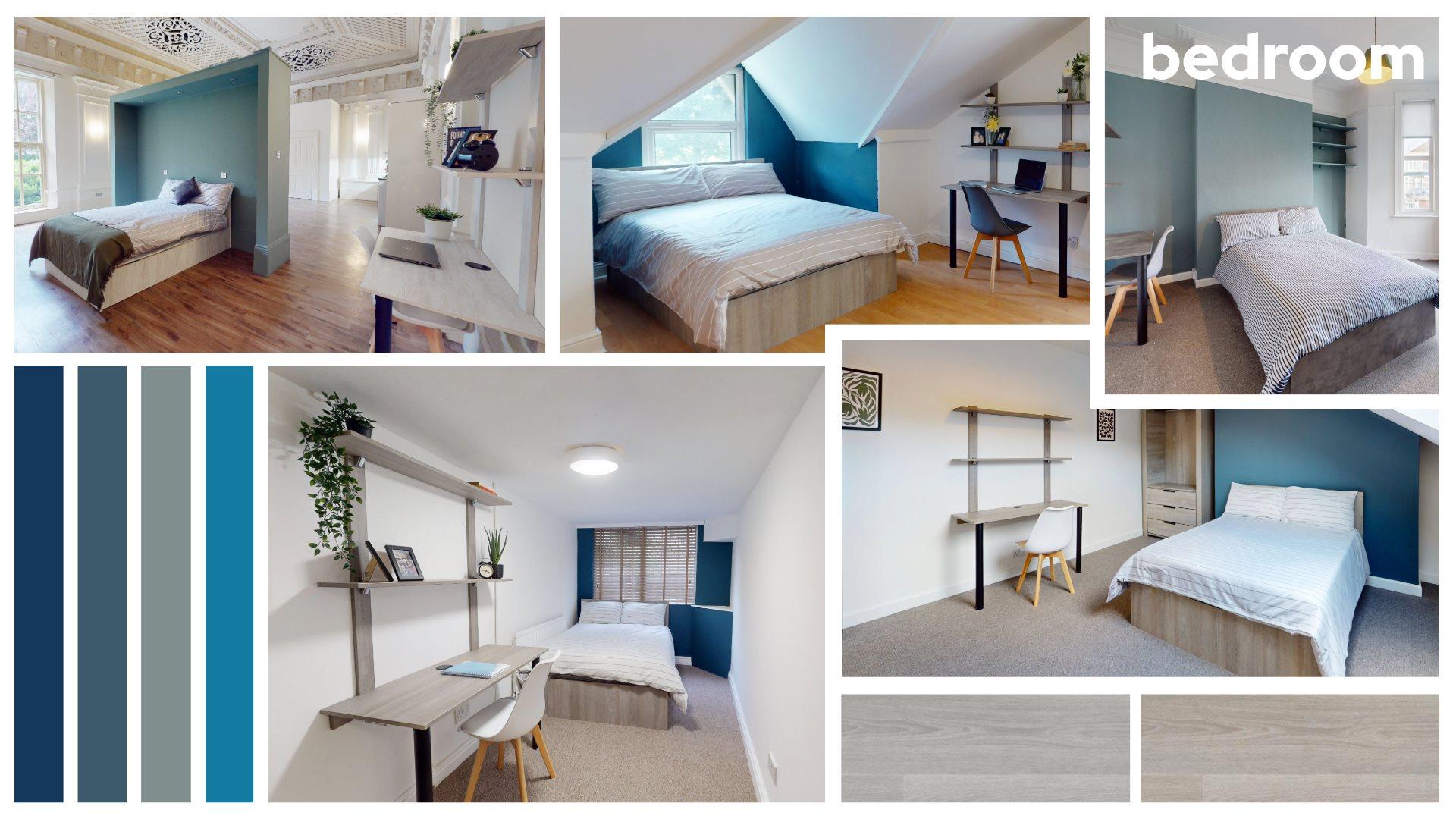 - Bedroom furniture: bed, desk, desk chair, wardrobe, and drawers