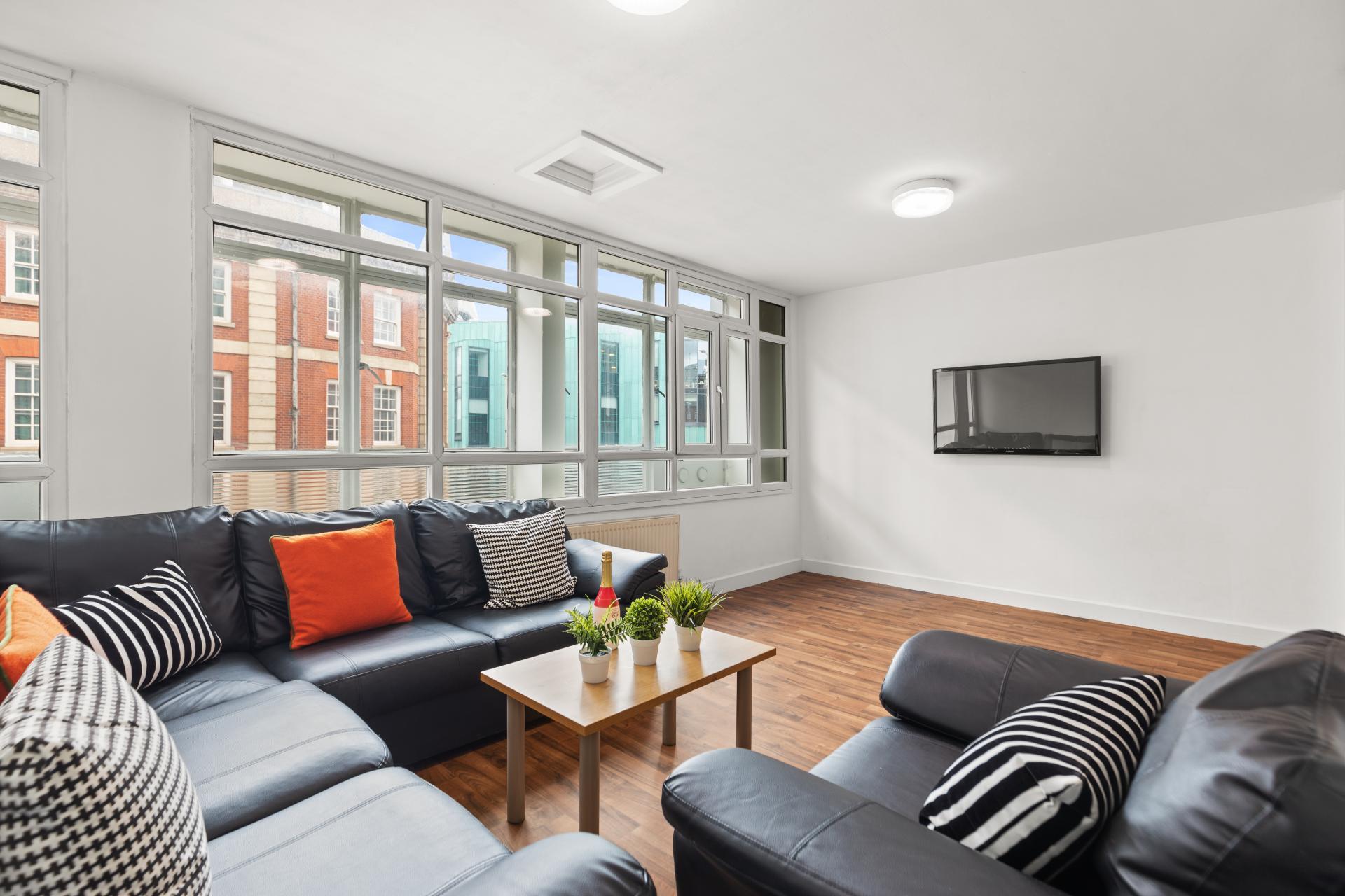 The open-plan living area is the heart of the flat, offering a bright and friendly environment for socialising, studying together, or relaxing with housemates.