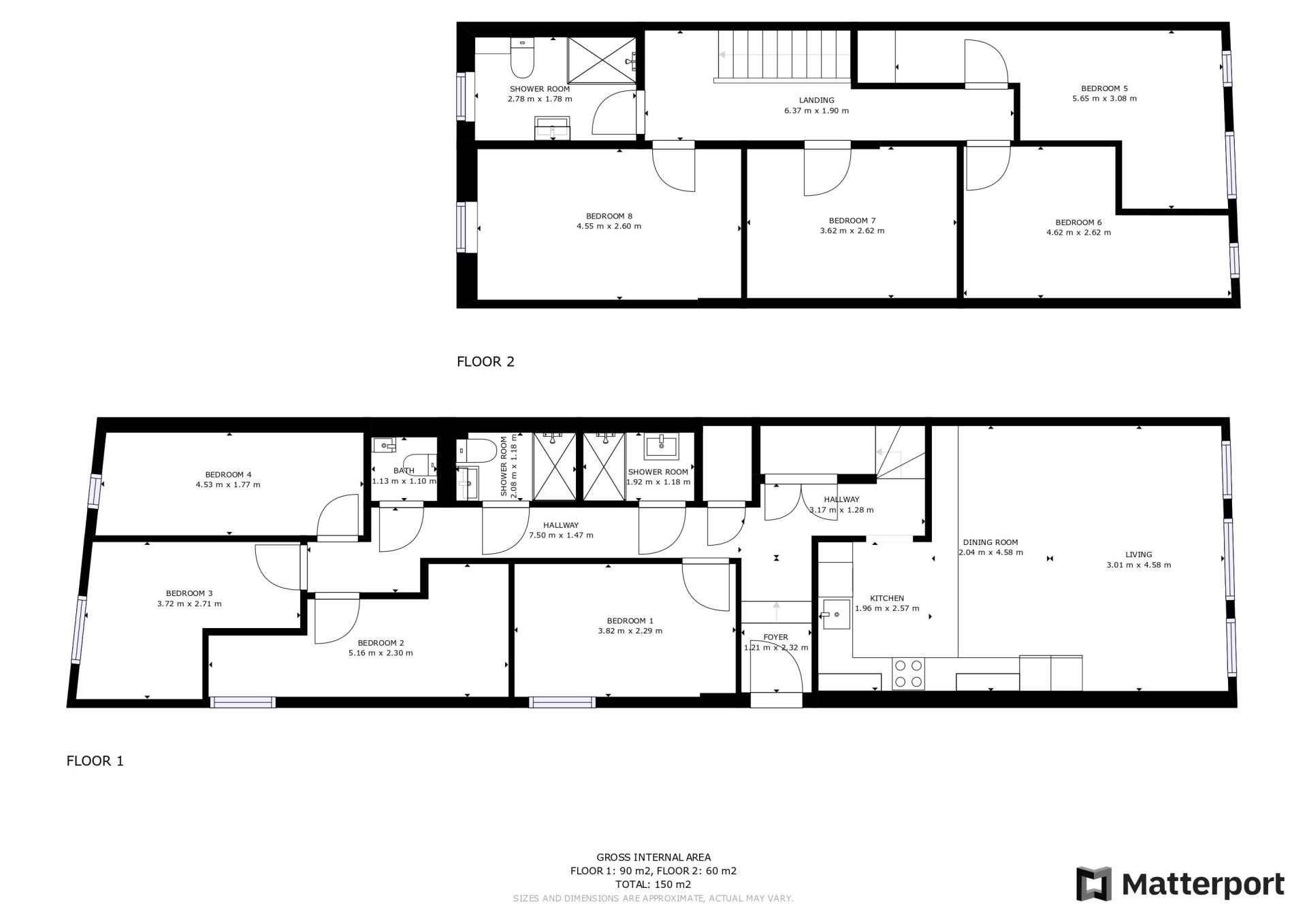 The property features eight double bedrooms, each offering a peaceful retreat for you to rest and recharge. With TVs provided in every bedroom, you can enjoy personal entertainment and privacy in your own space. Three shower rooms and additional WC ensure convenience during busy mornings and evenings.