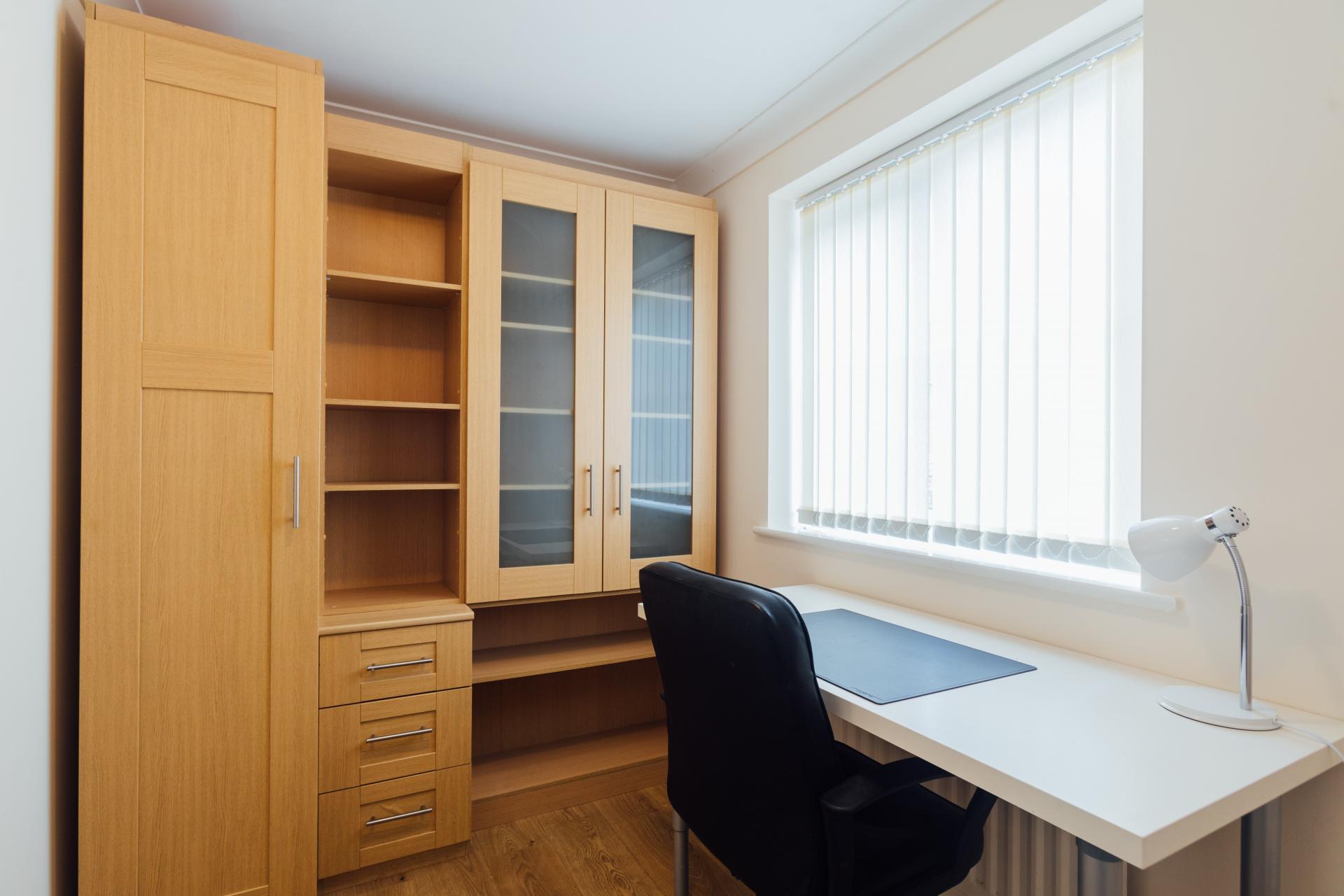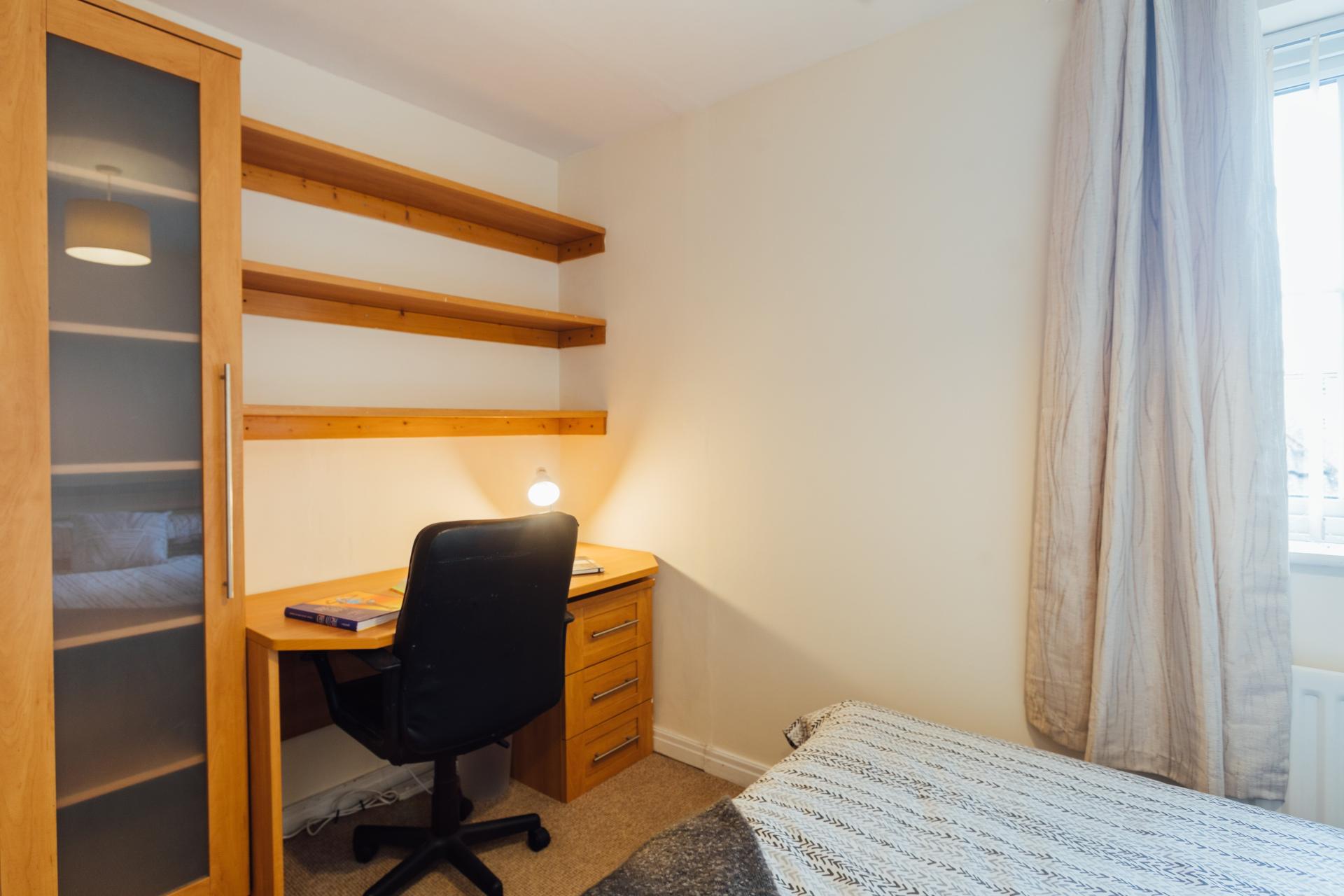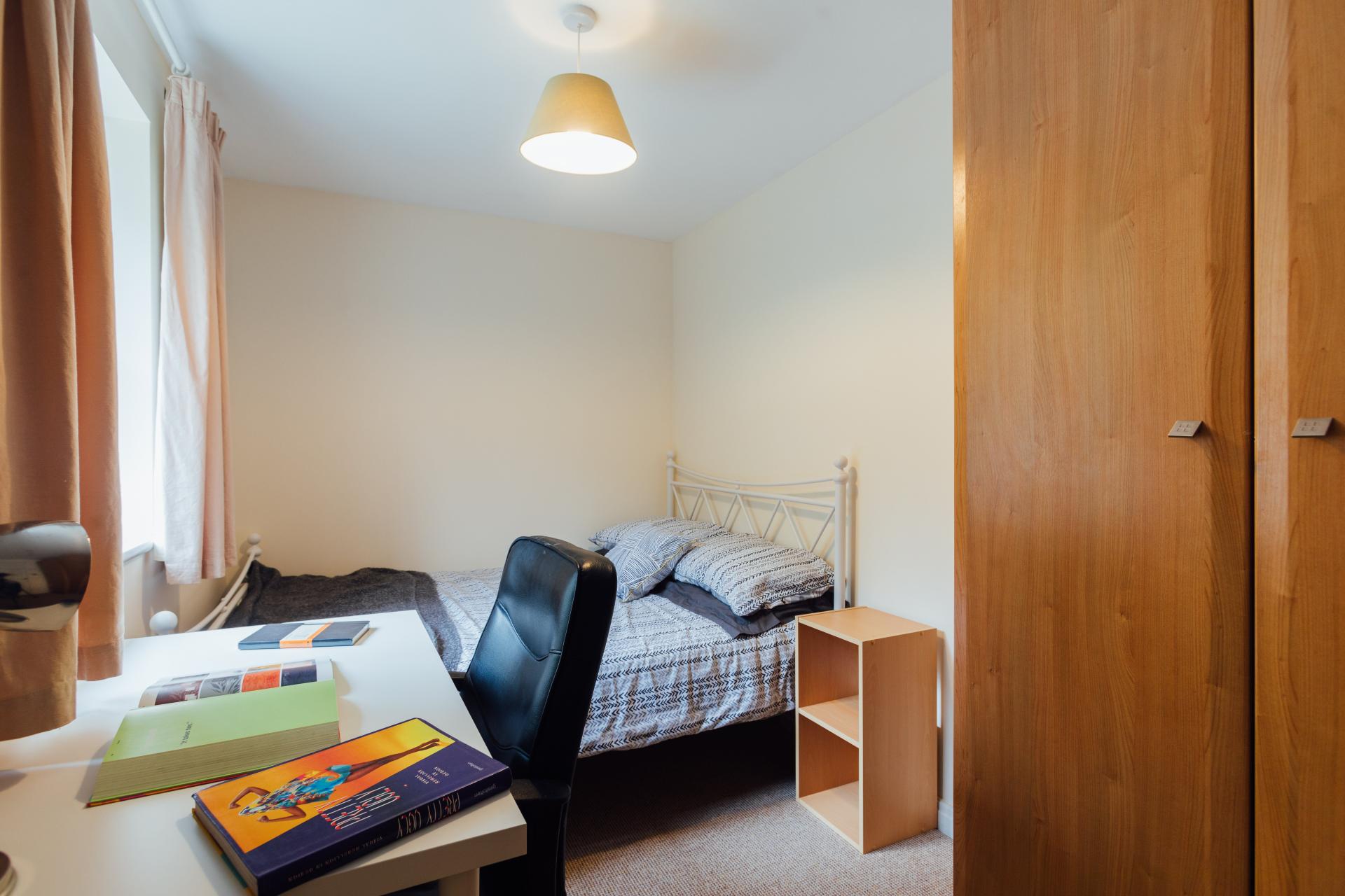 - Bedroom furniture: bed, desk, desk chair, wardrobe, and drawers