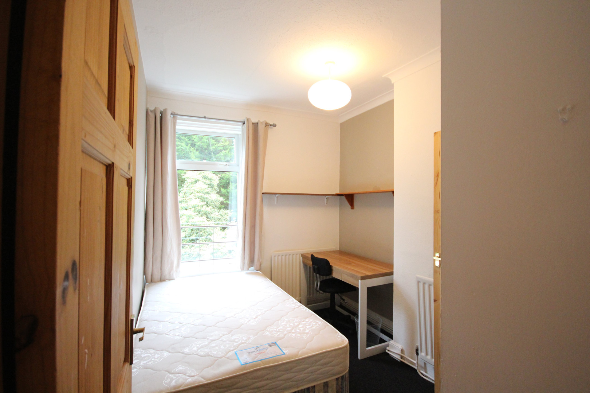 The property features four generously sized bedrooms, each furnished with a double bed, study space, and ample storage. There are two bathrooms, both fitted to a good standard, offering convenience and practicality for shared living.