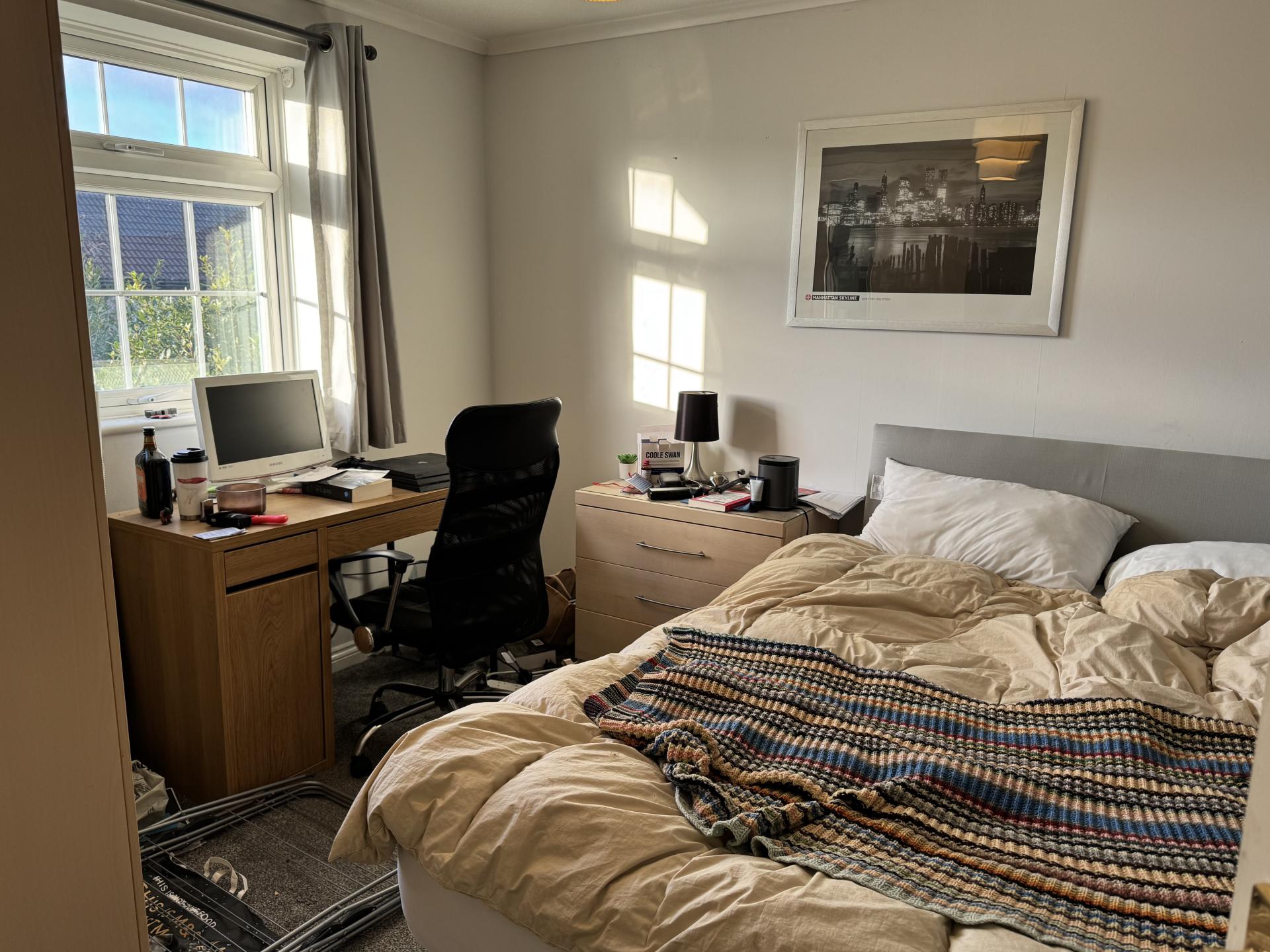 - Bedroom furniture: bed, desk, desk chair, wardrobe, and drawers