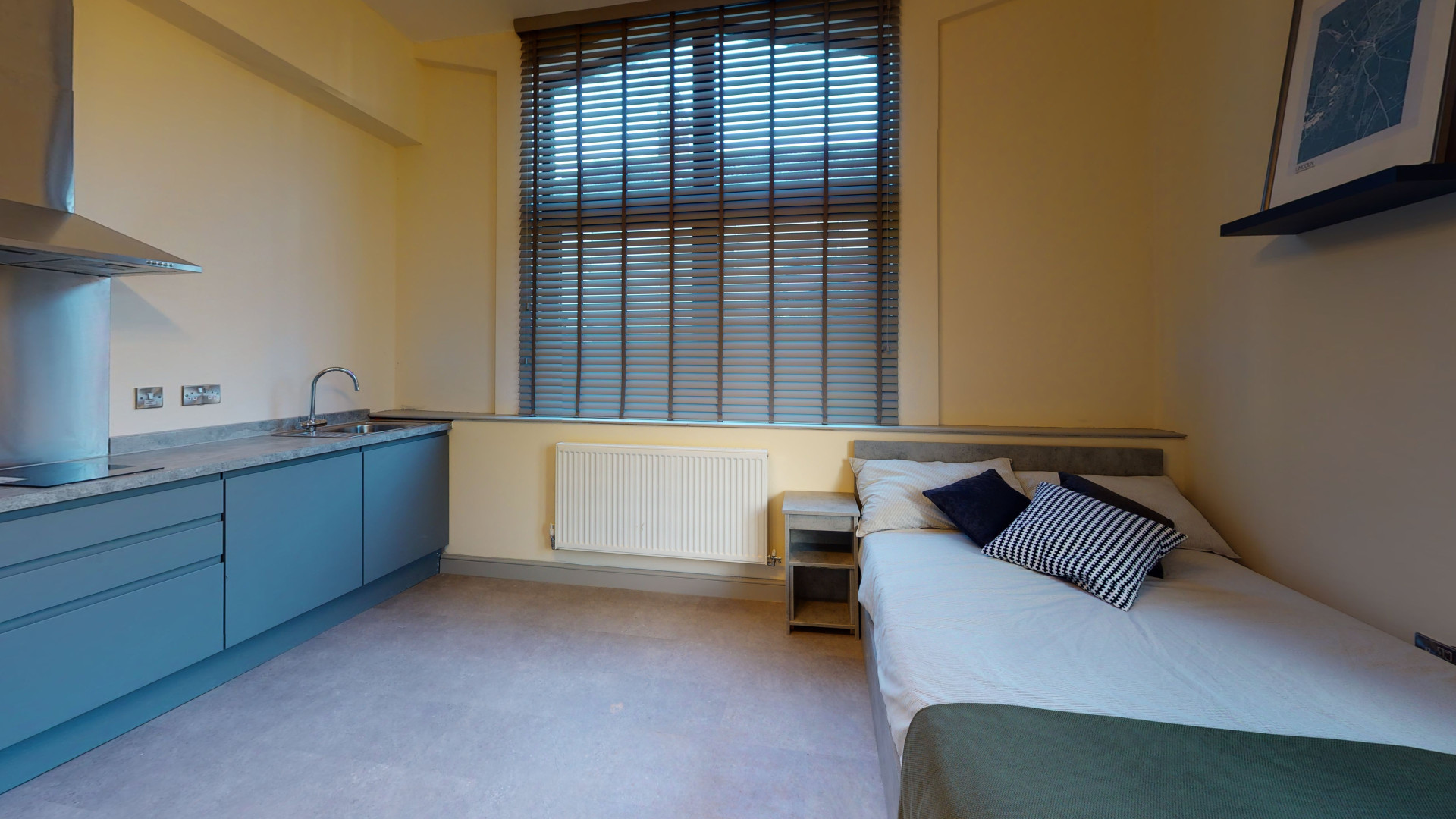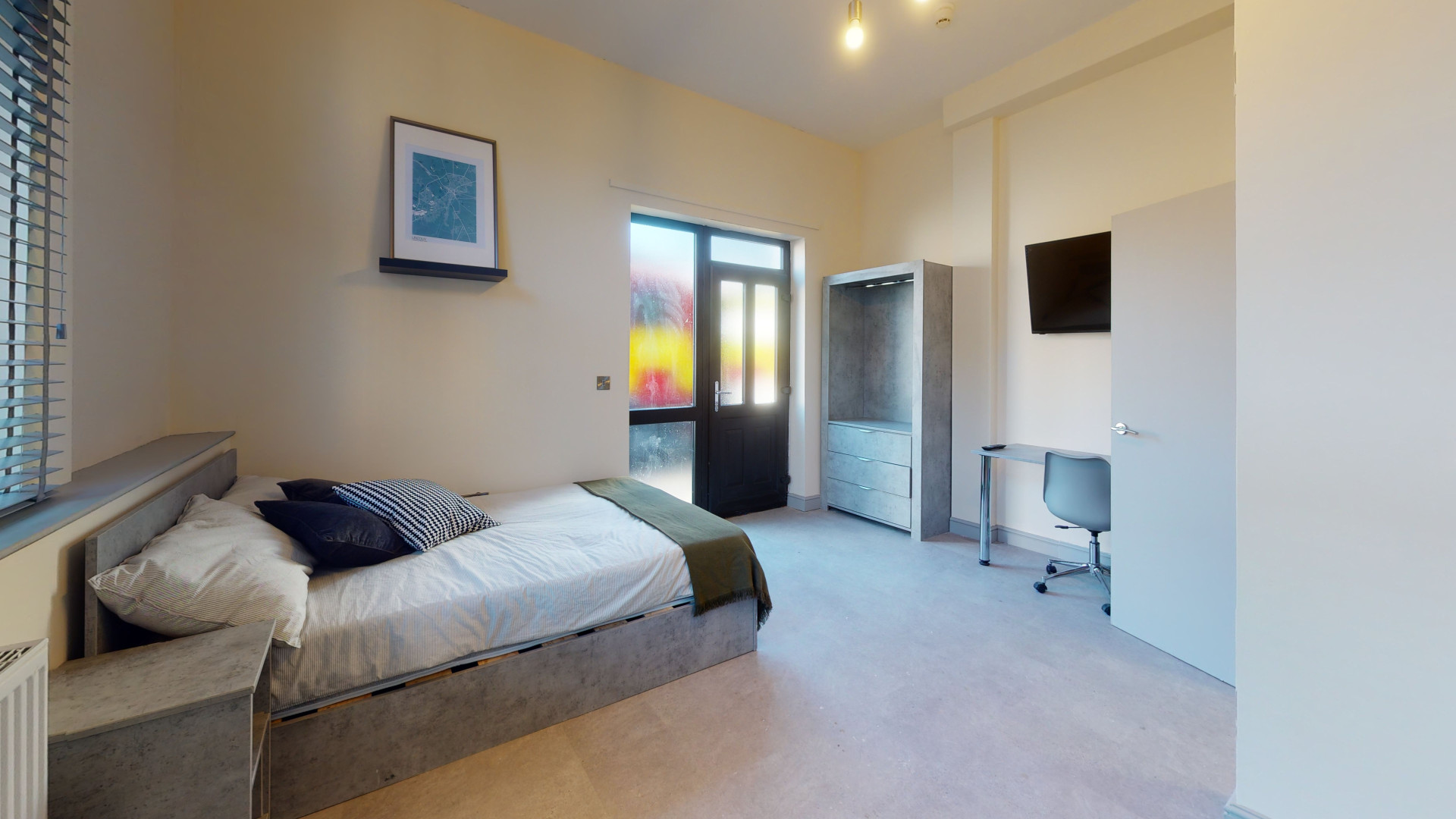 - Open-plan studio – spacious and fully furnished, with a comfy bed, desk, wardrobe, and a Smart TV