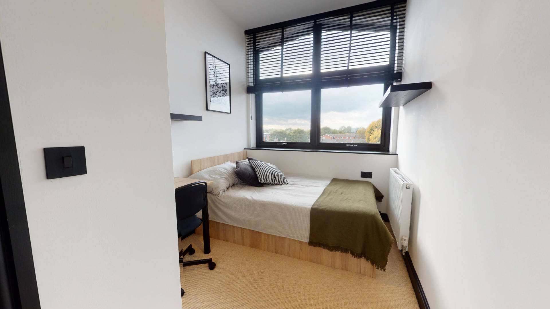 - Bedroom furniture: bed, desk, desk chair, wardrobe, and drawers