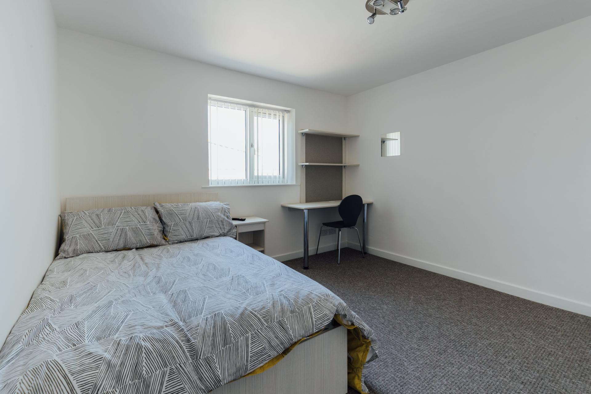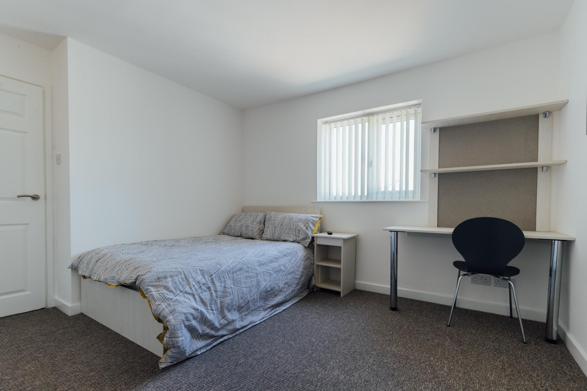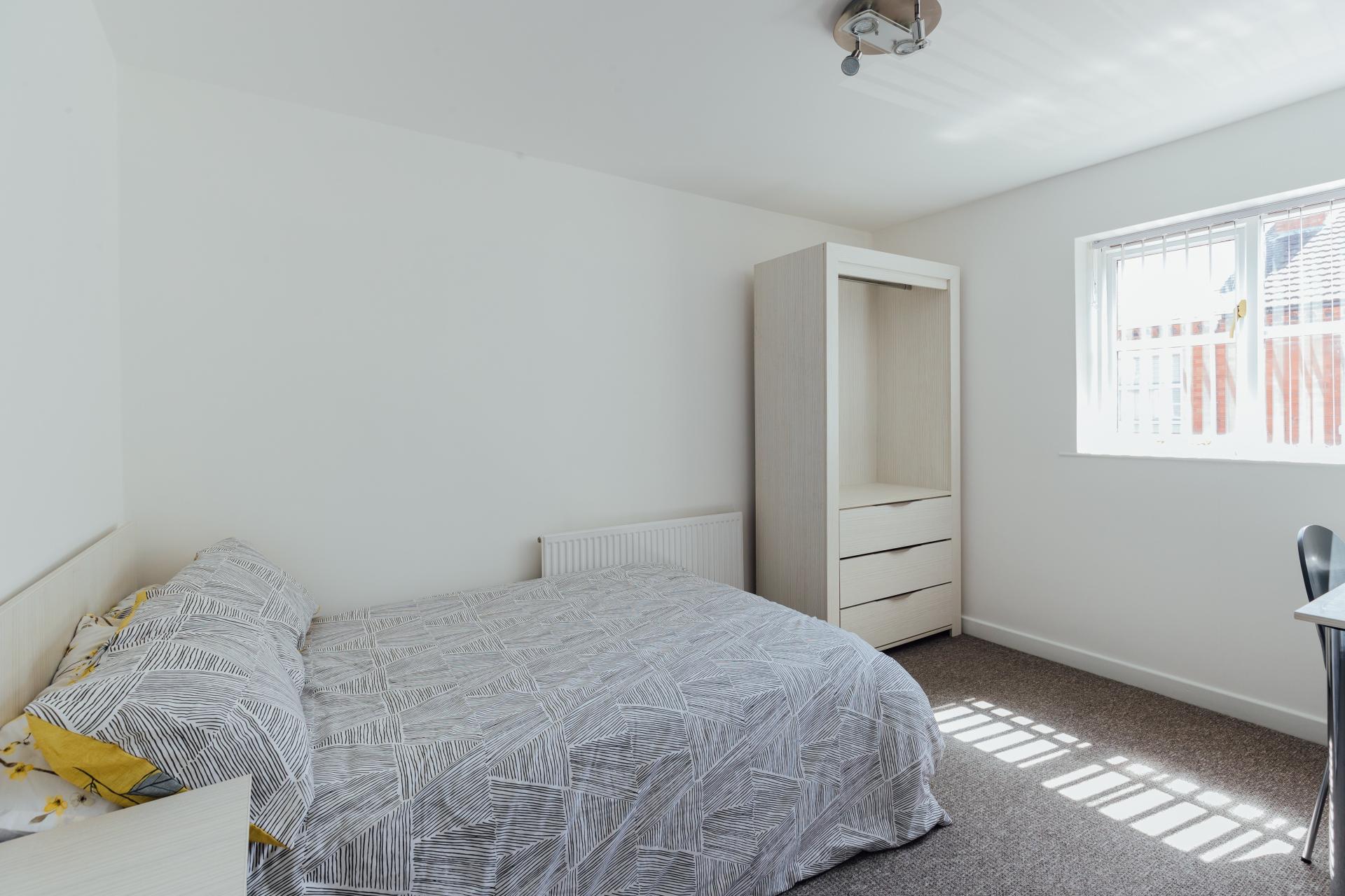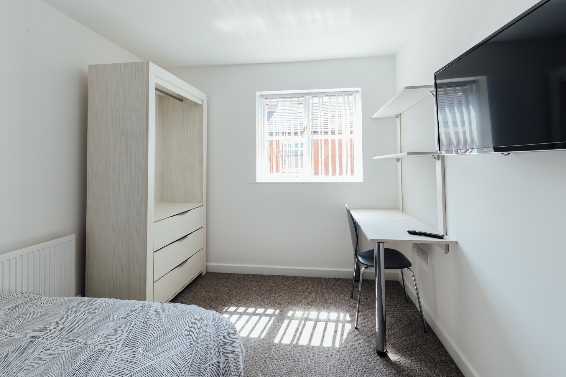 - Bedroom furniture: bed, desk, desk chair, wardrobe, and drawers