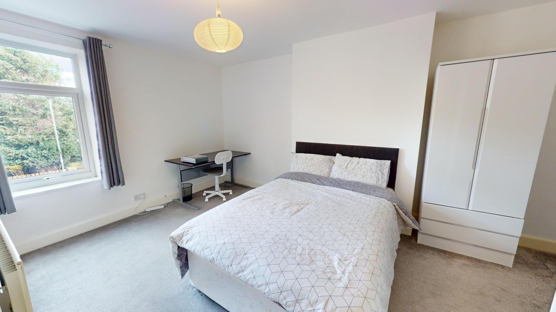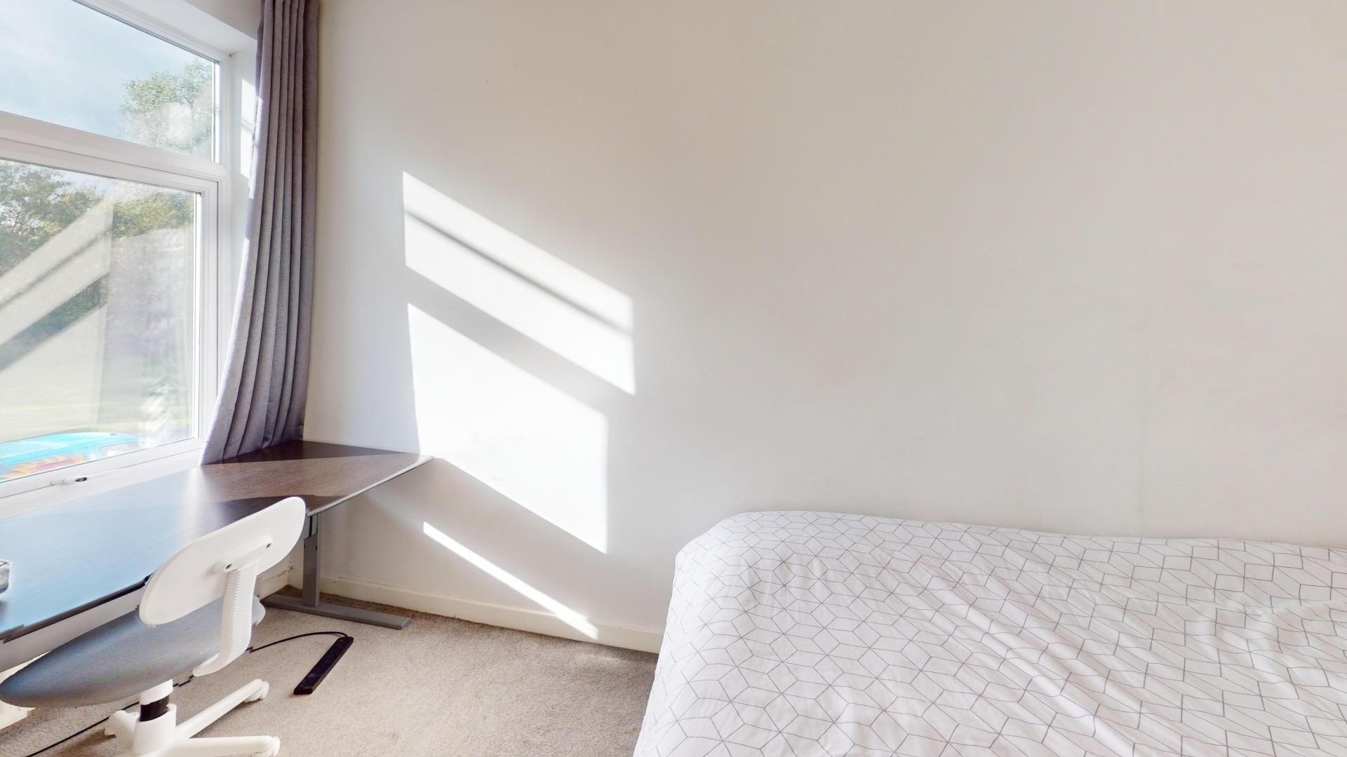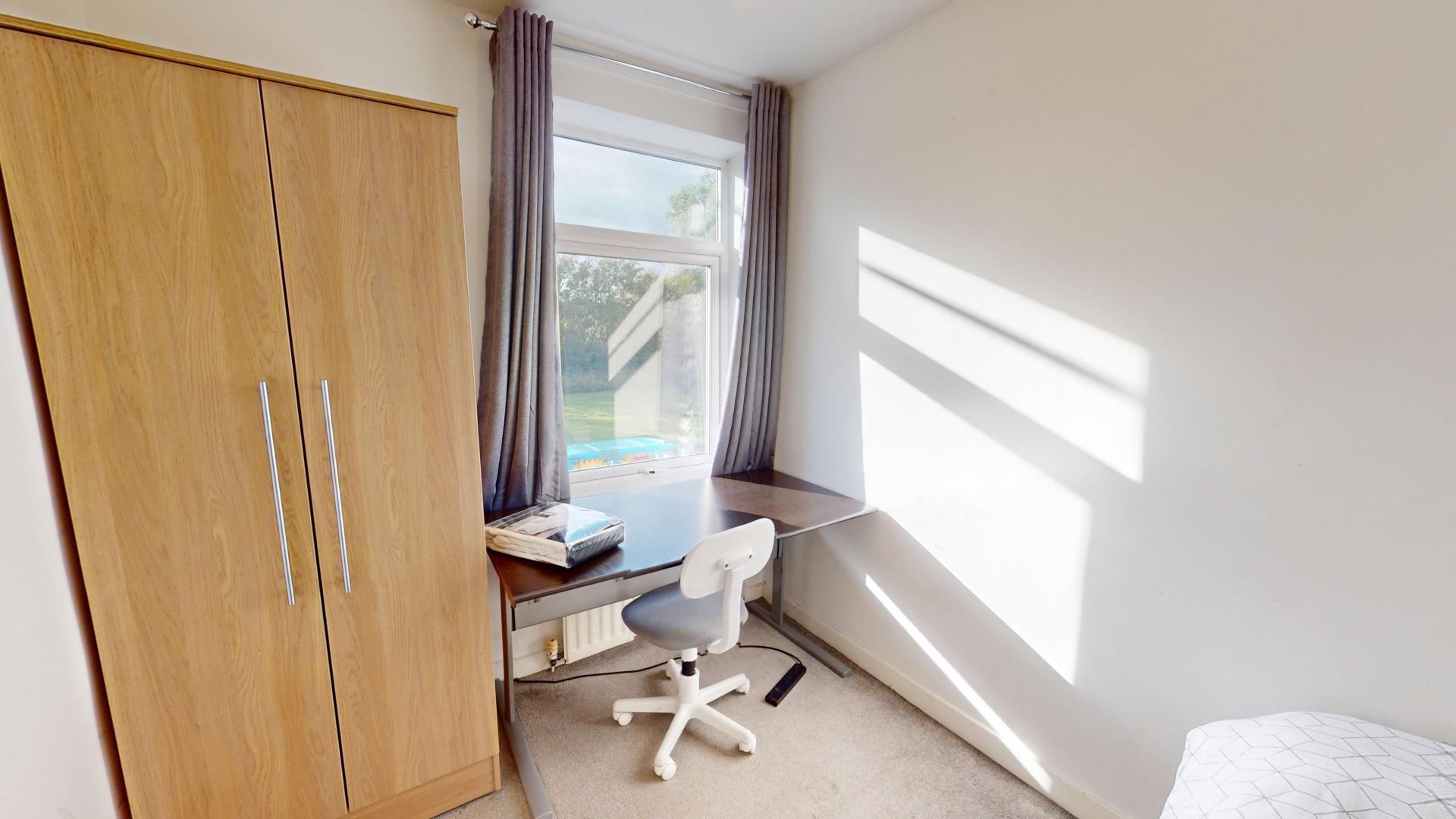 - Bedroom furniture: bed, desk, desk chair, wardrobe, and drawers