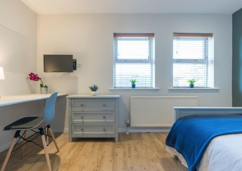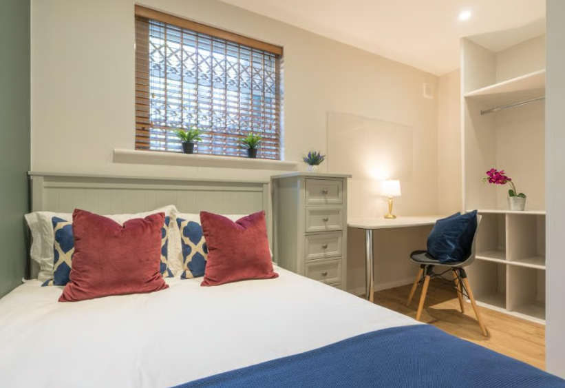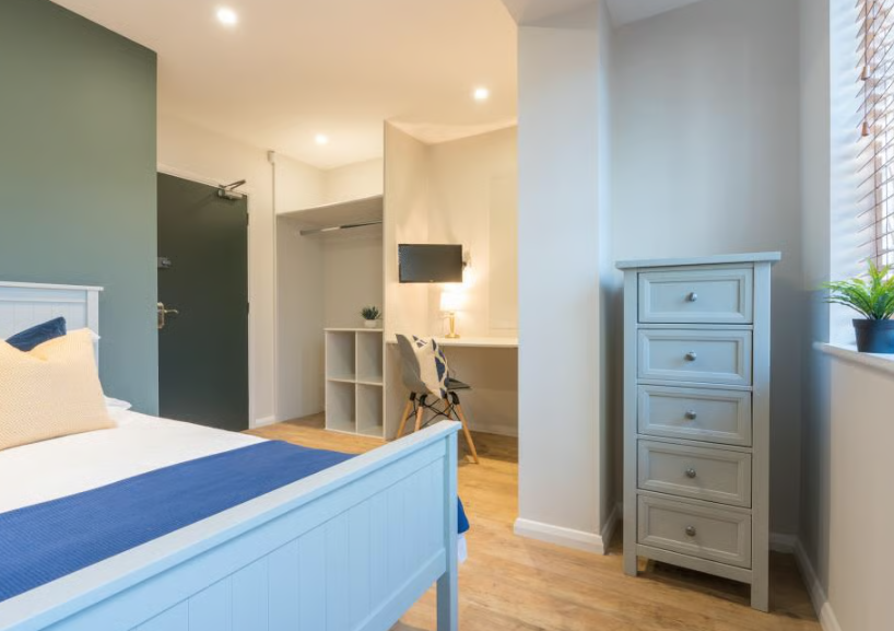 - Bedroom furniture: bed, desk, desk chair, wardrobe, and drawers