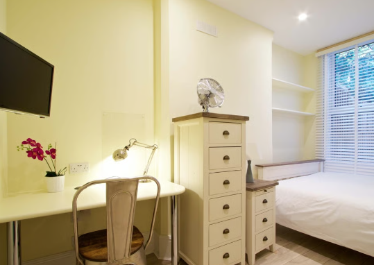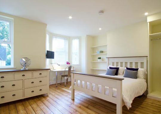 - Bedroom furniture: bed, desk, desk chair, wardrobe, and drawers