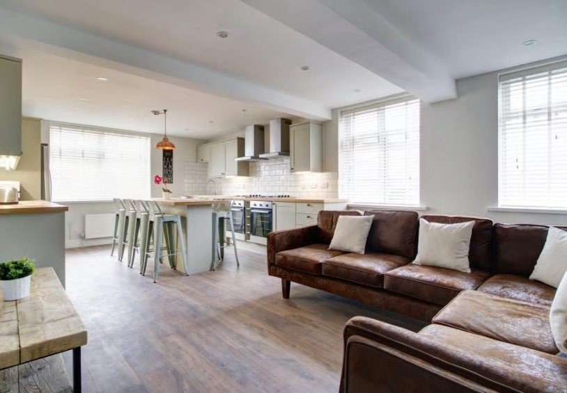 Spacious and modern 8-bed student flat ideally located just 5 minutes from Nottingham Trent University. Each bedroom includes a double bed, desk, and storage, with a large open-plan kitchen and living area featuring a corner sofa and flat-screen TV.