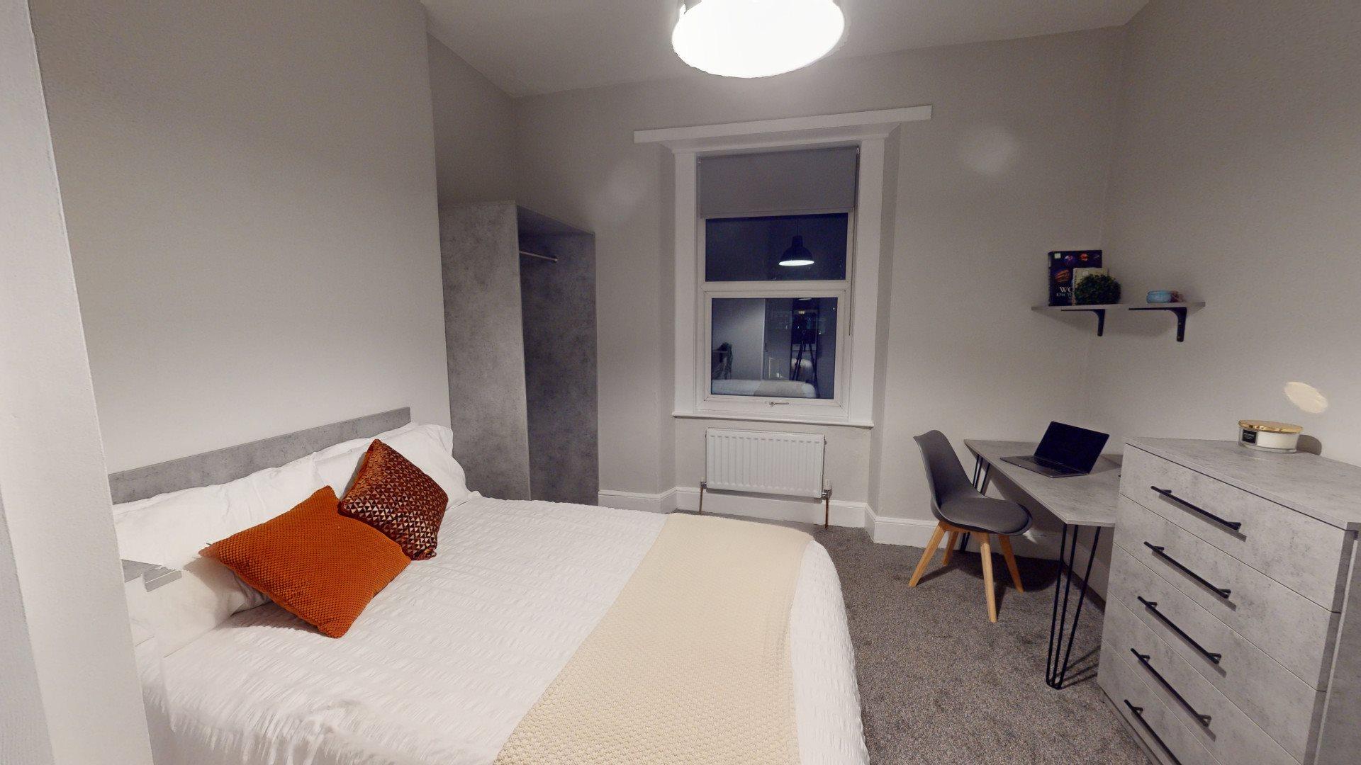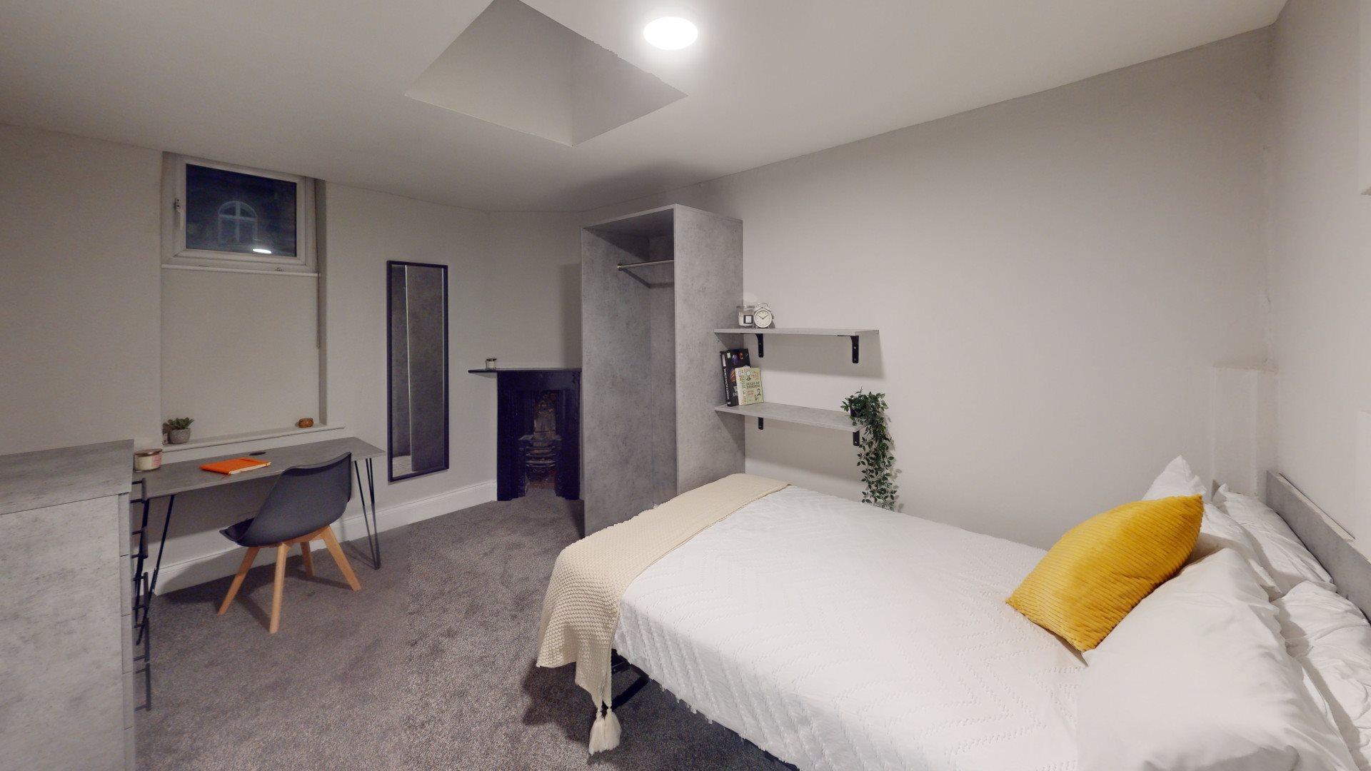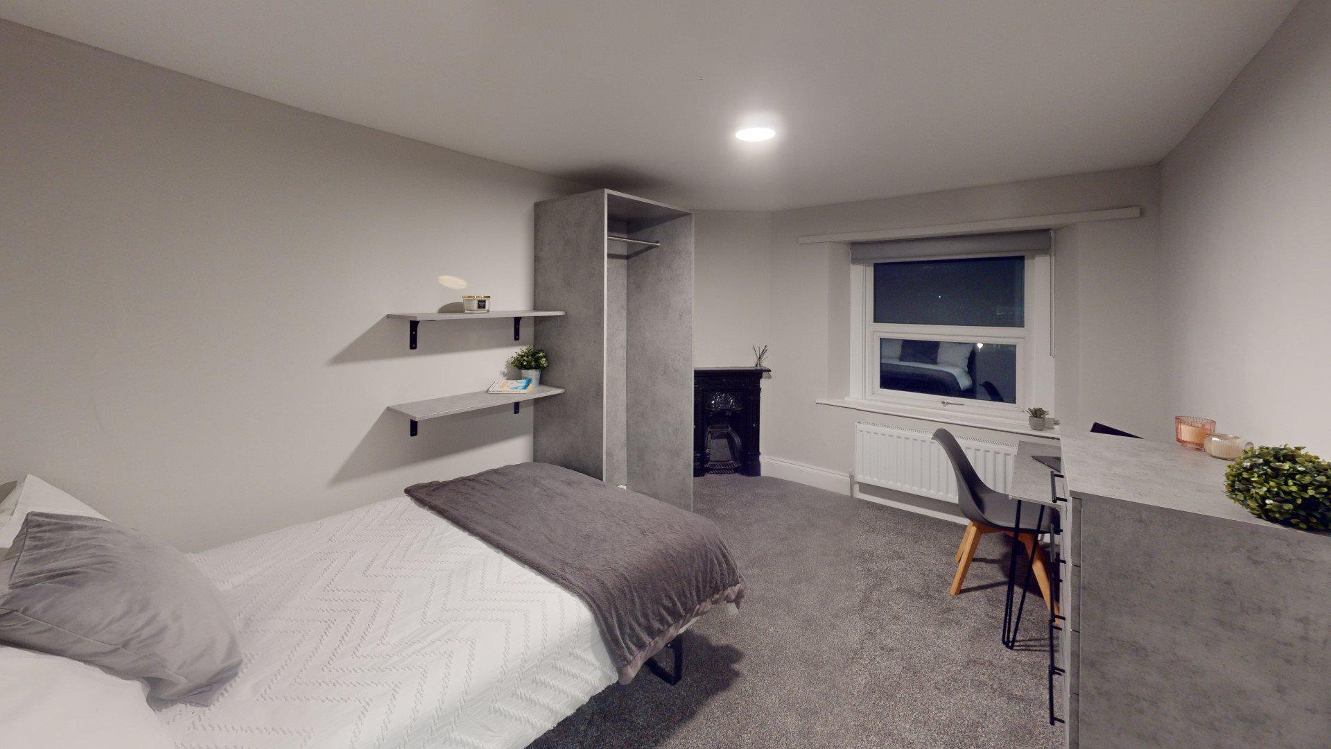 - Bedroom furniture: bed, desk, desk chair, wardrobe, and drawers