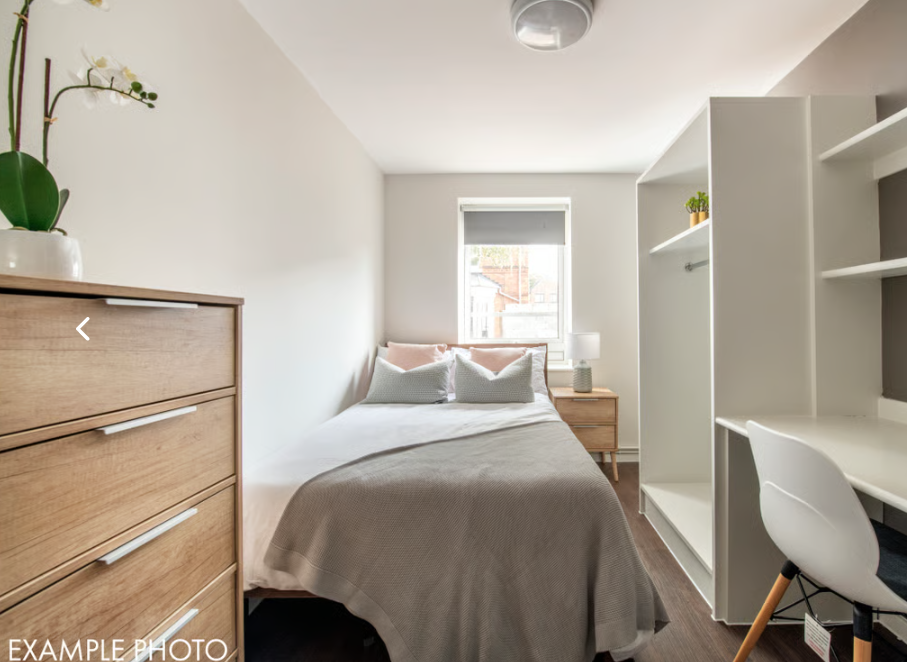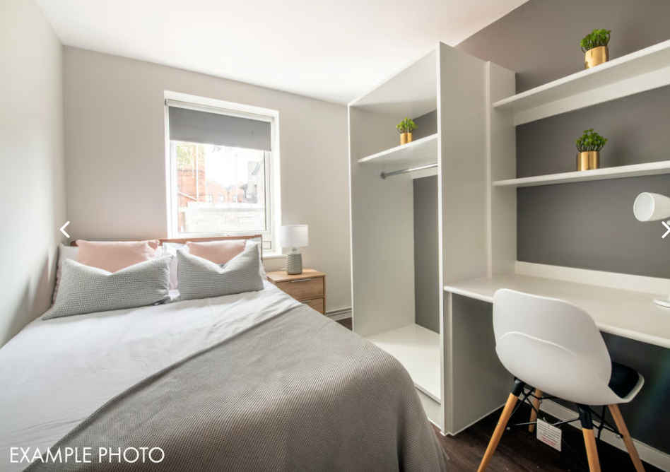 - Six fully furnished double bedrooms, each equipped with a bed, desk, chair, and ample storage.
