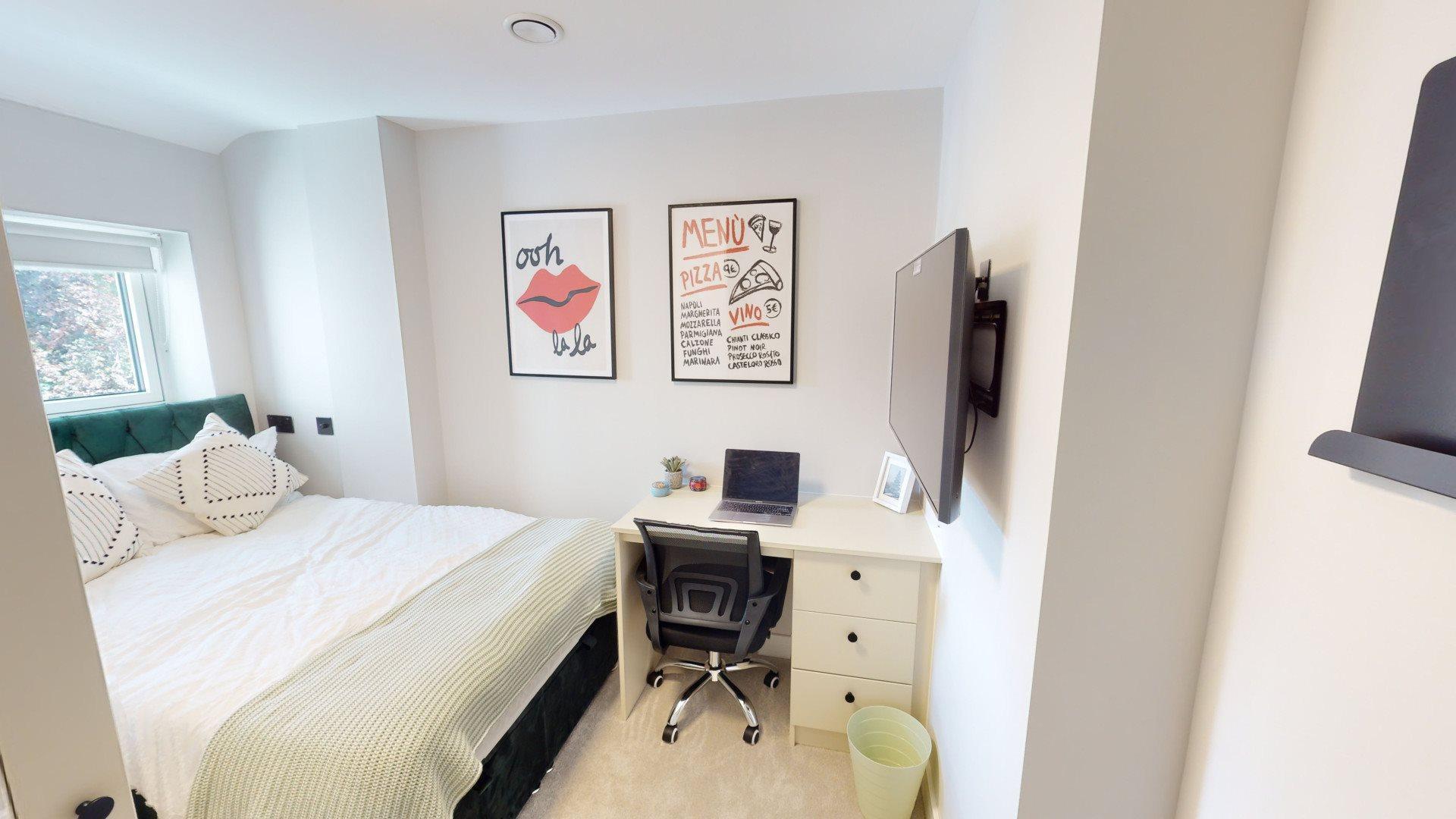- Bedroom furniture: bed, desk, desk chair, wardrobe, and drawers