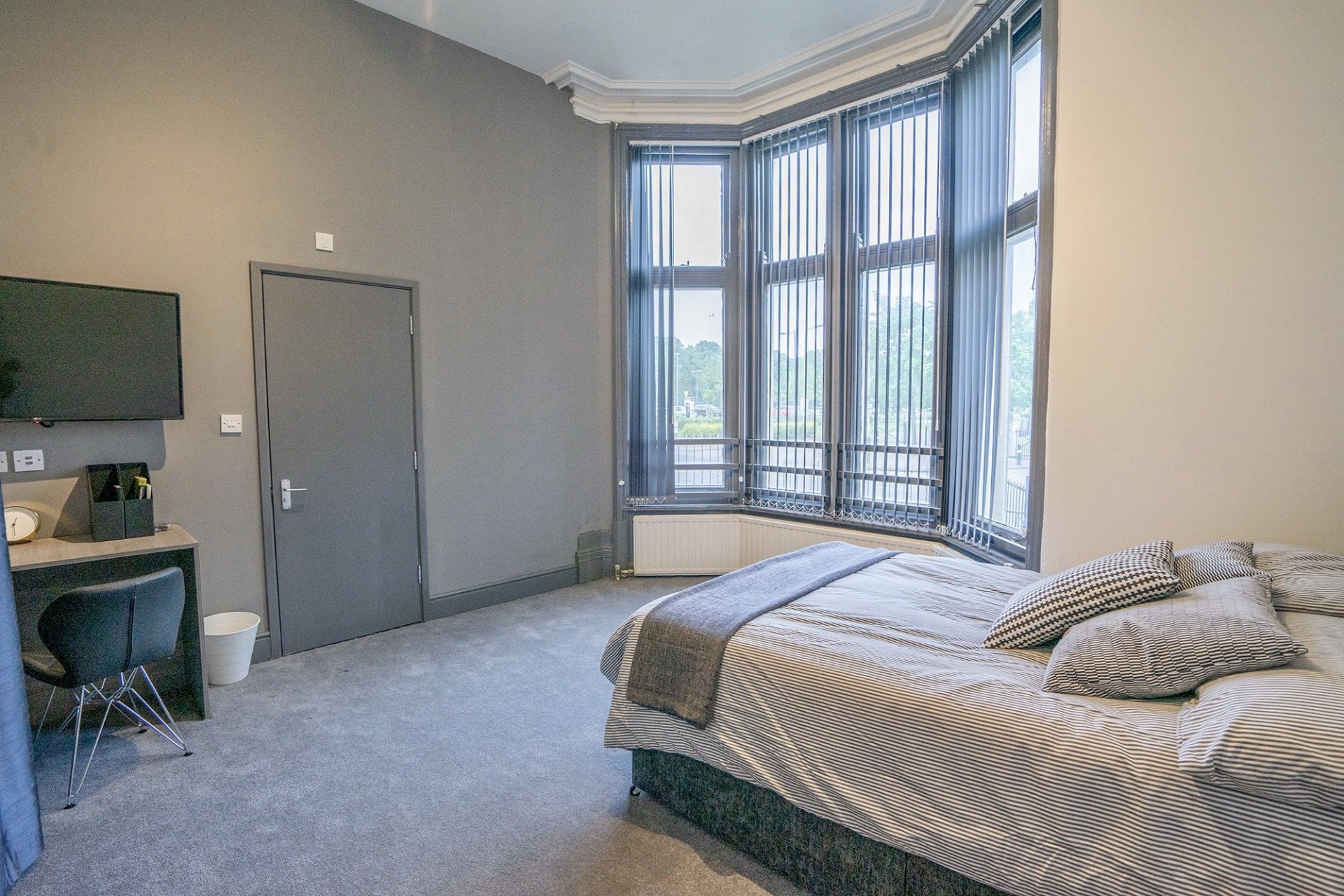 - Bedroom furniture: bed, desk, desk chair, wardrobe, and drawers