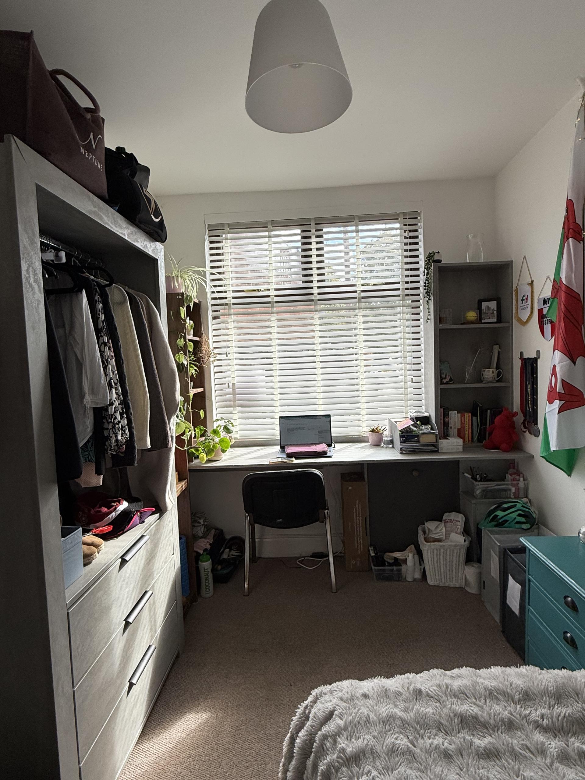 - Bedroom furniture: bed, desk, desk chair, wardrobe, and drawers