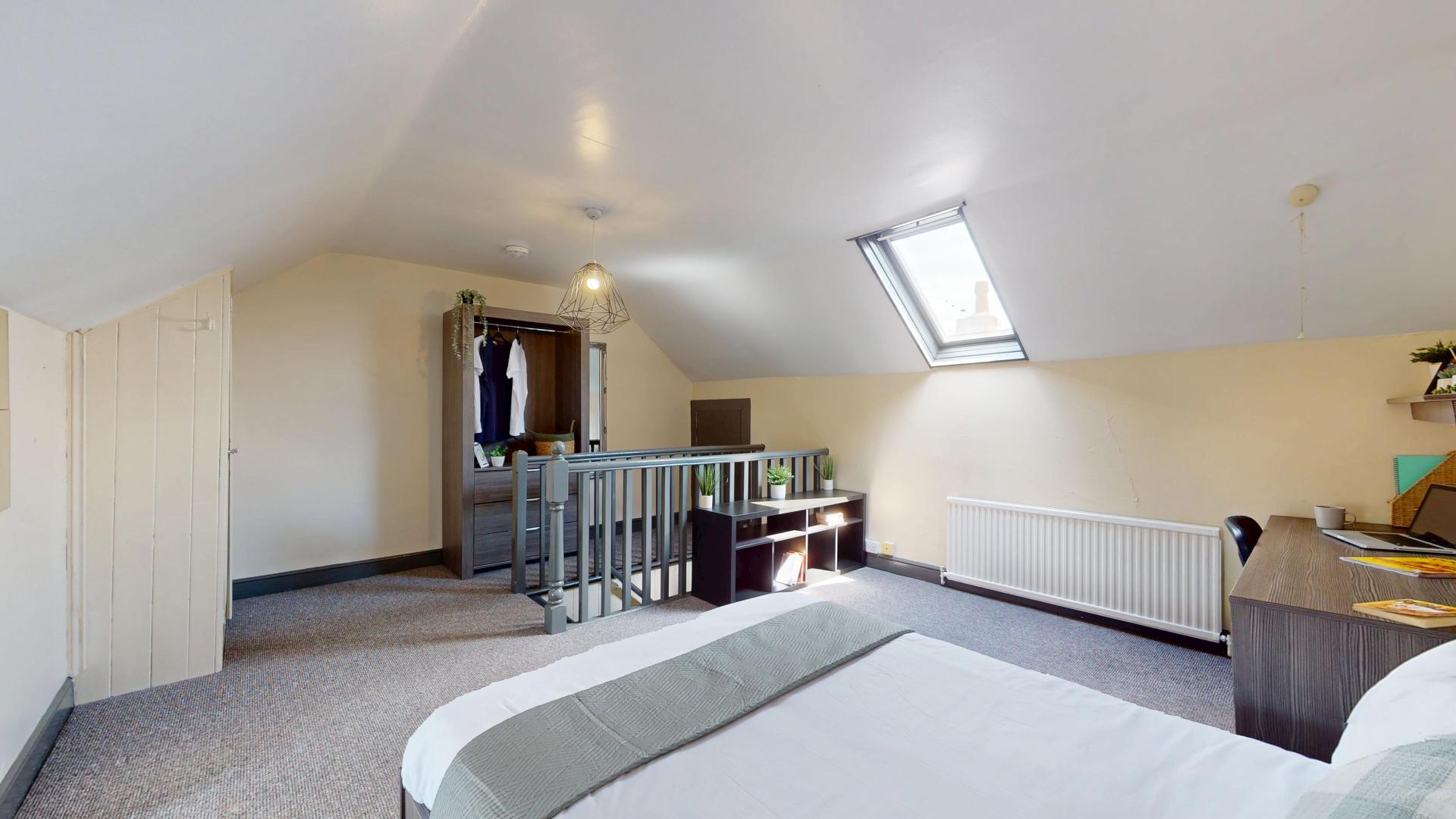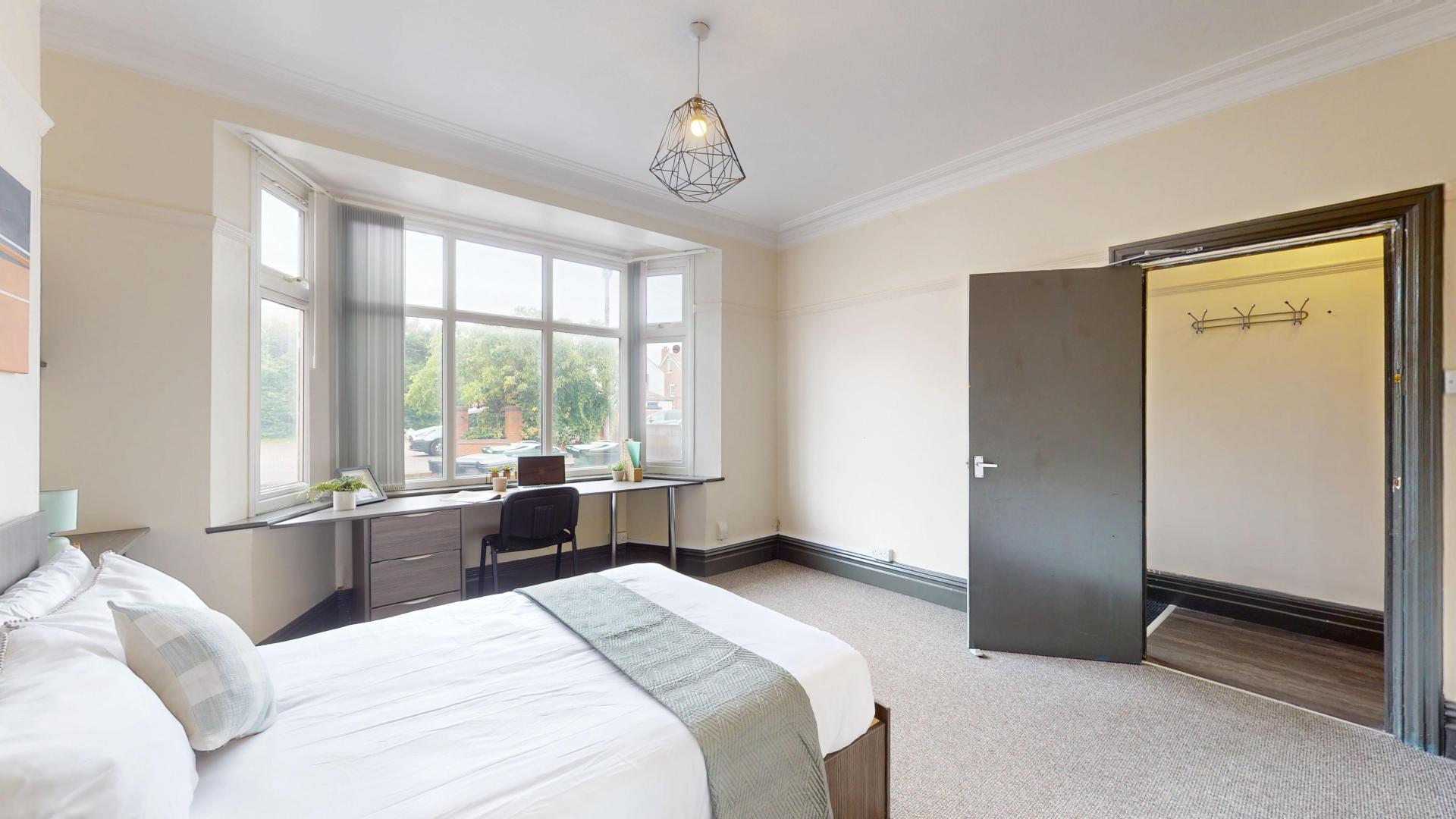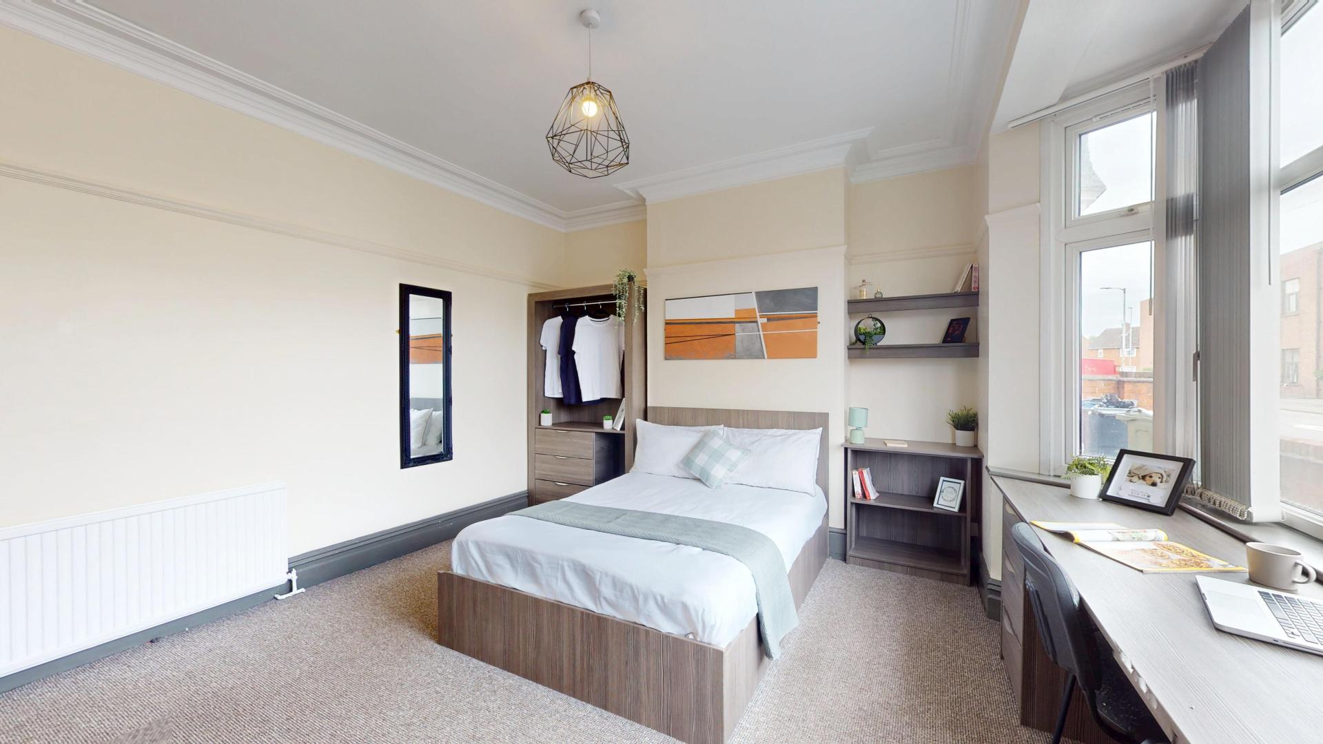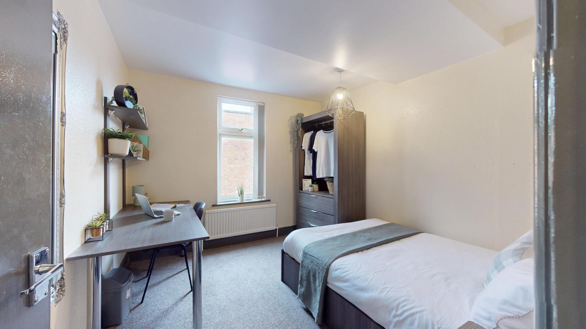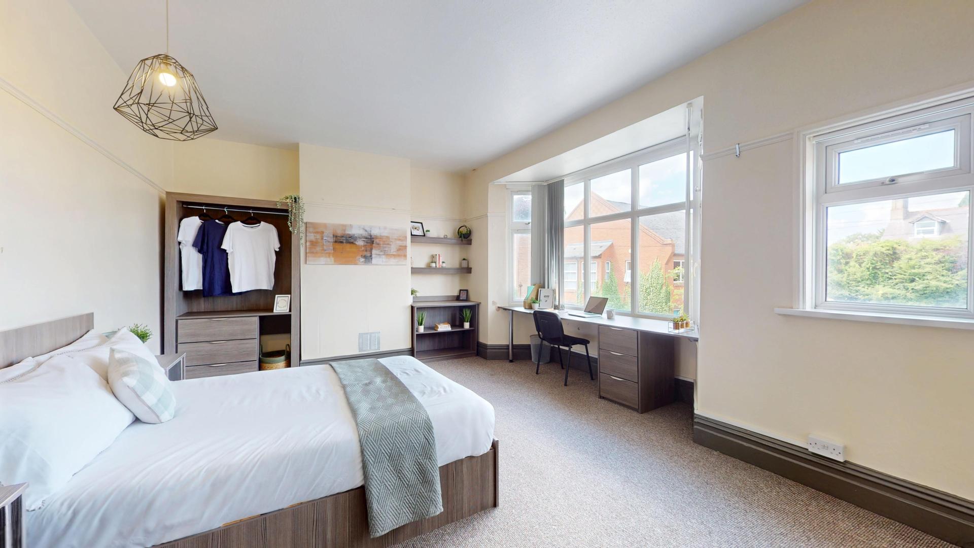 - Bedroom furniture: bed, desk, desk chair, wardrobe, and drawers