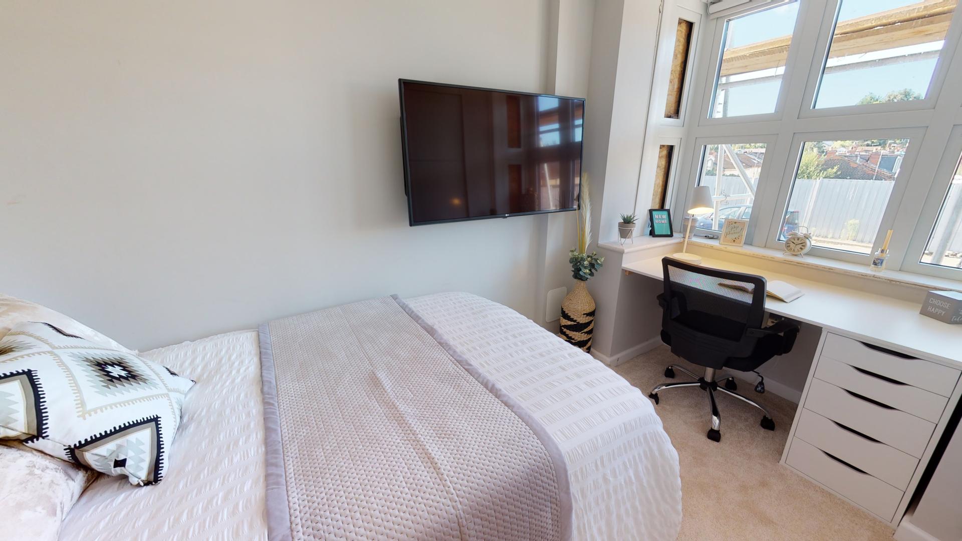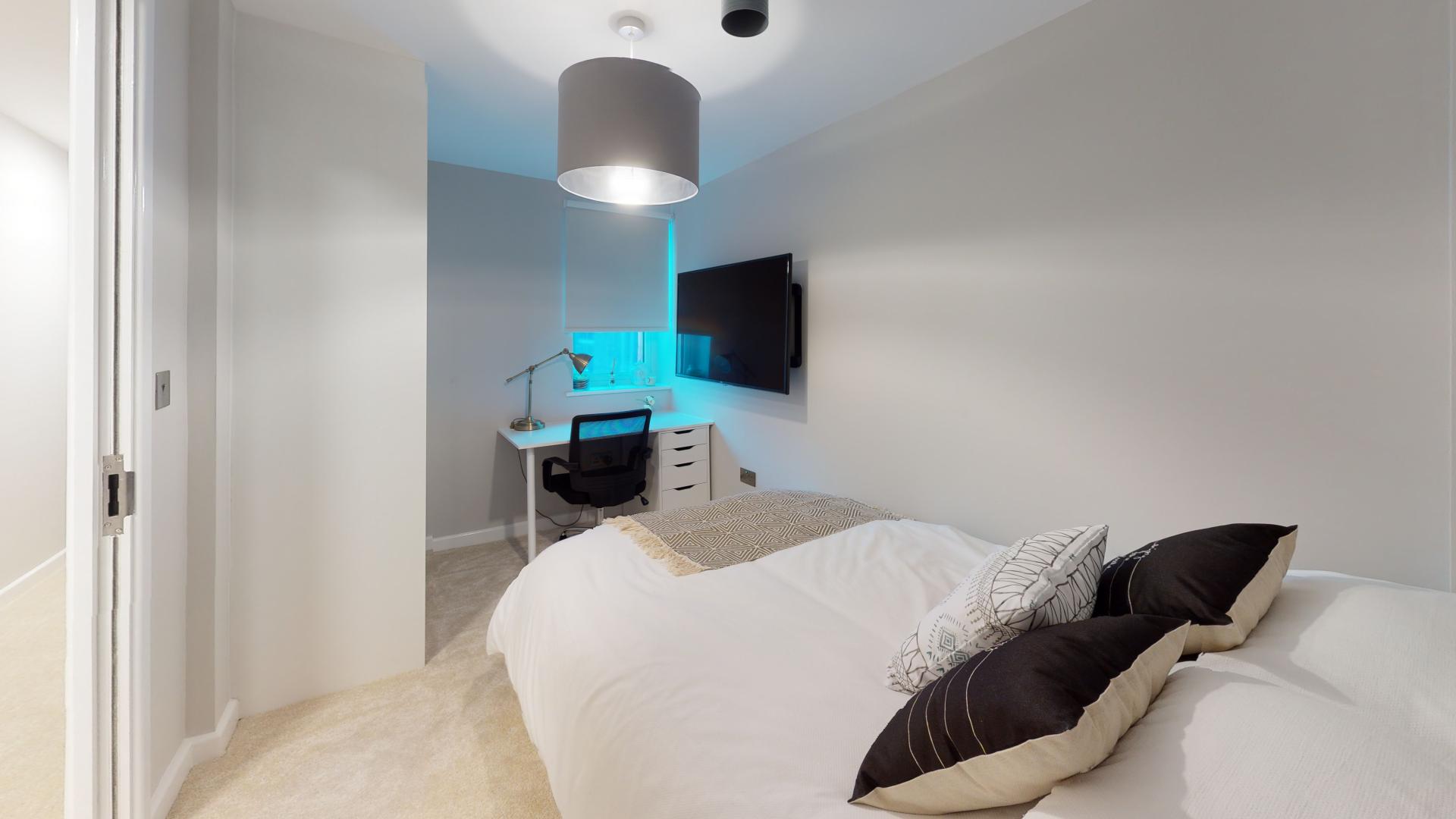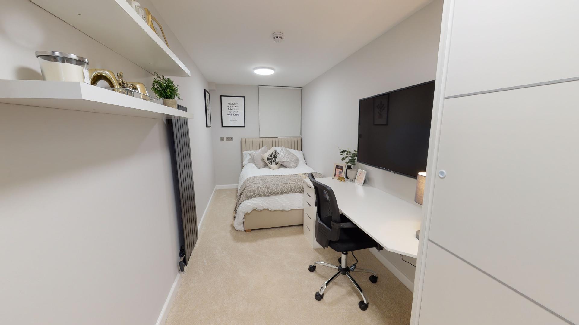 - Bedroom furniture: bed, desk, desk chair, wardrobe, and drawers