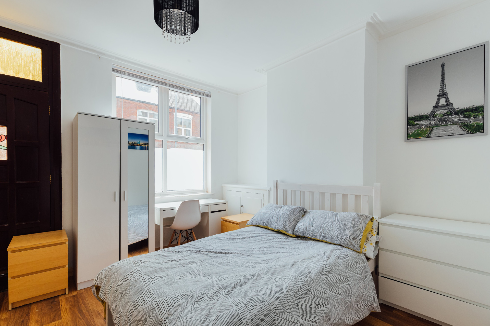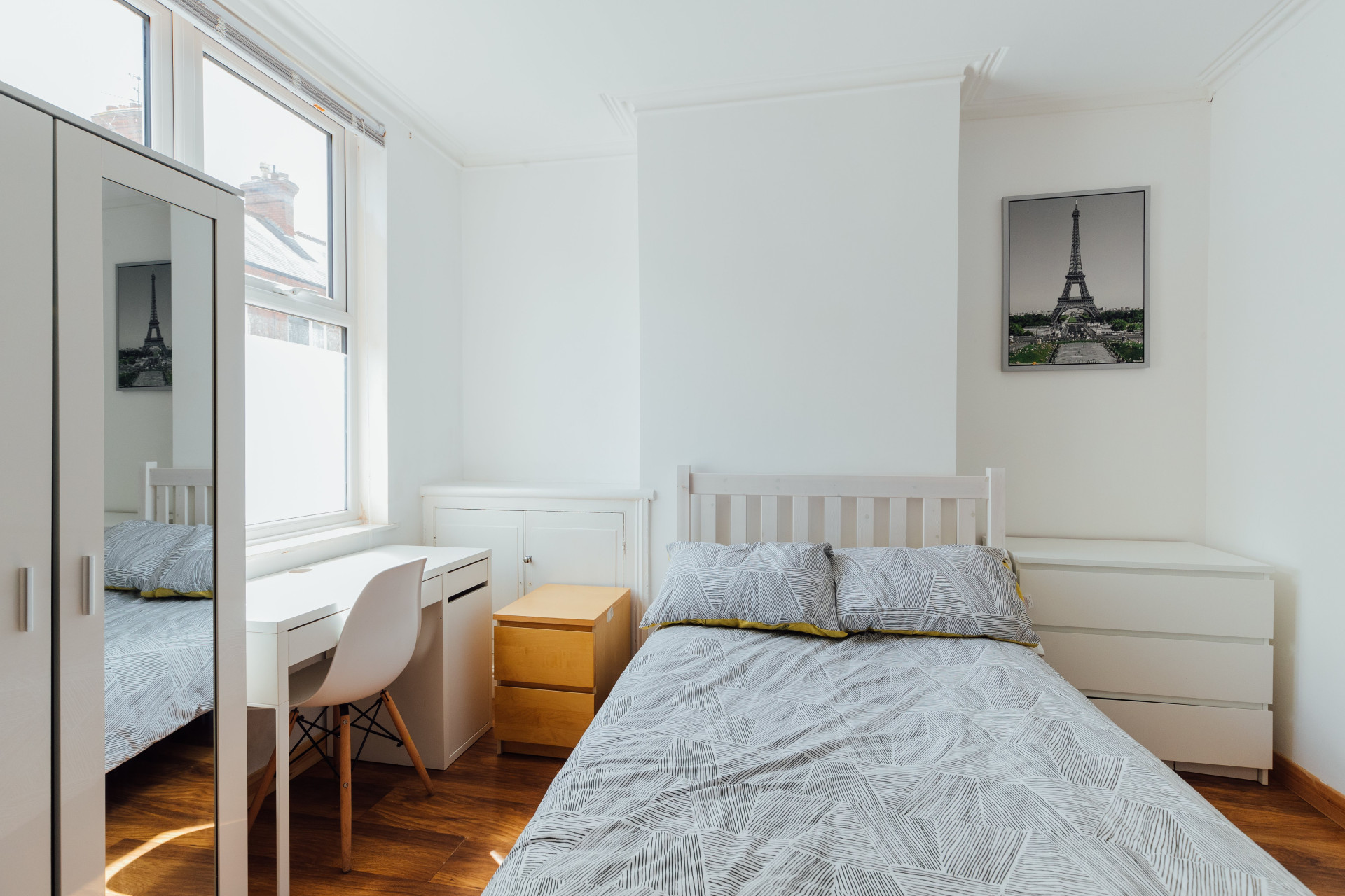 - Bedroom furniture: bed, desk, desk chair, wardrobe, and drawers