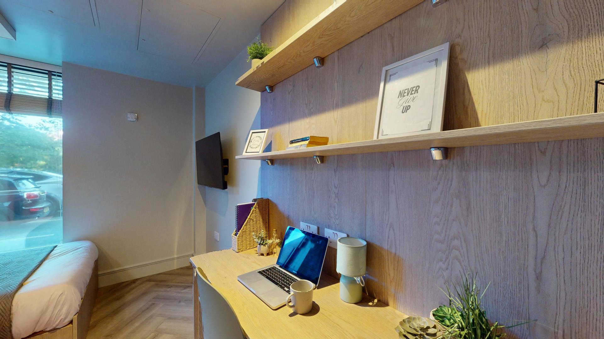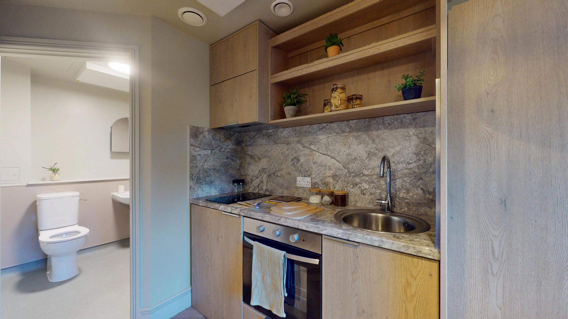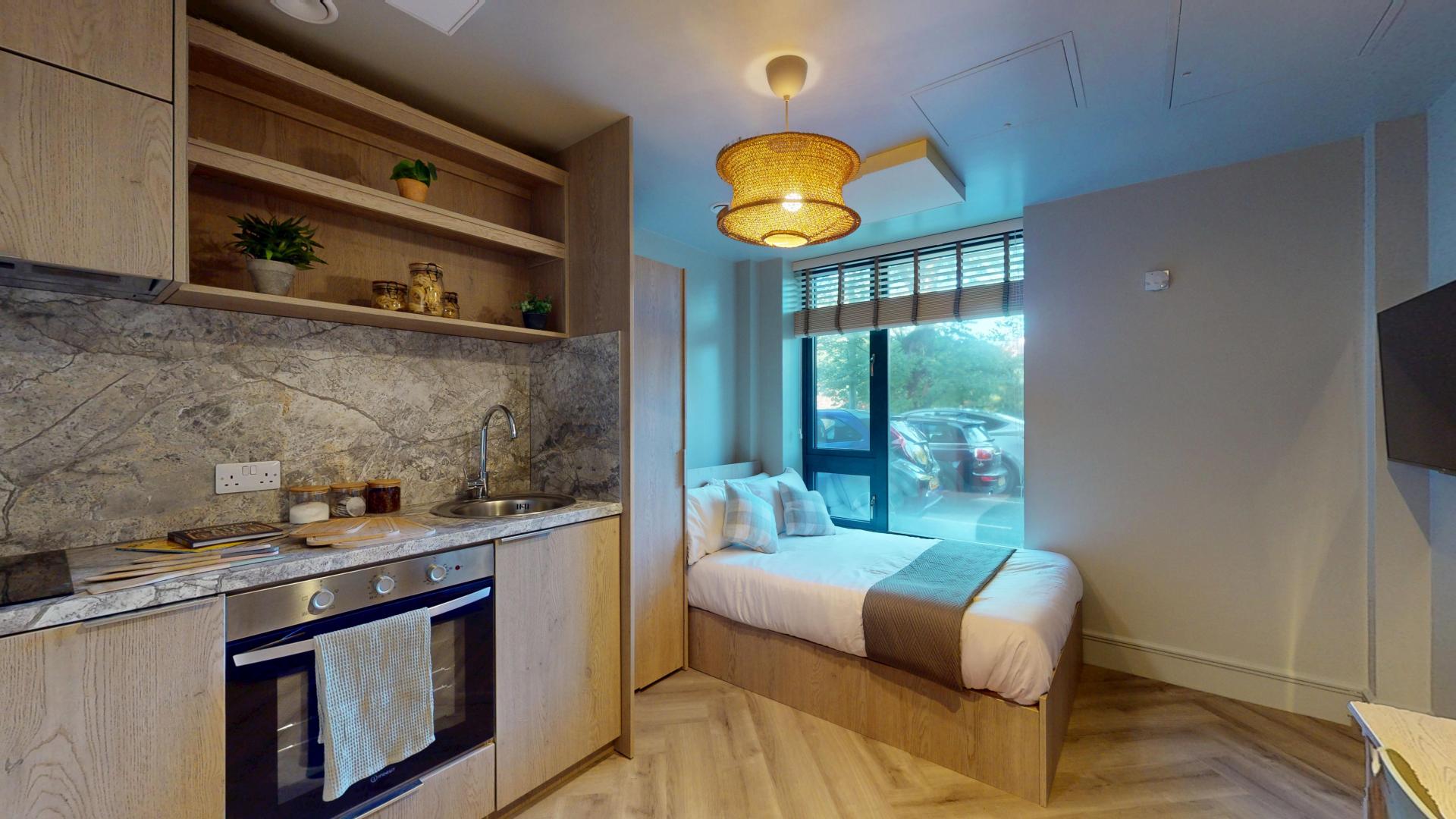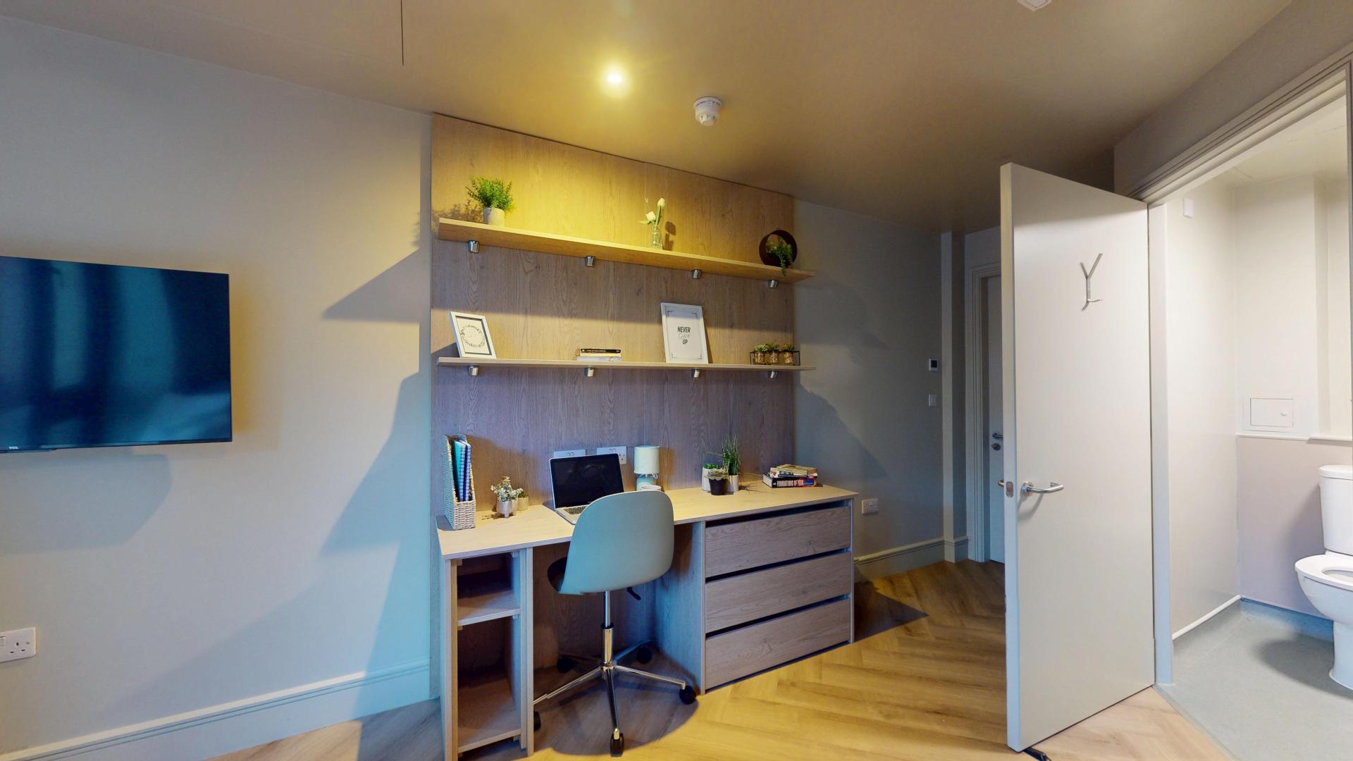 Designed with practicality and comfort in mind, the studio features a private ensuite bathroom and a fully equipped kitchen, creating a complete living space ideal for focused study and relaxation. With high-quality finishes and contemporary design throughout, this flat offers a stylish and hassle-free student lifestyle in a vibrant and central location.