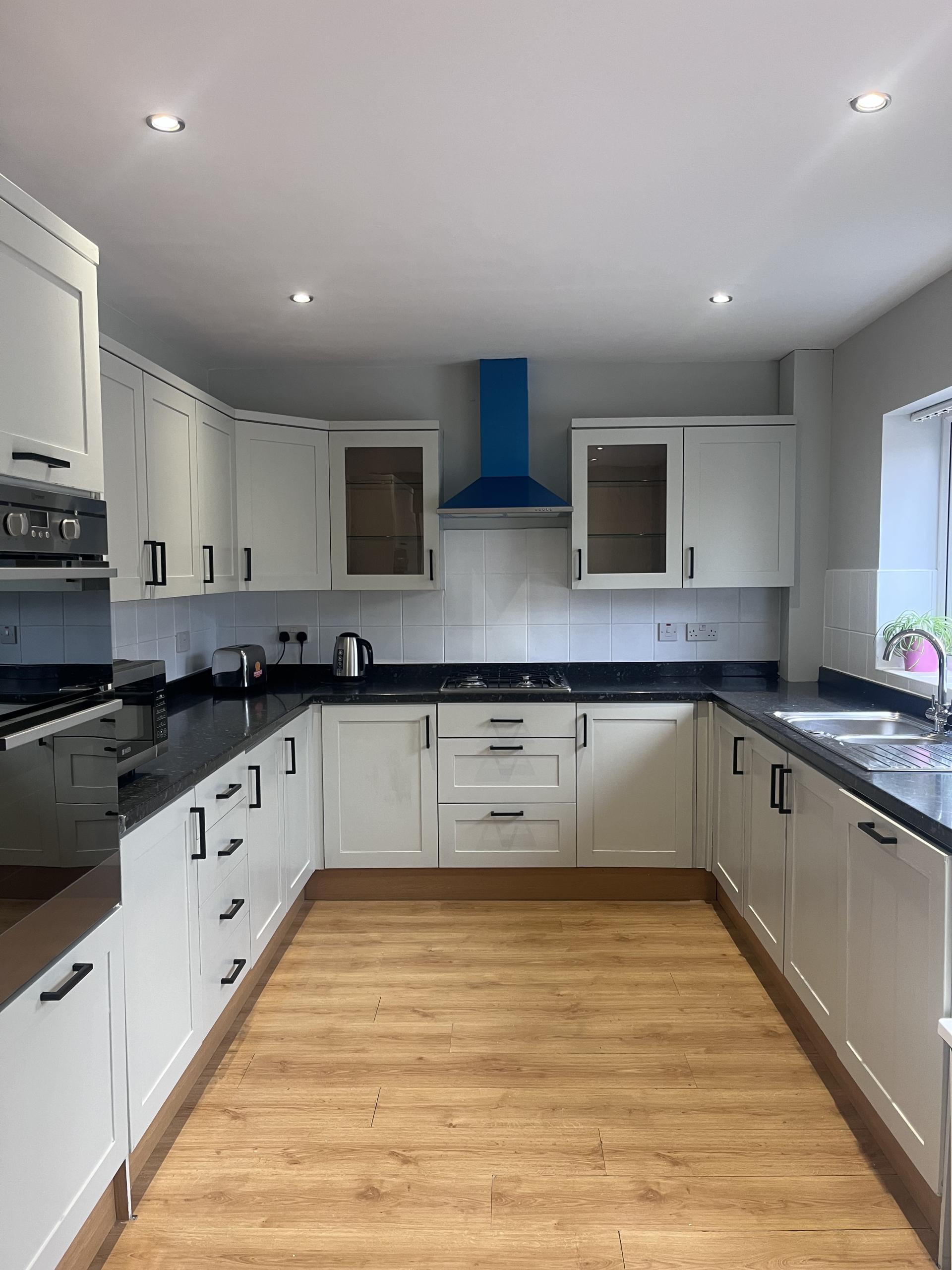 Modern kitchen with oven hob fridge freezer microwave and washing machine