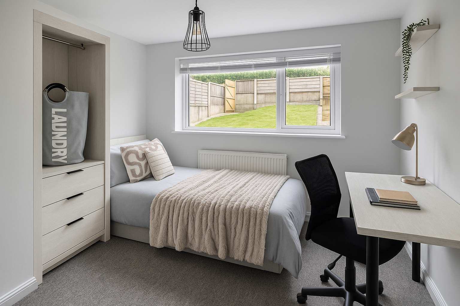- Bedroom furniture: bed, desk, desk chair, wardrobe, and drawers