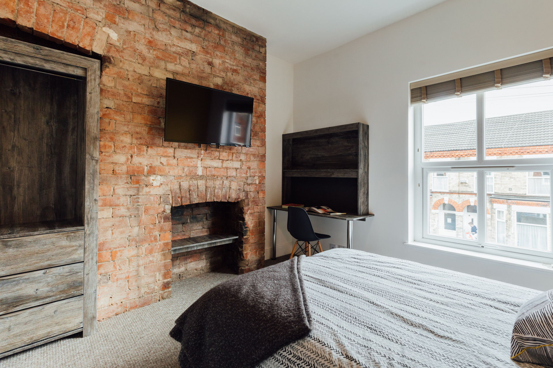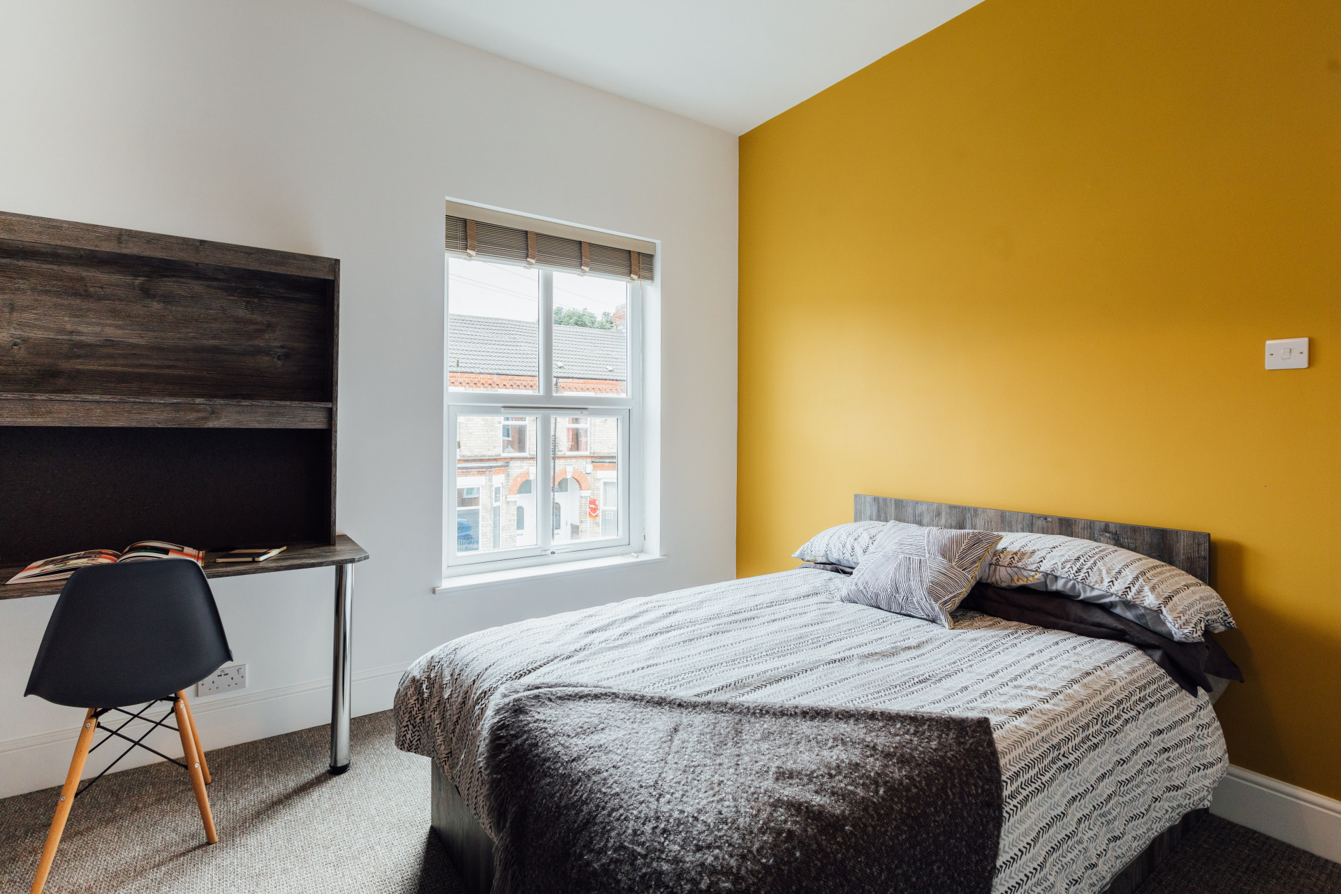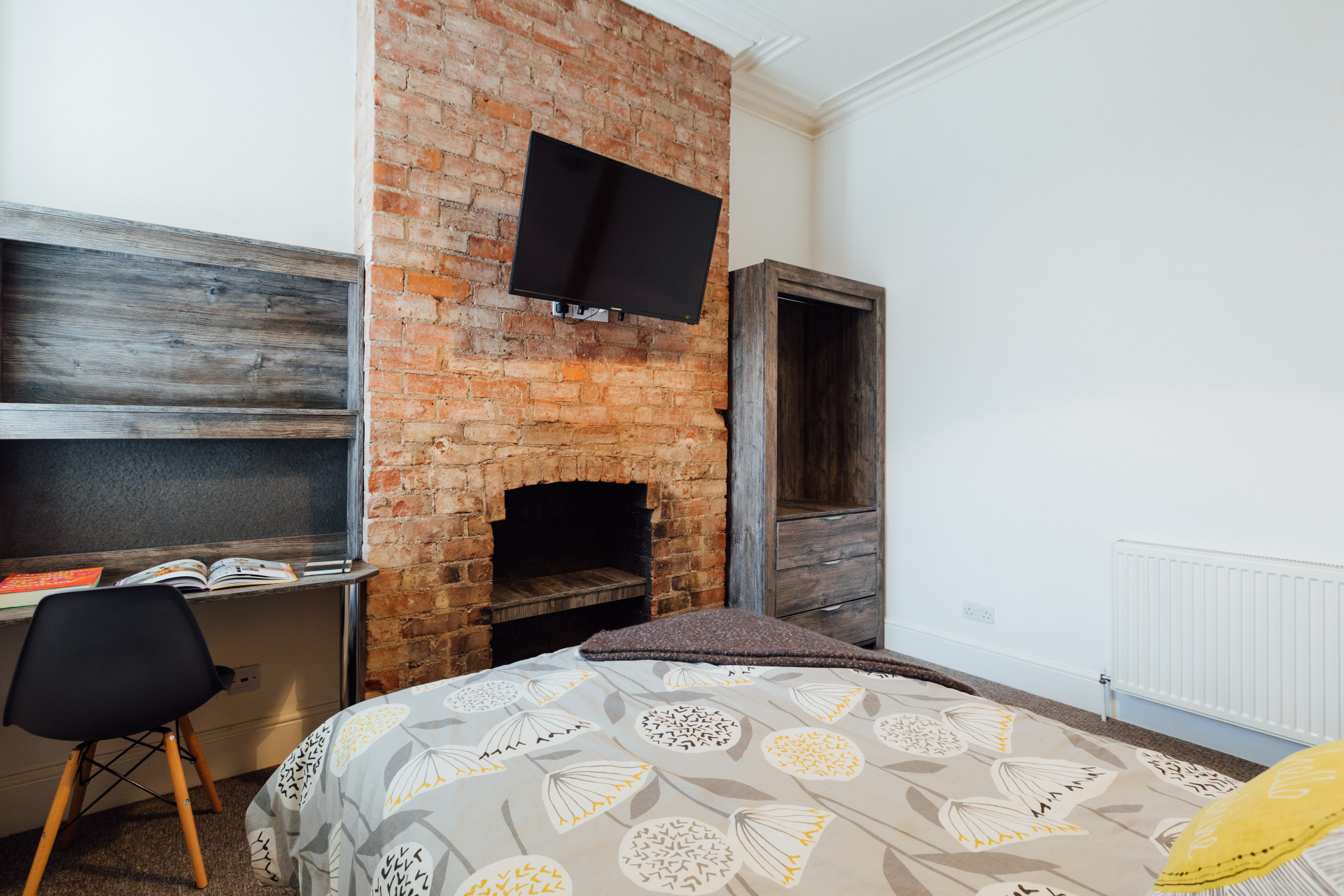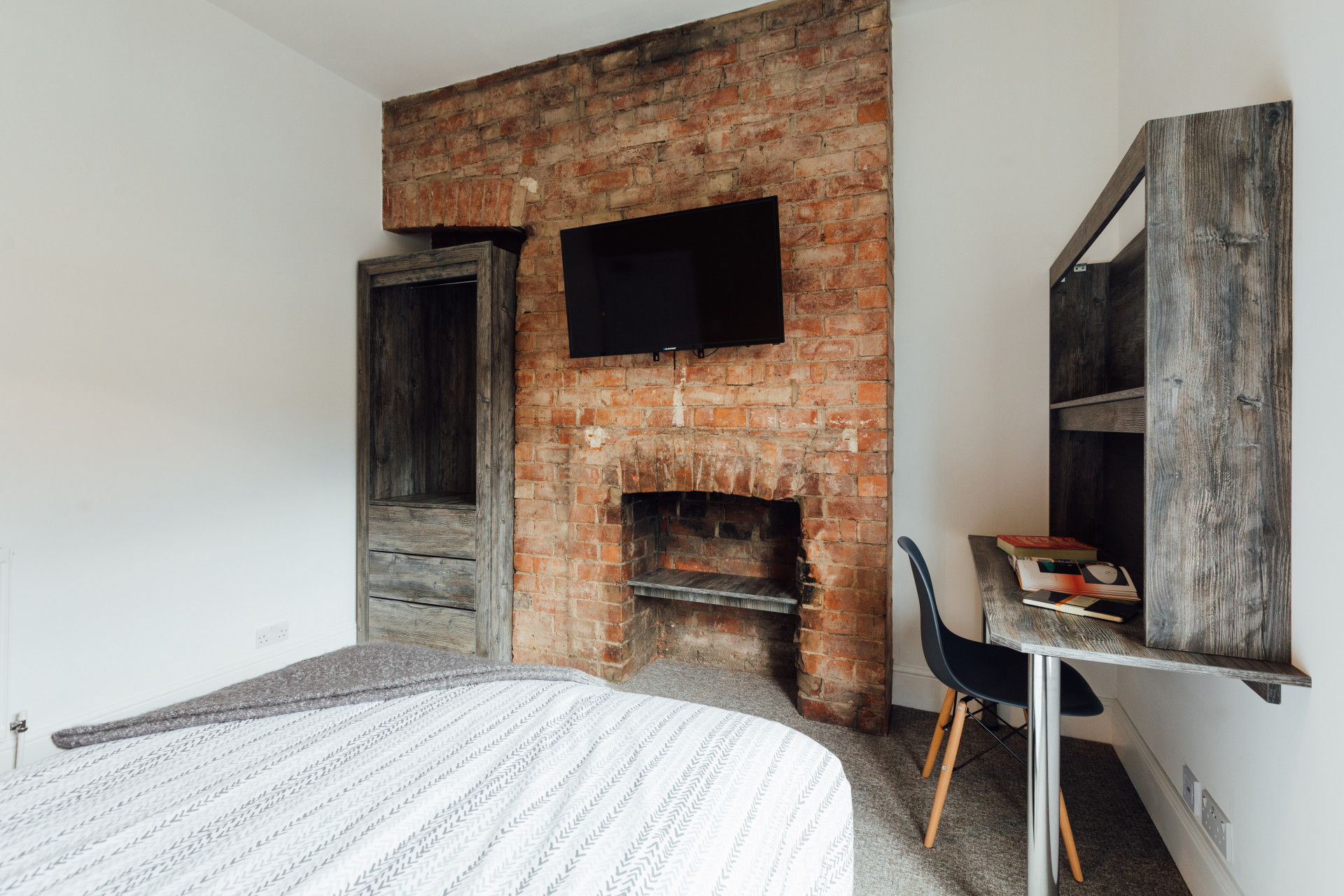 - Bedroom furniture: bed, desk, desk chair, wardrobe, and drawers