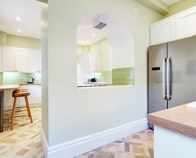 - Well-equipped kitchen: includes modern appliances, a breakfast bar, and an American-style fridge freezer