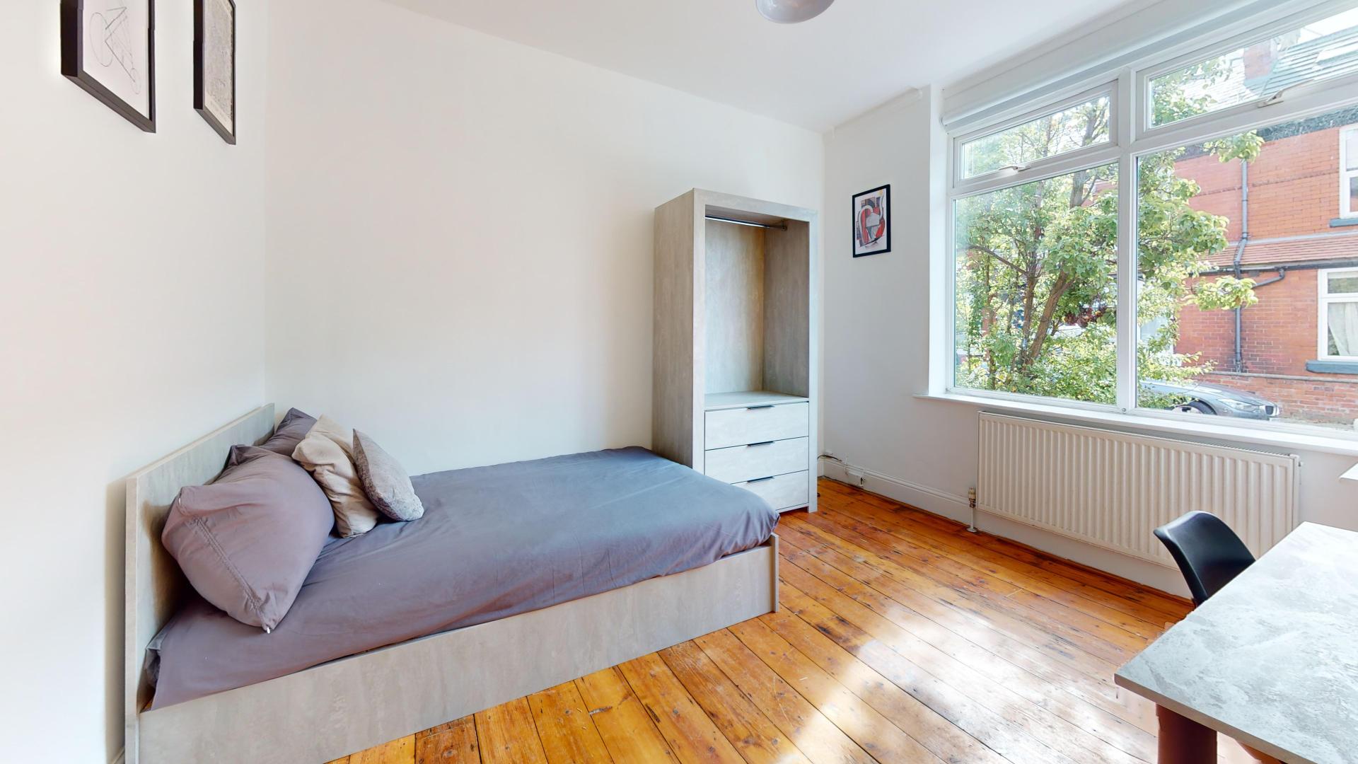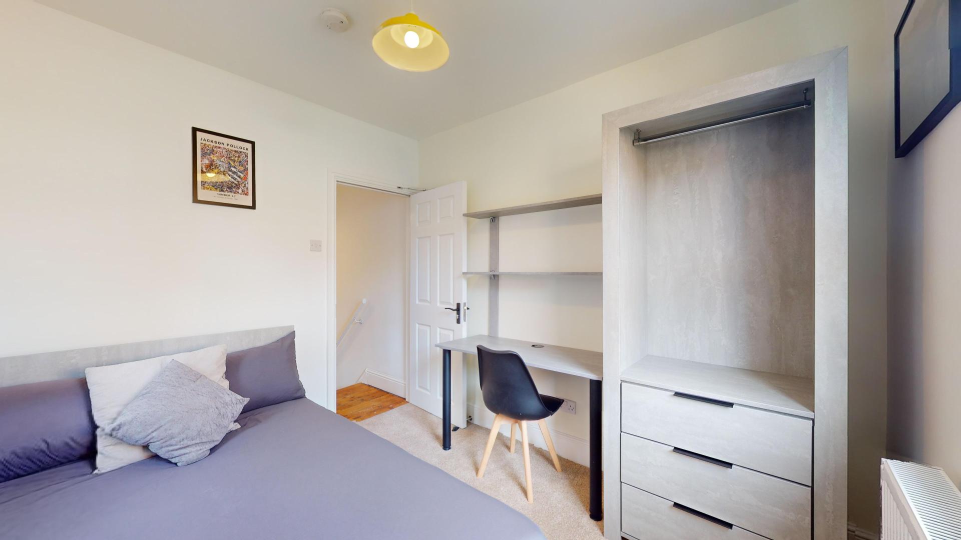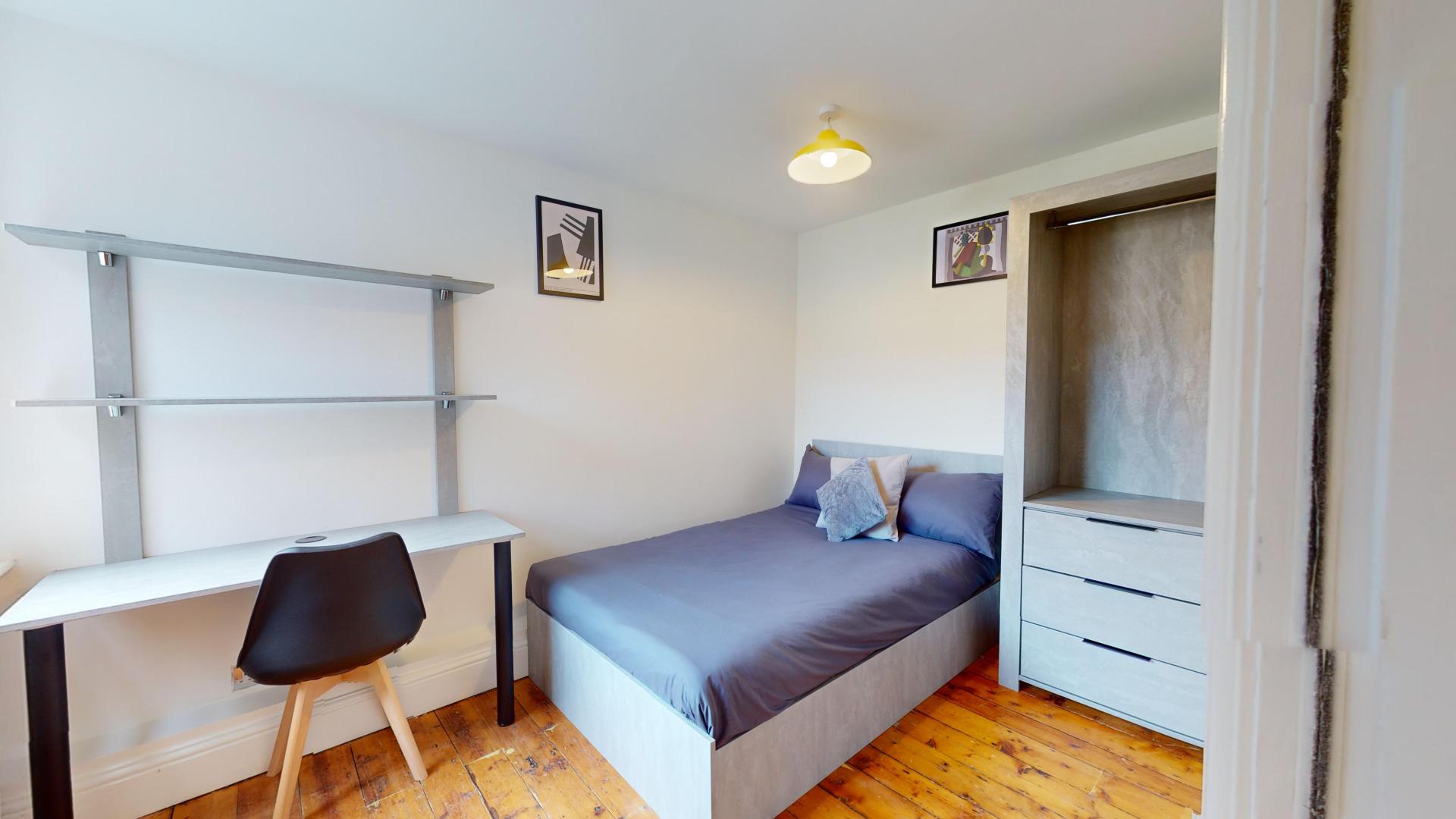 - Bedroom furniture: bed, desk, desk chair, wardrobe, and drawers