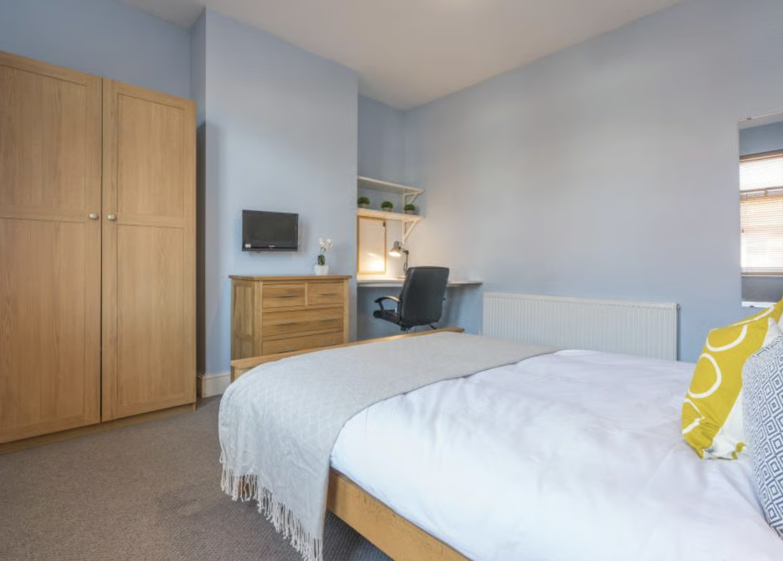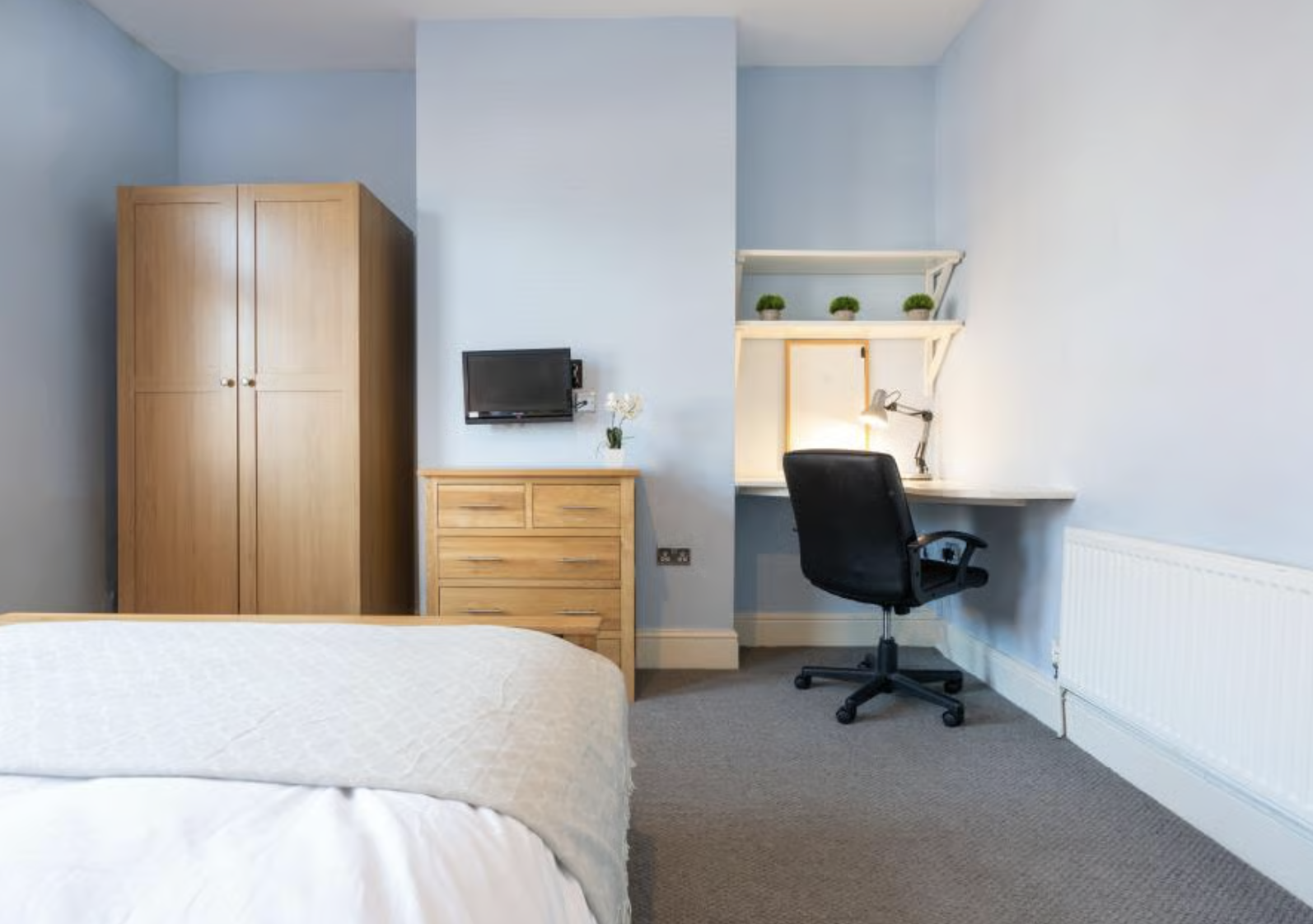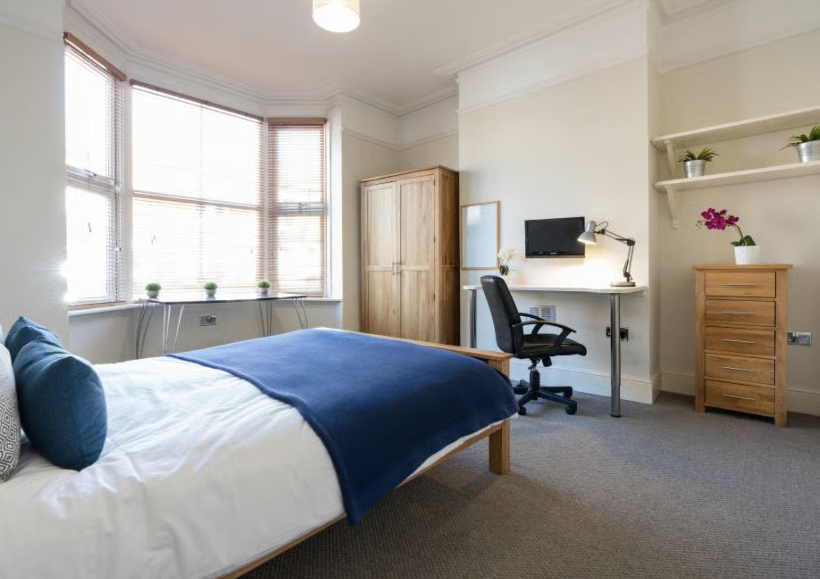- Bedroom furniture: bed, desk, desk chair, wardrobe, and drawers