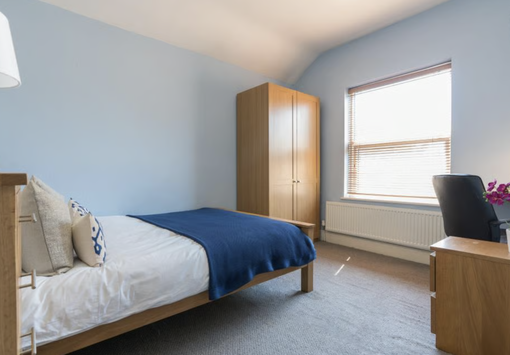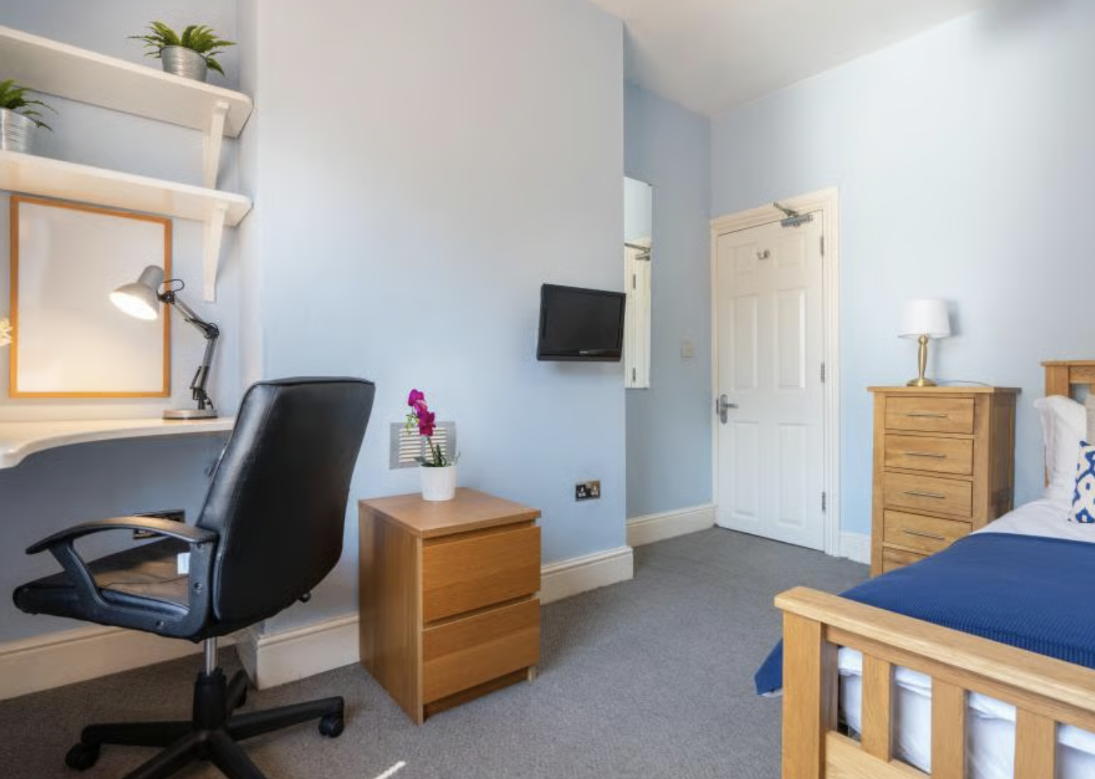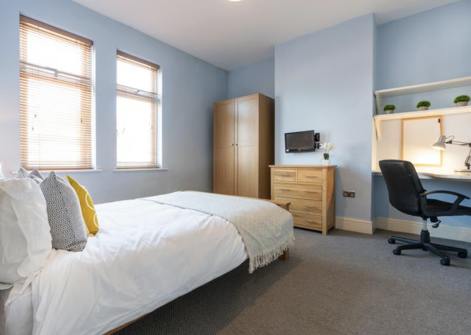 - Bedroom furniture: bed, desk, desk chair, wardrobe, and drawers